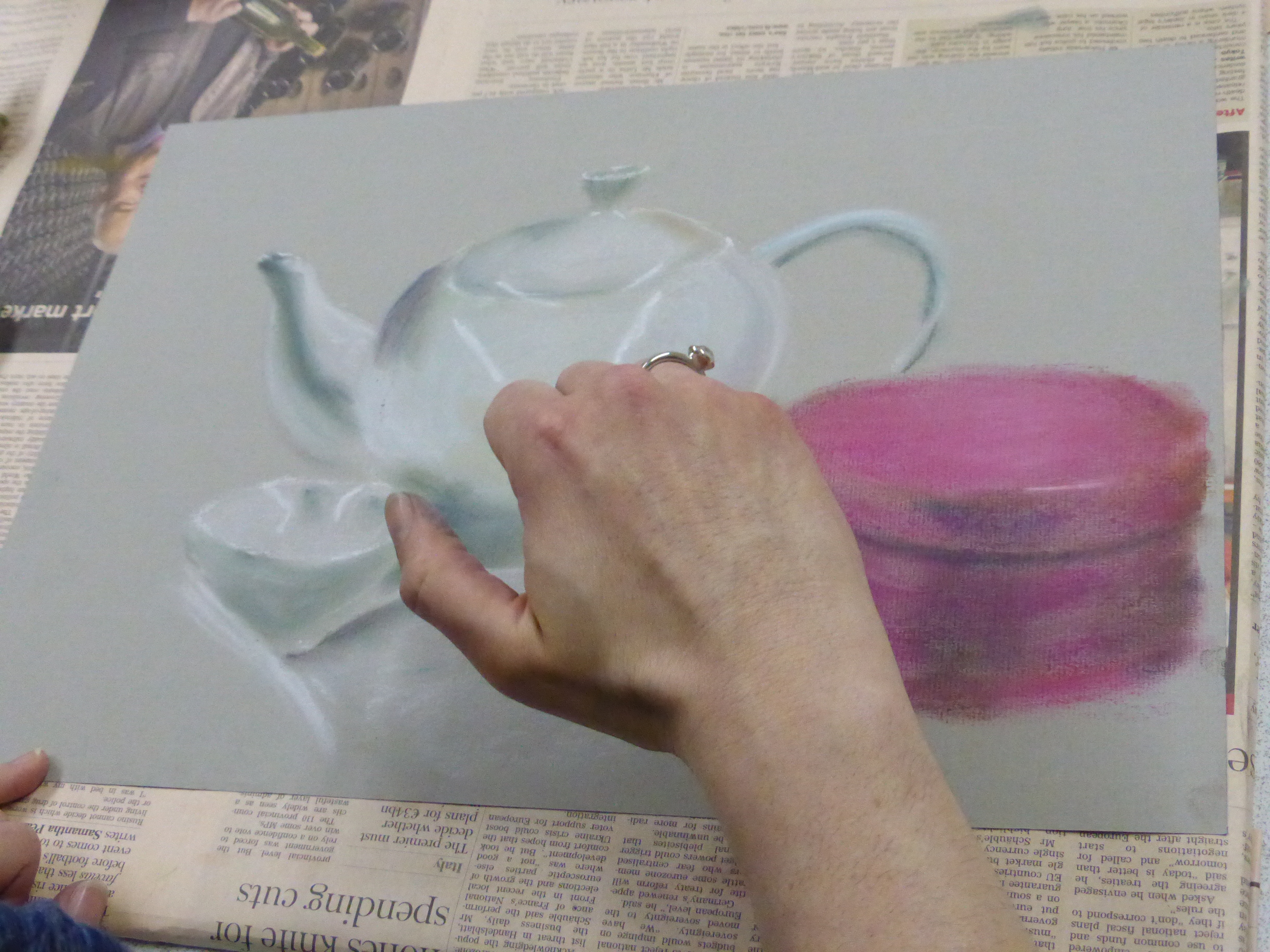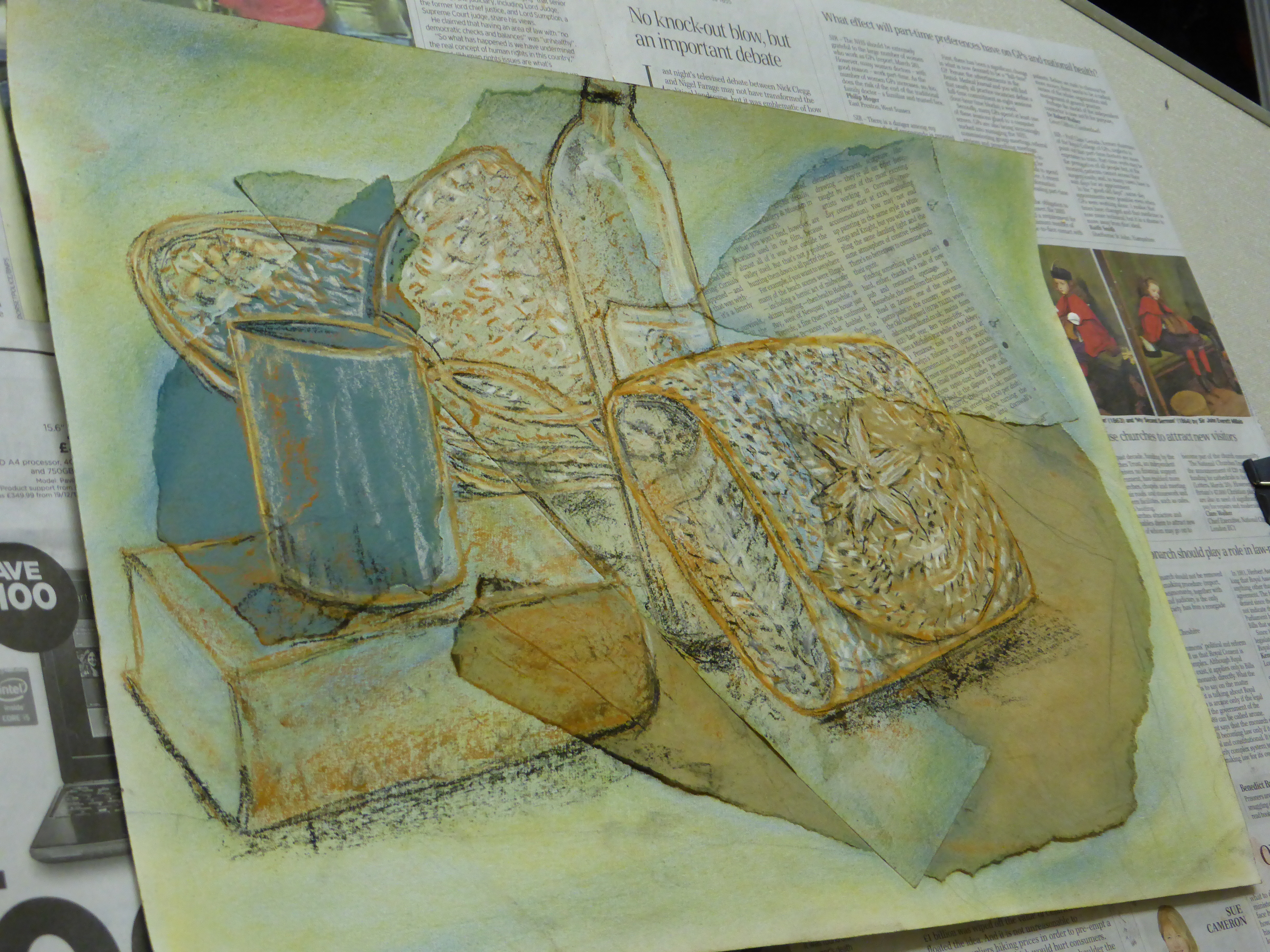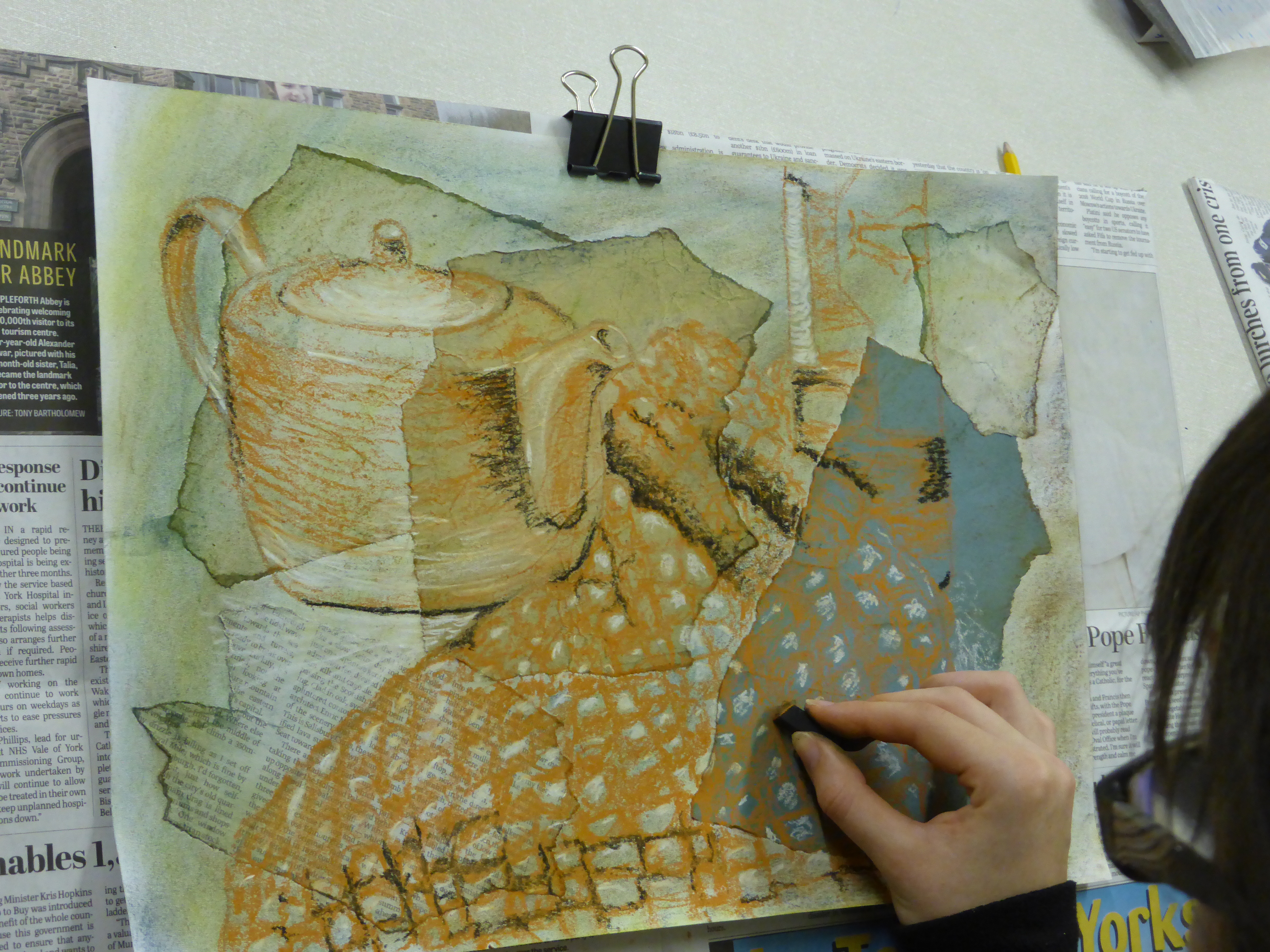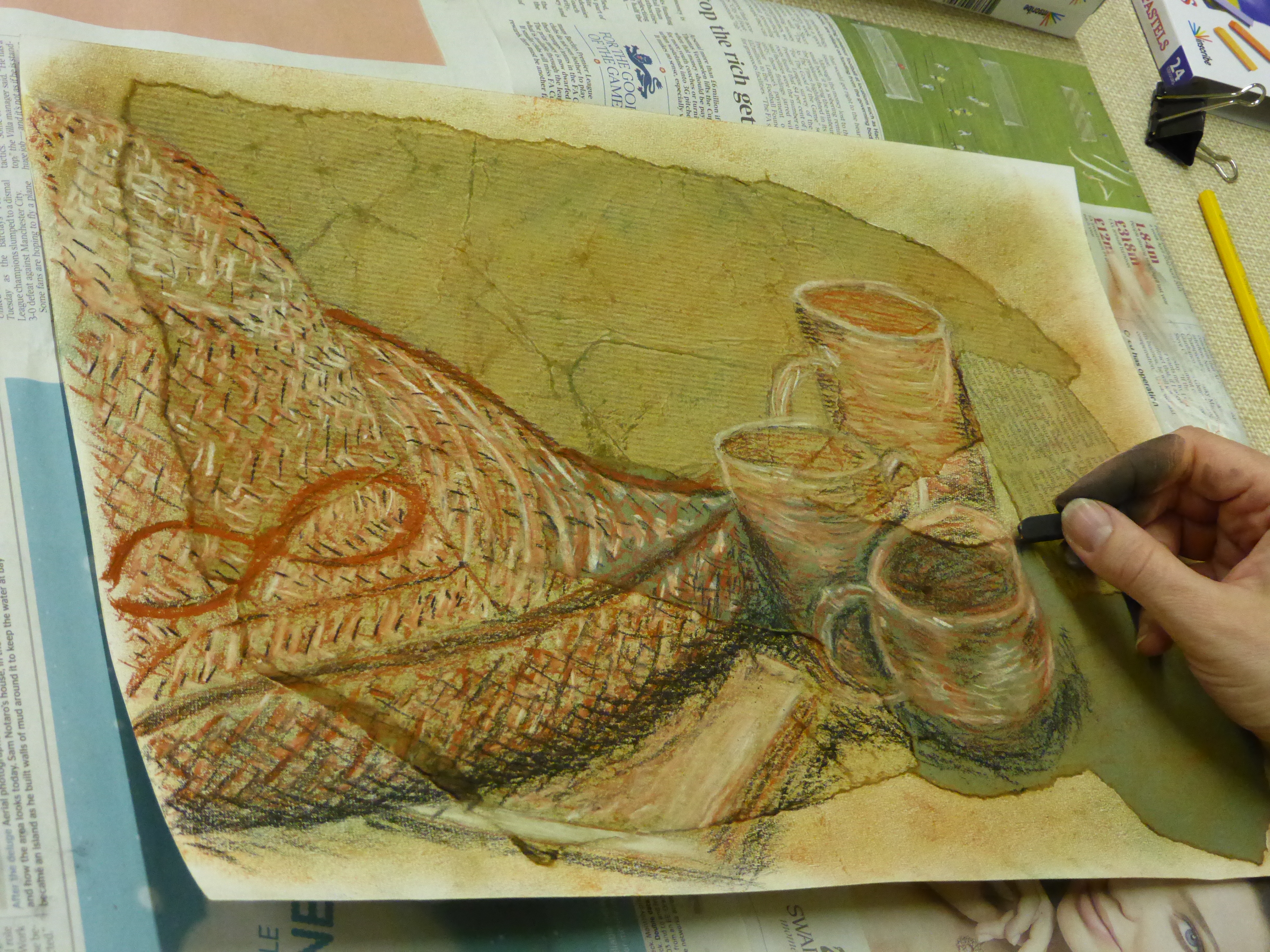 This week we forgot about colour for a while and focused on using just 3 pastels to create all the different tones. The ripped paper surfaces you prepared created really interesting backgrounds for this more sketchy style. Not easy to get the hang of at first but the results were some fantastic drawings.