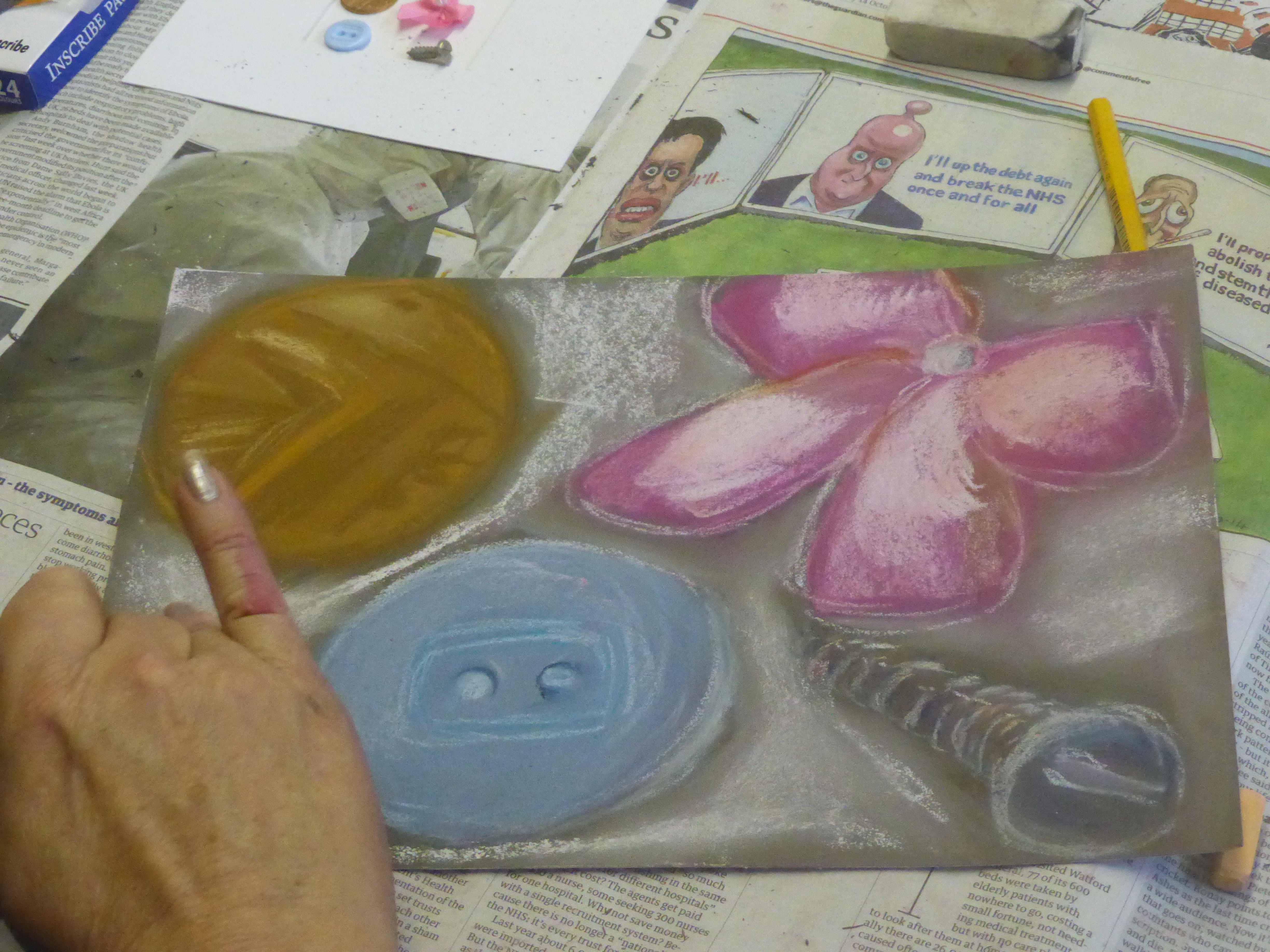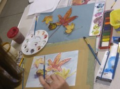 This week the drawing class did a series of timed drawings to work on their speed and to help work out how to build up a drawing from just a quick sketch. The pastel class worked on scale and produced some really vibrant drawings of enlarged everyday objects. The watercolour class took advantage of all the beautiful Autumn leaves we have at the moment and produced some great paintings with loads of colour. I can see real improvements in everyone’s work now. Think back to week one and see for yourself how much you’ve improved. Well done everyone!