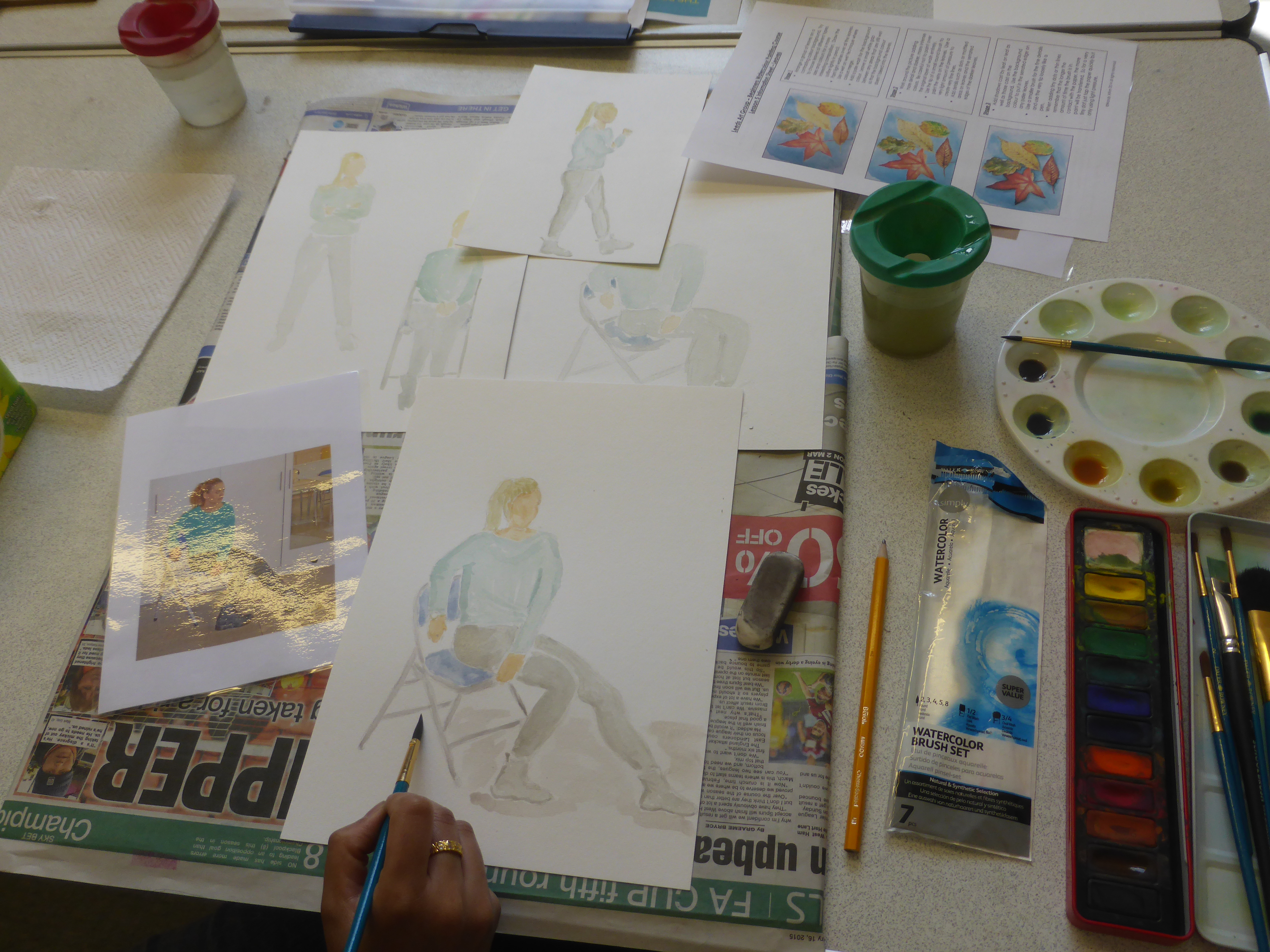 This week the Drawing and Pastel classes worked on self-portraits and wow – what fantastic results! You all started with the same basic guidelines and then made alterations to turn them into your own individual portraits. A lot of people are a little apprehensive about self-portraits at first but by the end of the lesson you really got it and I think for many of you this was your best work yet. The Watercolour class used this weeks lesson to try out some figure painting techniques and did some 5 minute paintings to explore a much freer, sketchy way of working. You all did some great paintings and this will be good practise for next week when all 3 classes have a life model coming in to pose for us. I can’t wait to see what you’re all going to produce next week.