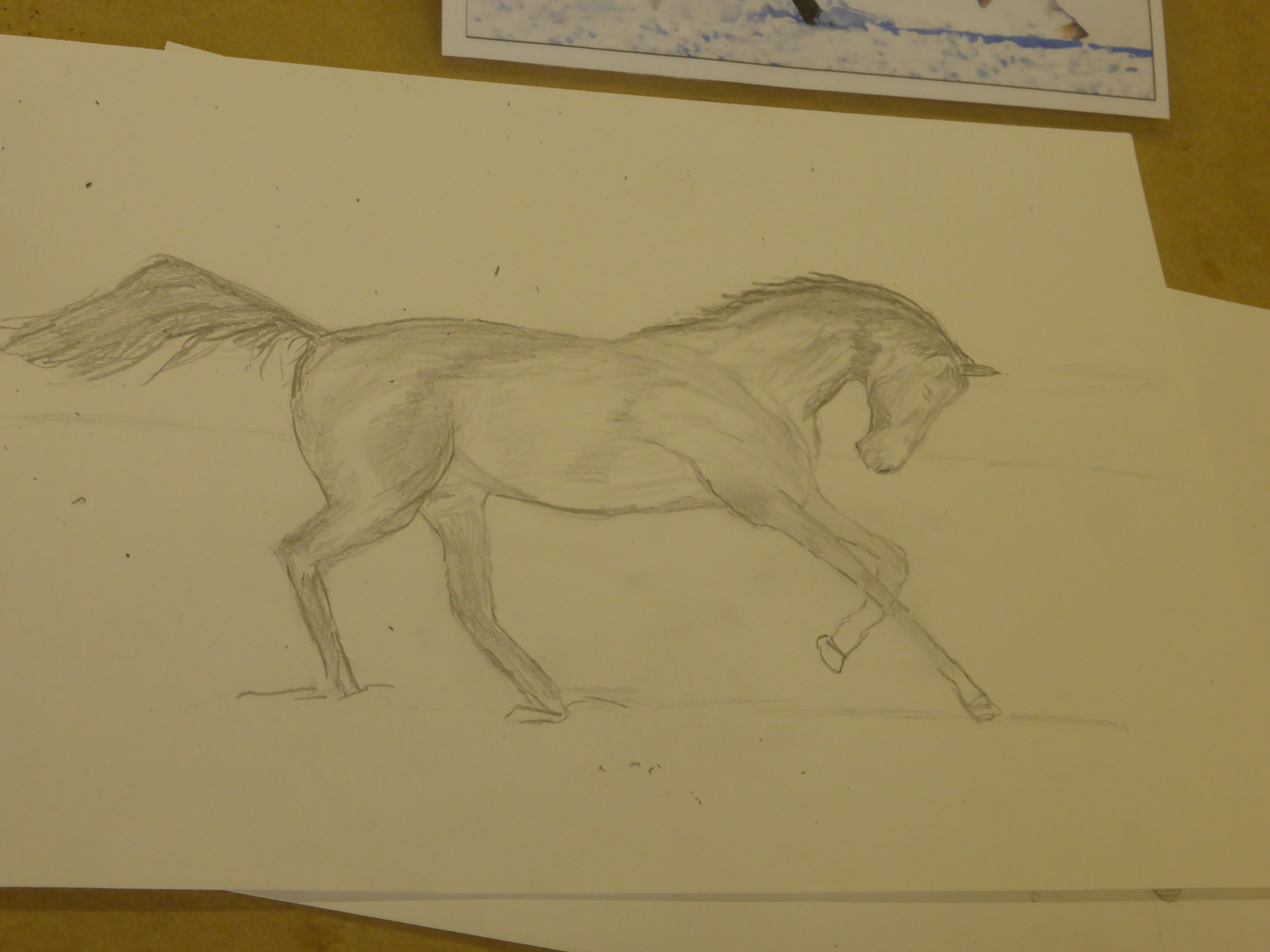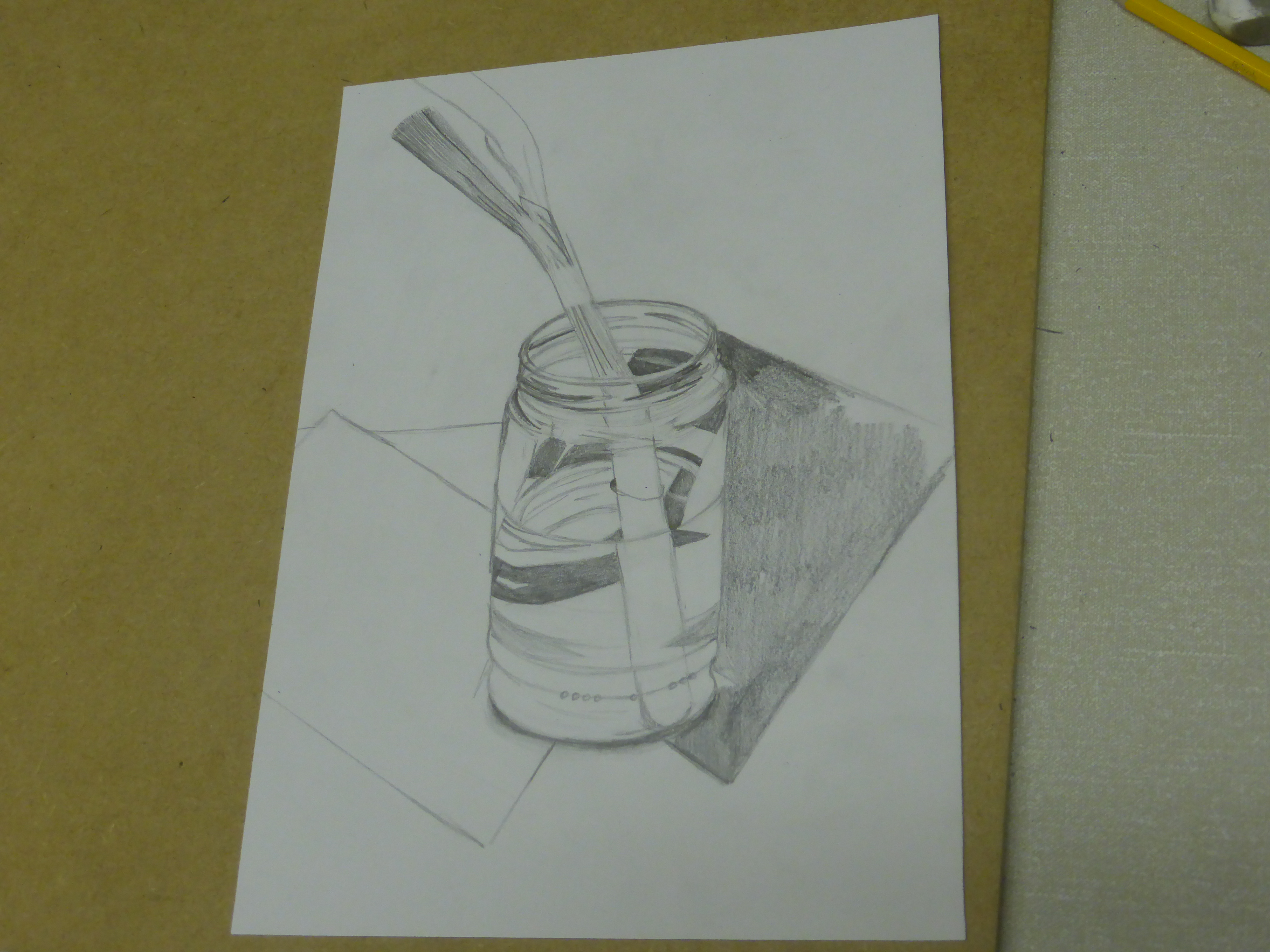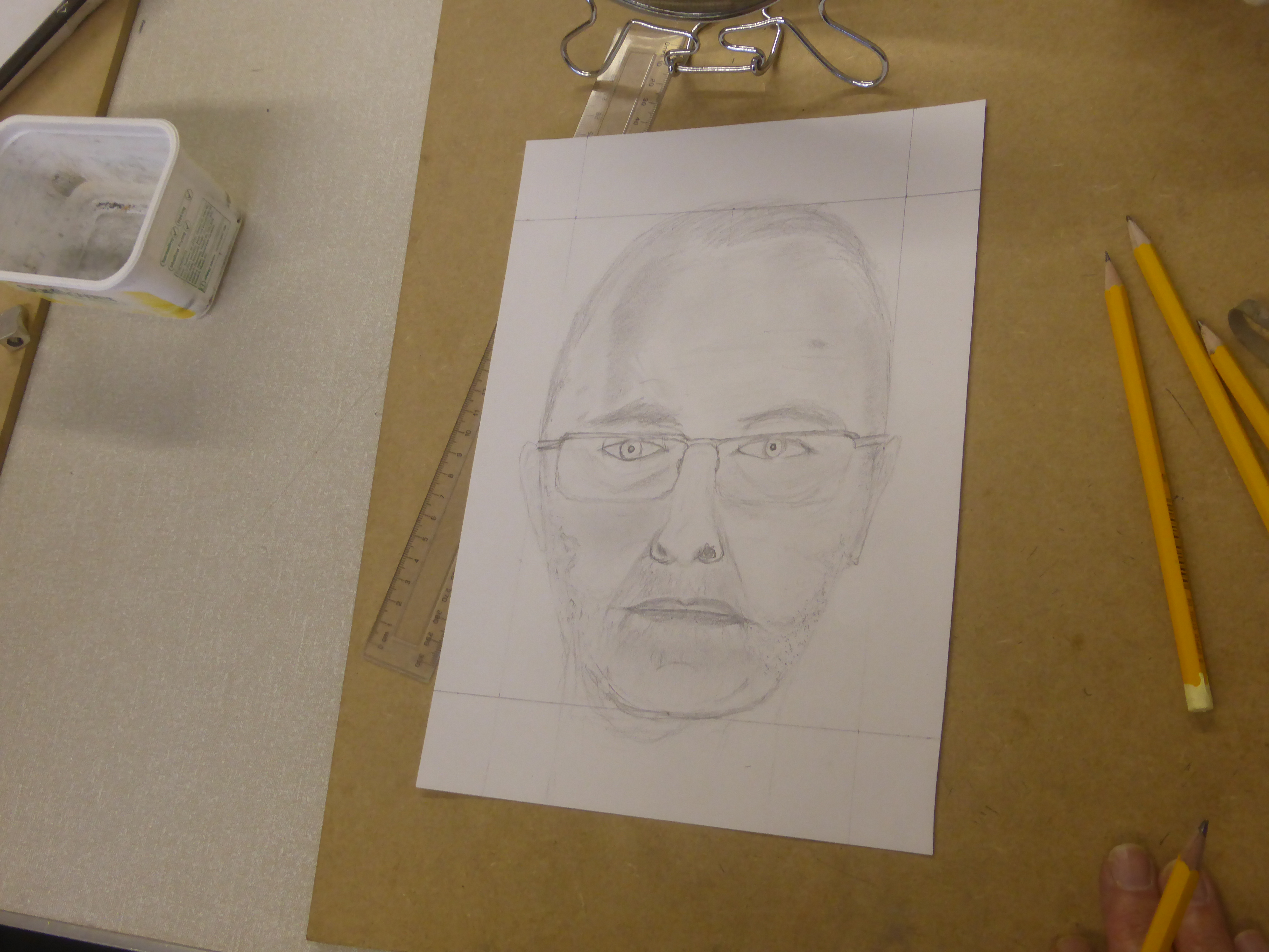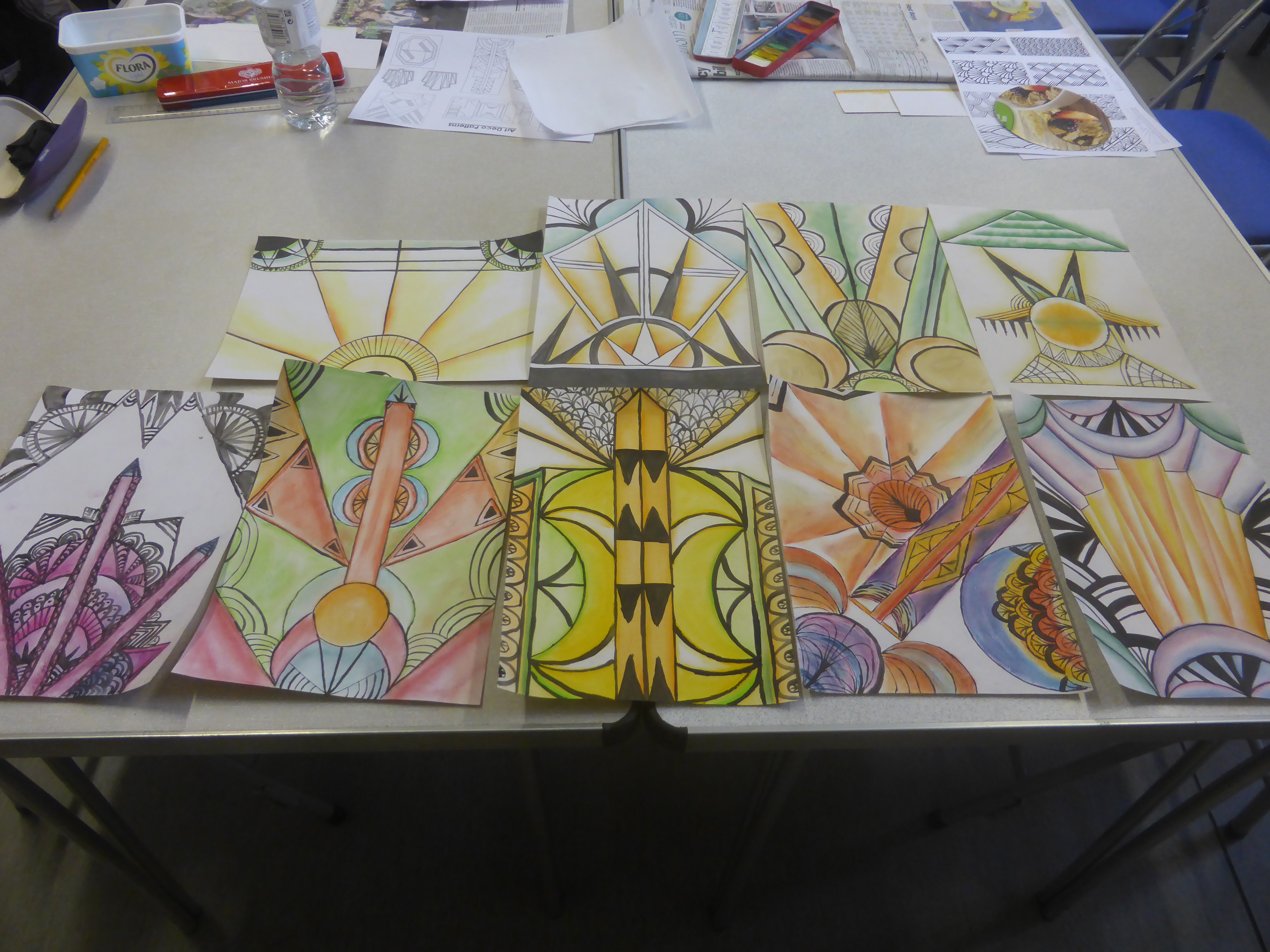 Meanwhile you have all been busy back in class this week after a week off. I didn’t go easy on you in your first week back either. I threw some really tough subjects at you: horses, self-portraits, water/glass distortion and geometric Art Deco patterns. As always, you came up with the goods. I hope you’re going to show some of them off in the exhibition.