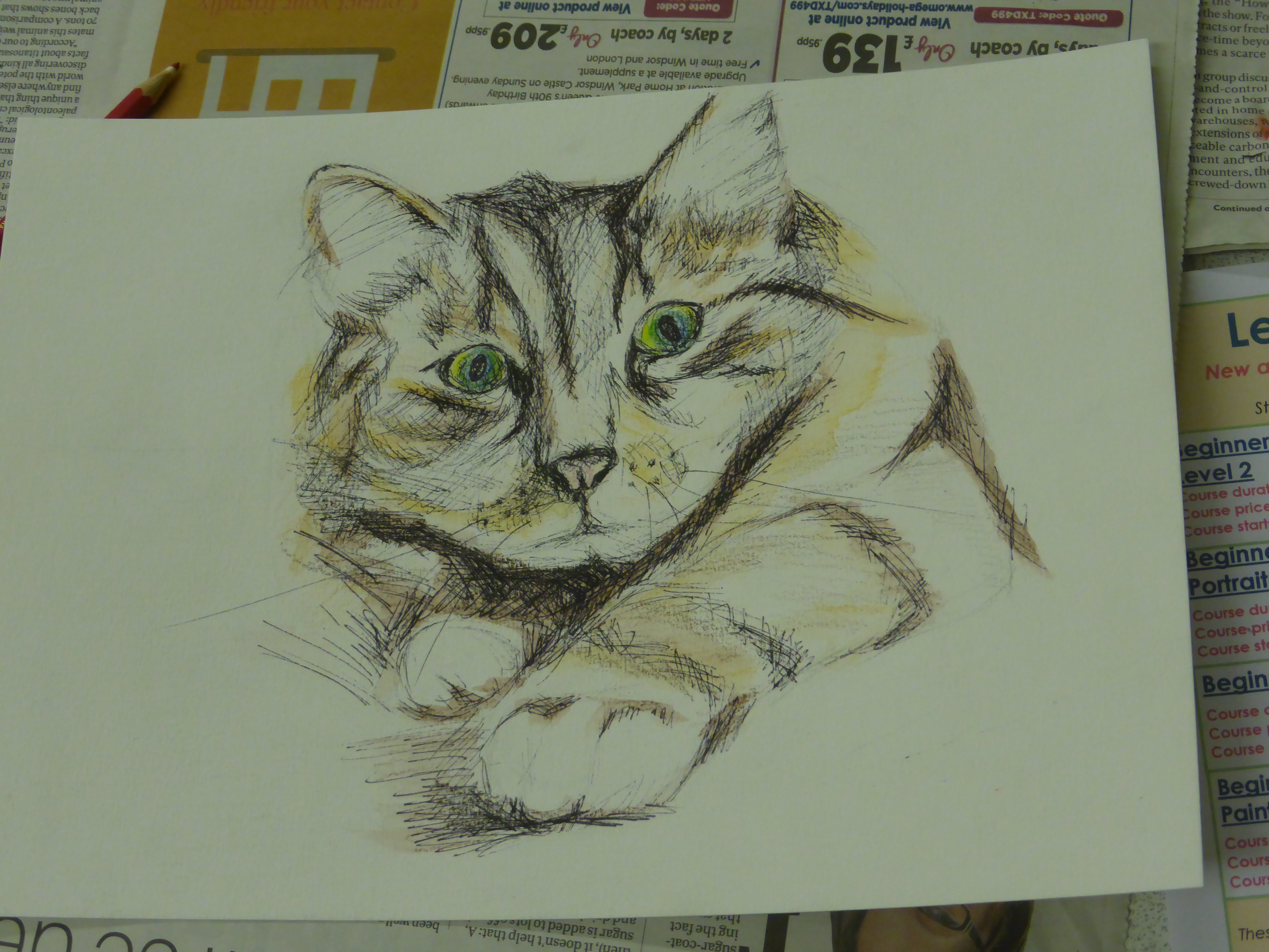 What a great week of drawings! The Pattern course took inspiration from Japanese prints and experimented with colour mixing. The Drawing course used different types of pen with a cross-hatching technique and worked on a range of backgrounds to create interesting effects. It was cat week for the Animal Portraiture course who created fantastic pen drawings with subtle colours as a background. For the Pastel course is was self-portraits – this task is always met with a certain amount of trepidation but they turned out brilliantly. Well done to everyone!