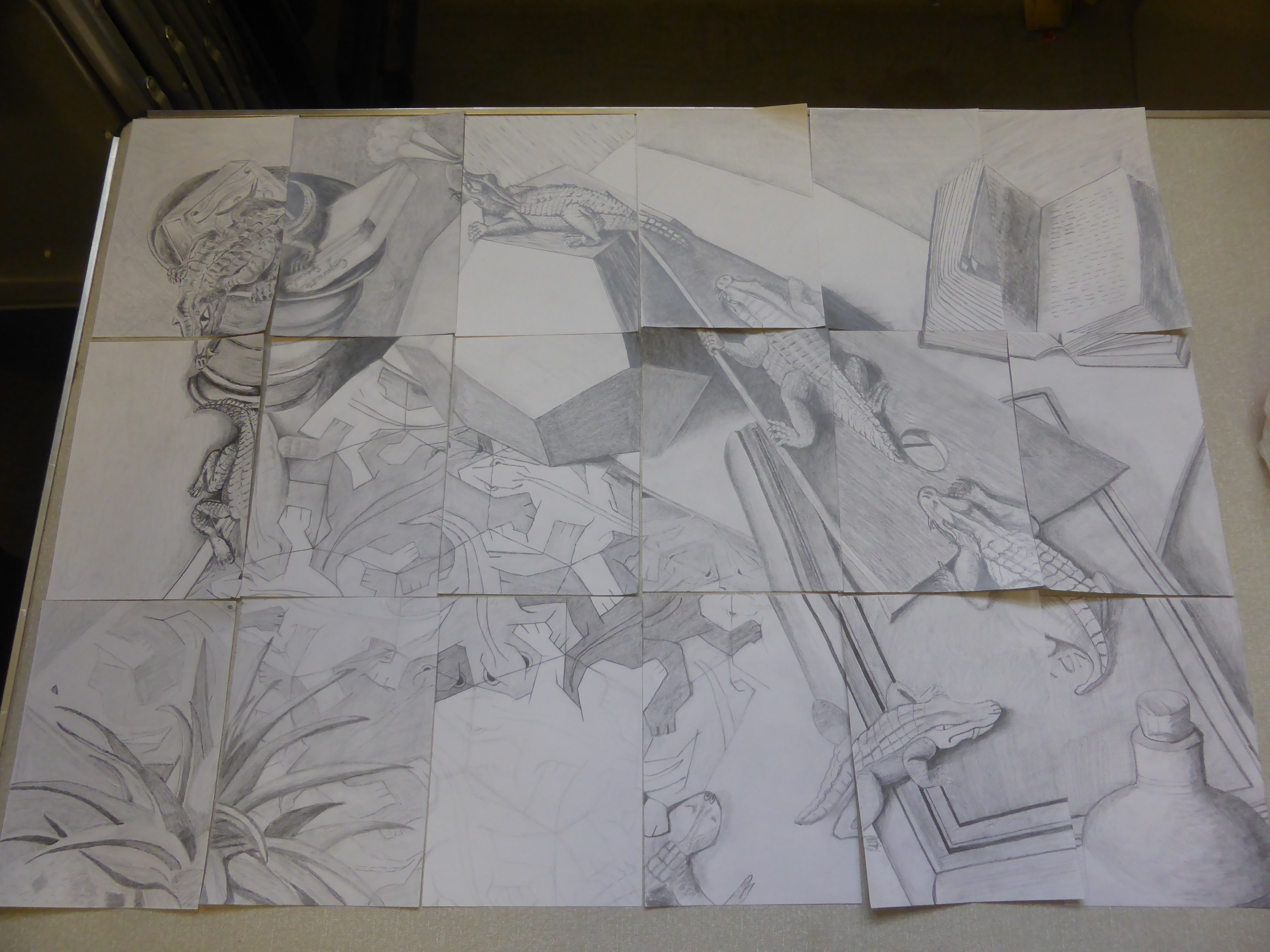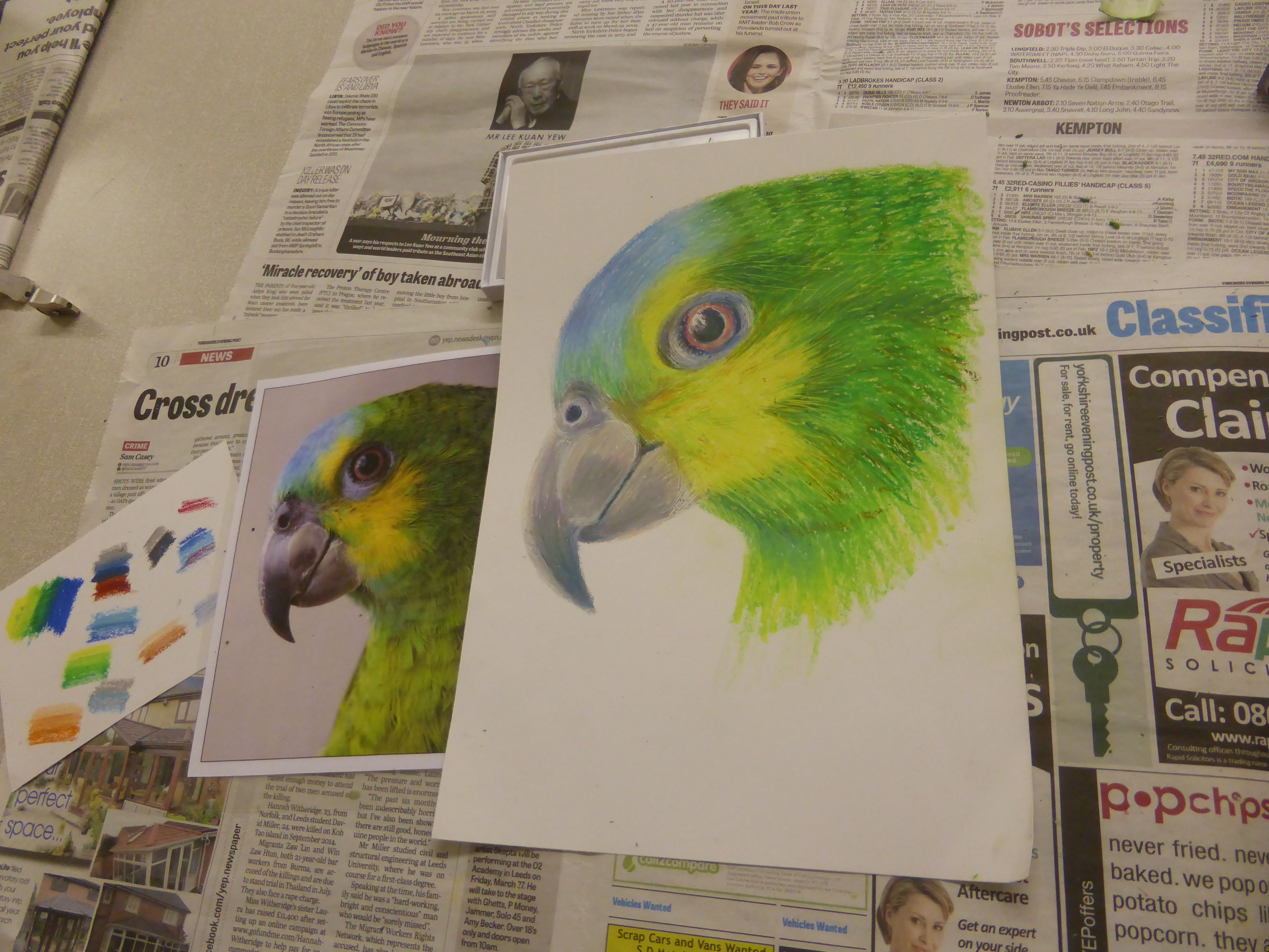 Unfortunately we have now come to the end of this terms courses but you certainly finished with a flourish! The Pattern course used Tunisian ceramics as their source of inspiration this week, creating some fantastic colour combinations. The Drawing course surpassed all my expectations and each person produced an accurate piece of a jigsaw puzzle which fitted together to make one picture. It’s a real testament to how far you’ve come in this course and how good your proportion and shading skills are. In the animal course we finally got to use some brighter colours on a picture of a parrot using oil pastels. This really tested your colour mixing skills, so well done to everyone for being experimental. And lastly, the pastel course had a model this week to pose for them. This was a quicker way of working and allowed you to make several sketches whilst practising your proportion.