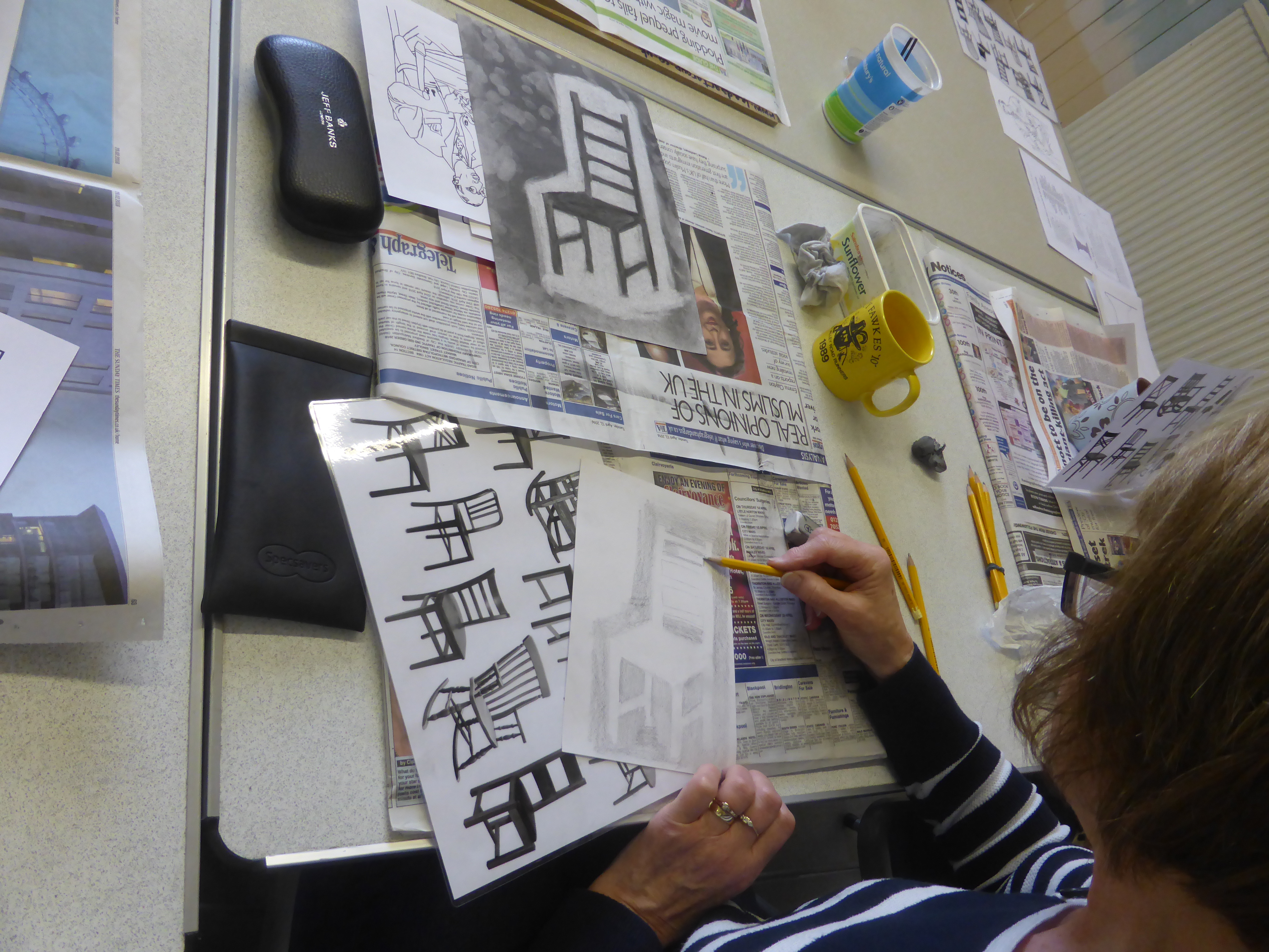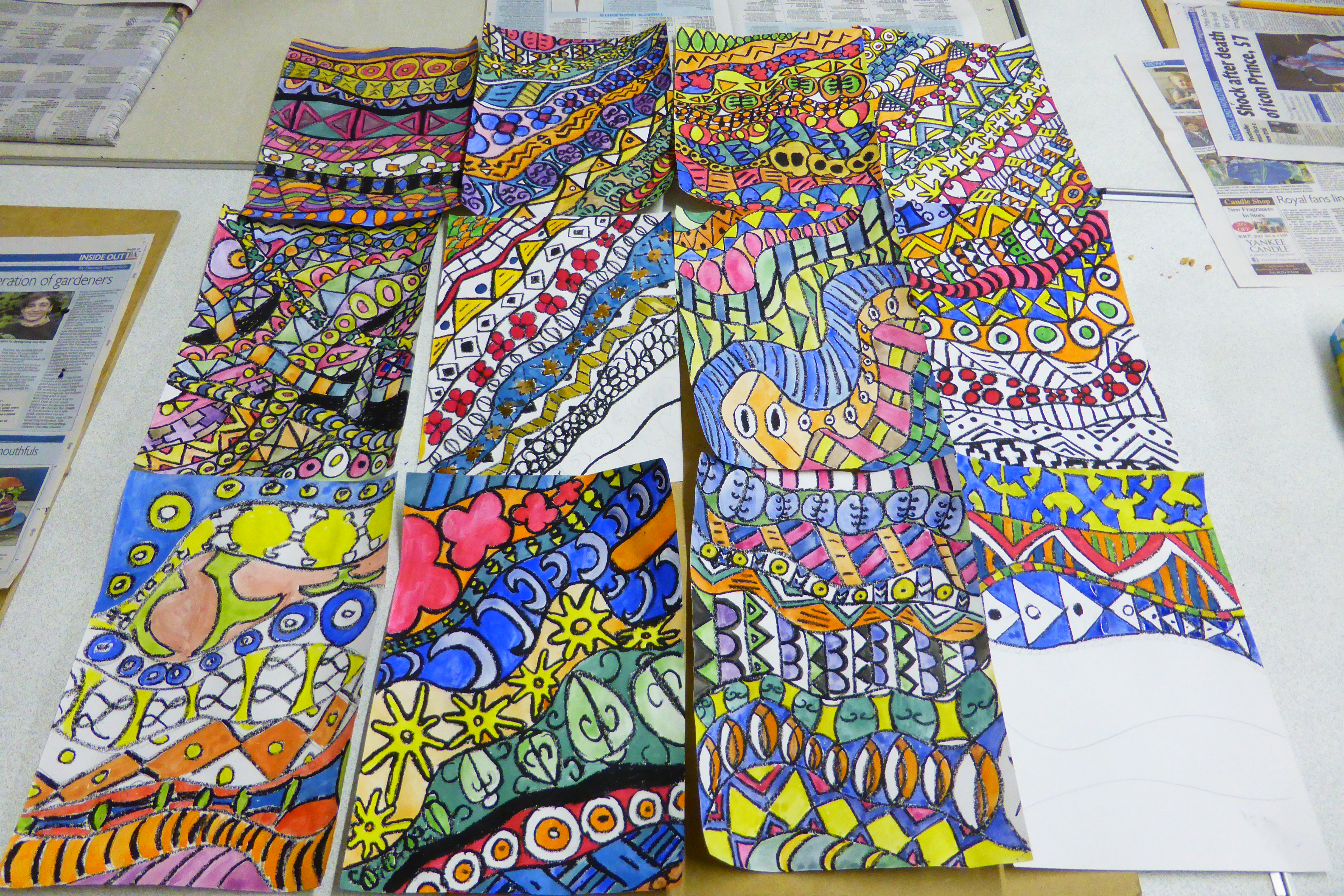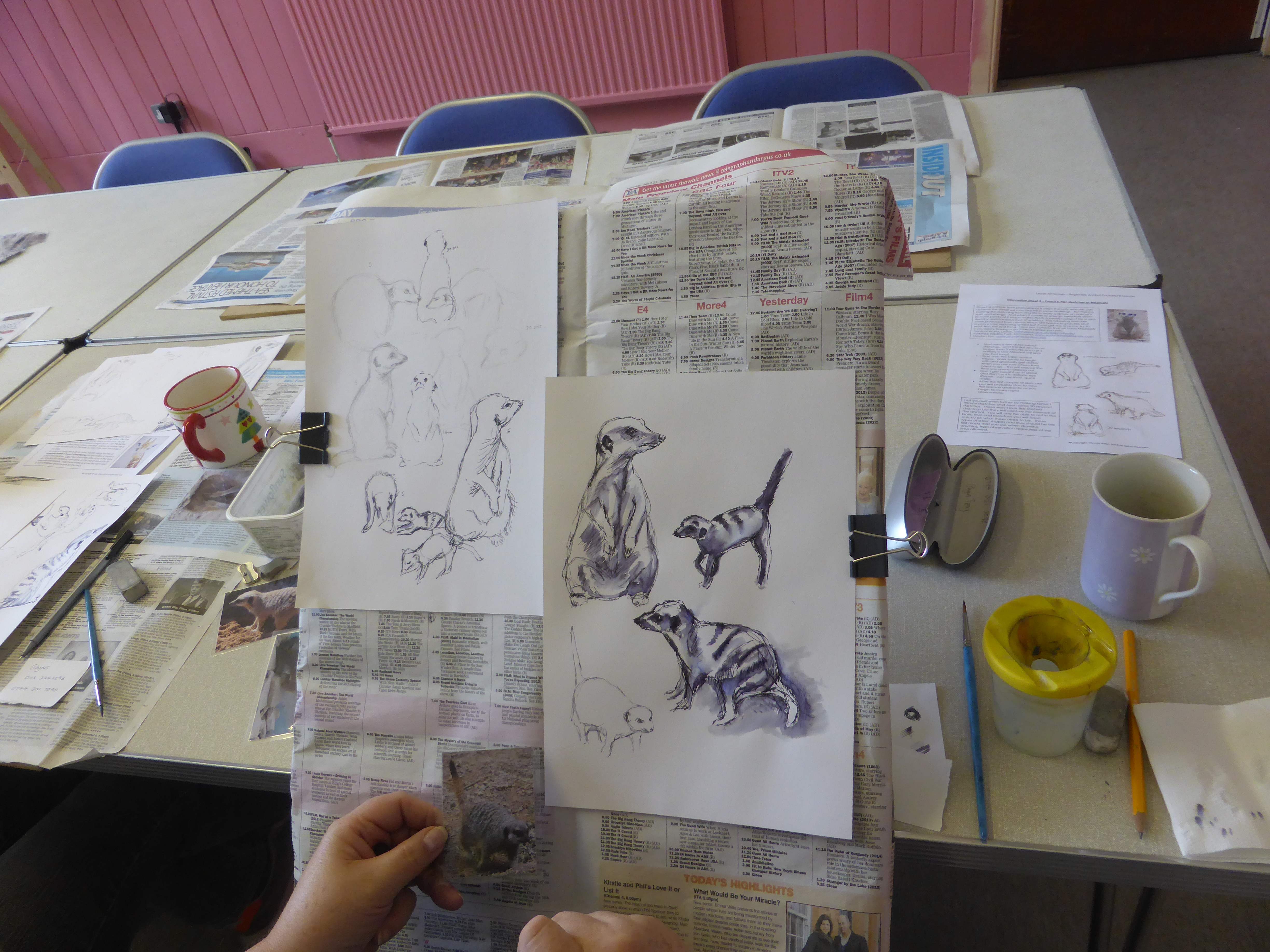 Over half way through the course now and you’re producing some great artwork. The Drawing course tried out a few exercises this week to help us draw what we can “see” rather than what we “think” we can see and we also looked at negative space (another tricky one to get your head around). The Animal course made some timed drawings of Meerkats to help work on their speed. The Pattern course went tribal and created some really vivid designs based on African art and the Watercolour course looked at how to work around a painting adding layers to create depth.