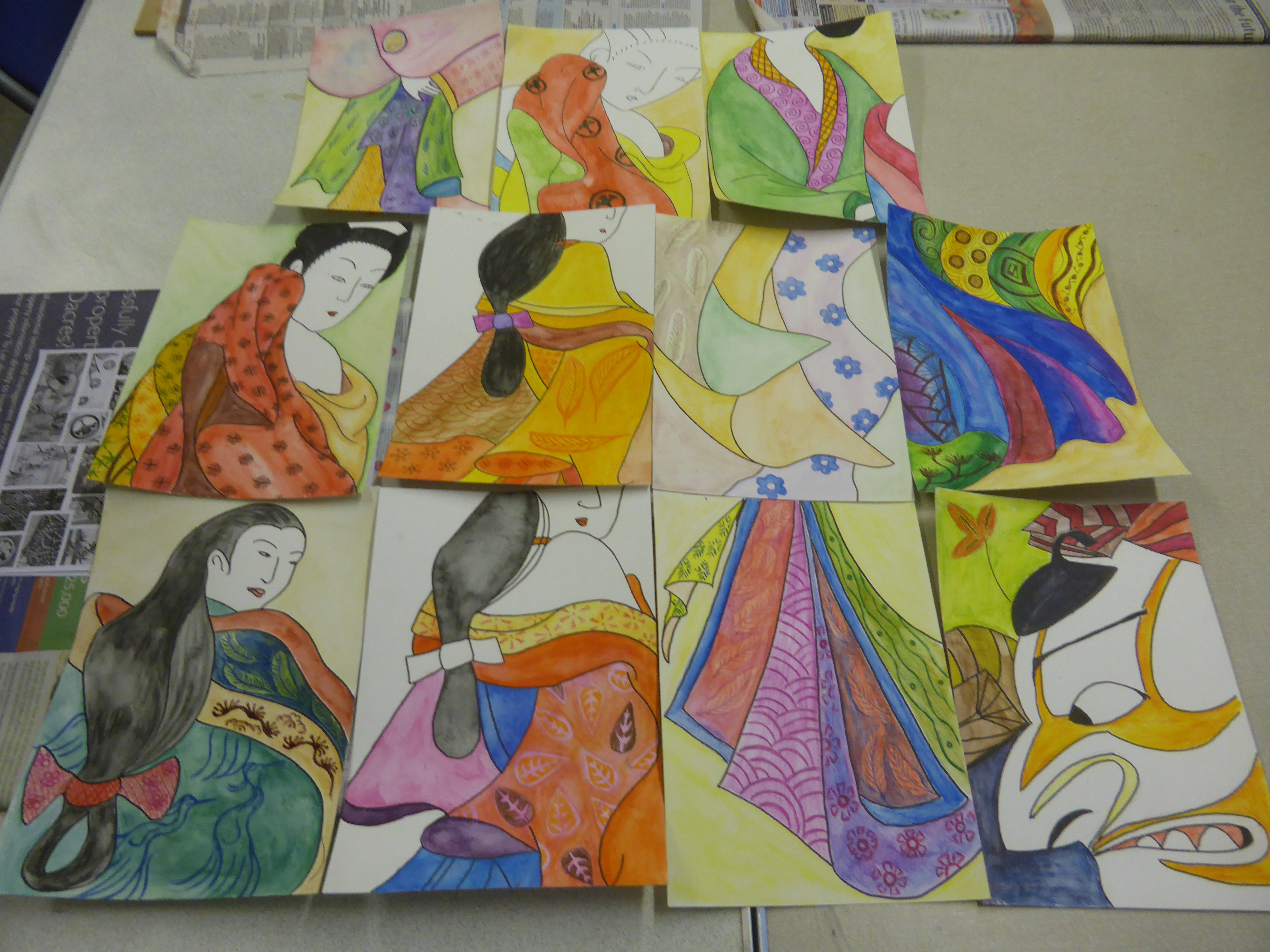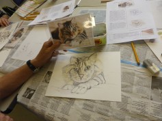 Week 6 brought even more fabulous creations. The Drawing course tackled how to draw water and glass with all the crazy optical illusions that involves and they made a really good job of it. “Cats” was the theme for this weeks Animal course along with pen and cross hatching techniques. The Pattern course looked at Japanese prints and used a layering technique with watercolour pencils to create patterns. The Watercolour course did some practise sketches of the human figure to limber up for next weeks lesson when we will have a life model to work from.