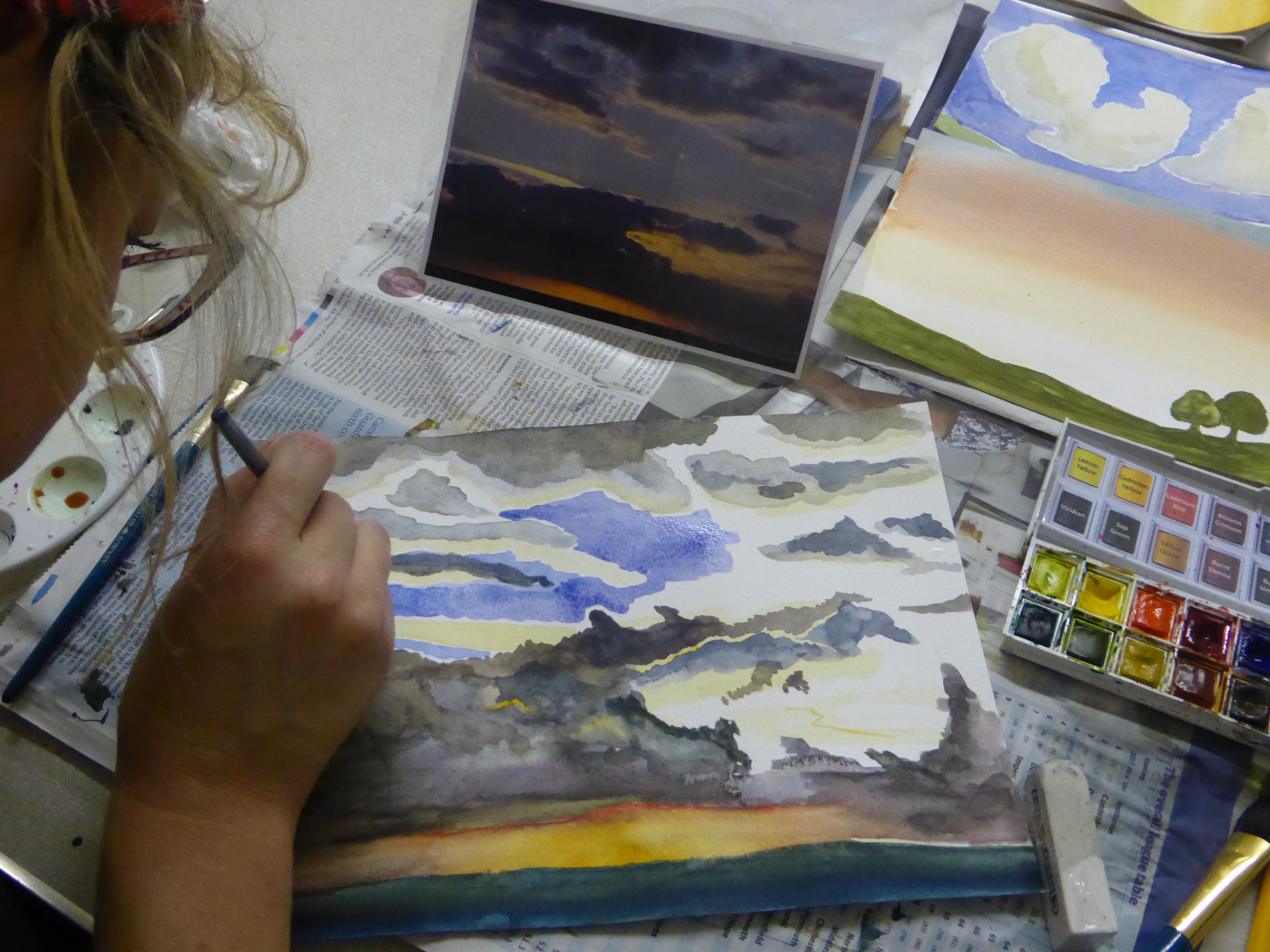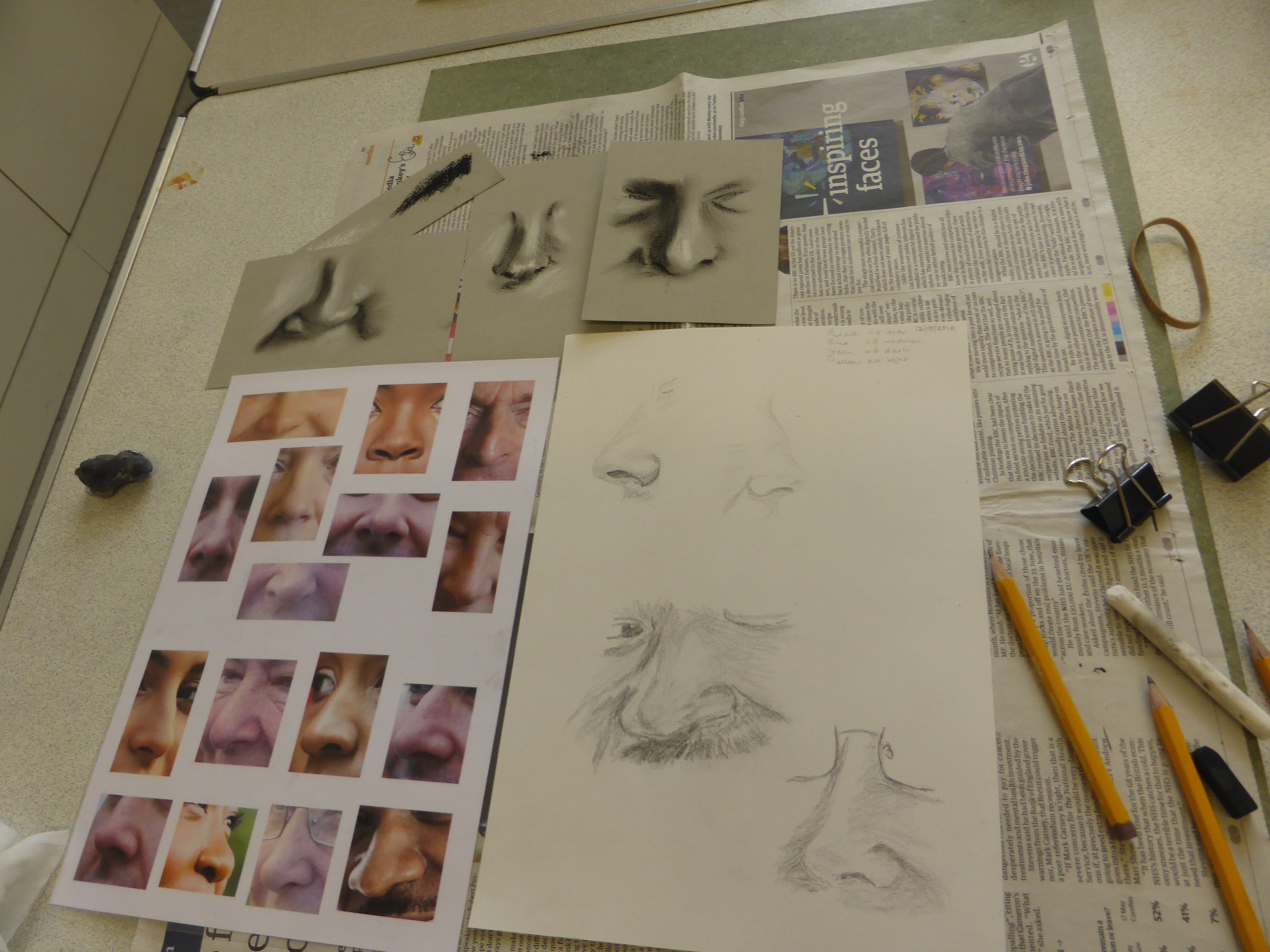 This week the Animal course painted some watercolour giraffes using only 5 colours to create the whole thing. The Watercolour course practised their colour mixing skills and created some really vivid skies. The Portraiture course made some pencil sketches of noses and then moved on to soft pastel – just using black and white and the colour of the paper to create tone. Great work everyone. Hope you’re all enjoying the course. I am loving seeing all the wonderful pictures you’re producing each week. Keep up the good work!