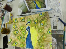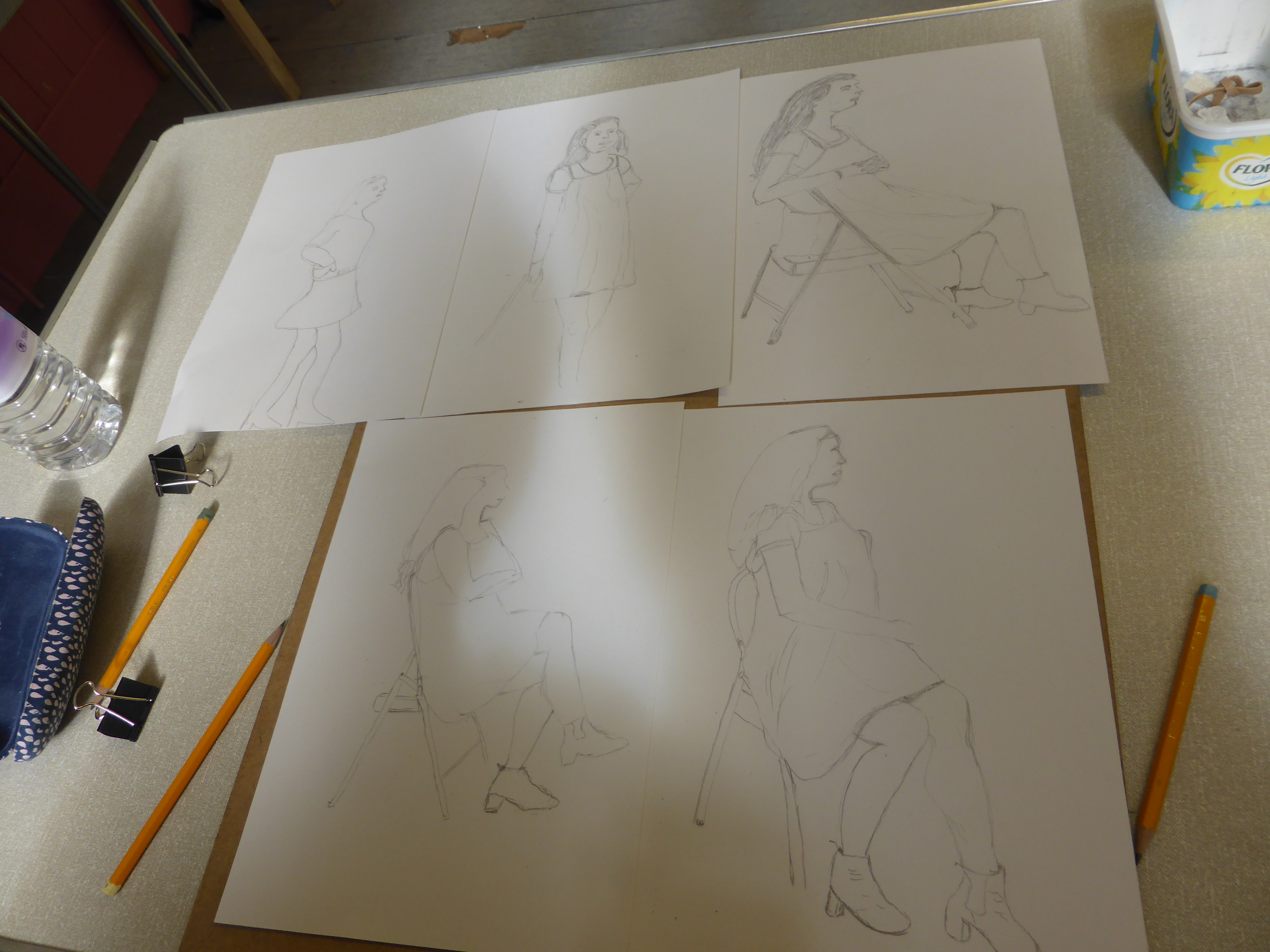 Well, we’ve now come to the end of the current courses and you’ve all made brilliant progress. As you know, there are no gradings or assessments in Leeds Art Group courses but please consider yourselves all to have graduated with first class honours! The Beginners Animal Portraiture Course 2 finished the term in a beautiful flurry of colour by using ink blocks to create some amazing peacock drawings. The Beginners Drawing Course 1 tried one of the most difficult subjects to draw but also one of the most rewarding – the human figure. I could clearly see how you all improved your technique just in this one lesson, well done! For the finale of the Beginners Portraiture Course we had the opportunity to finally put together everything we had learned throughout the course by drawing a full portrait from life. Well done, you were really thinking about all the different aspects we have covered and you produced some great drawings. Thanks to both our models: Nicoletta and Grace and to Mary for the yummy Victoria sponge!