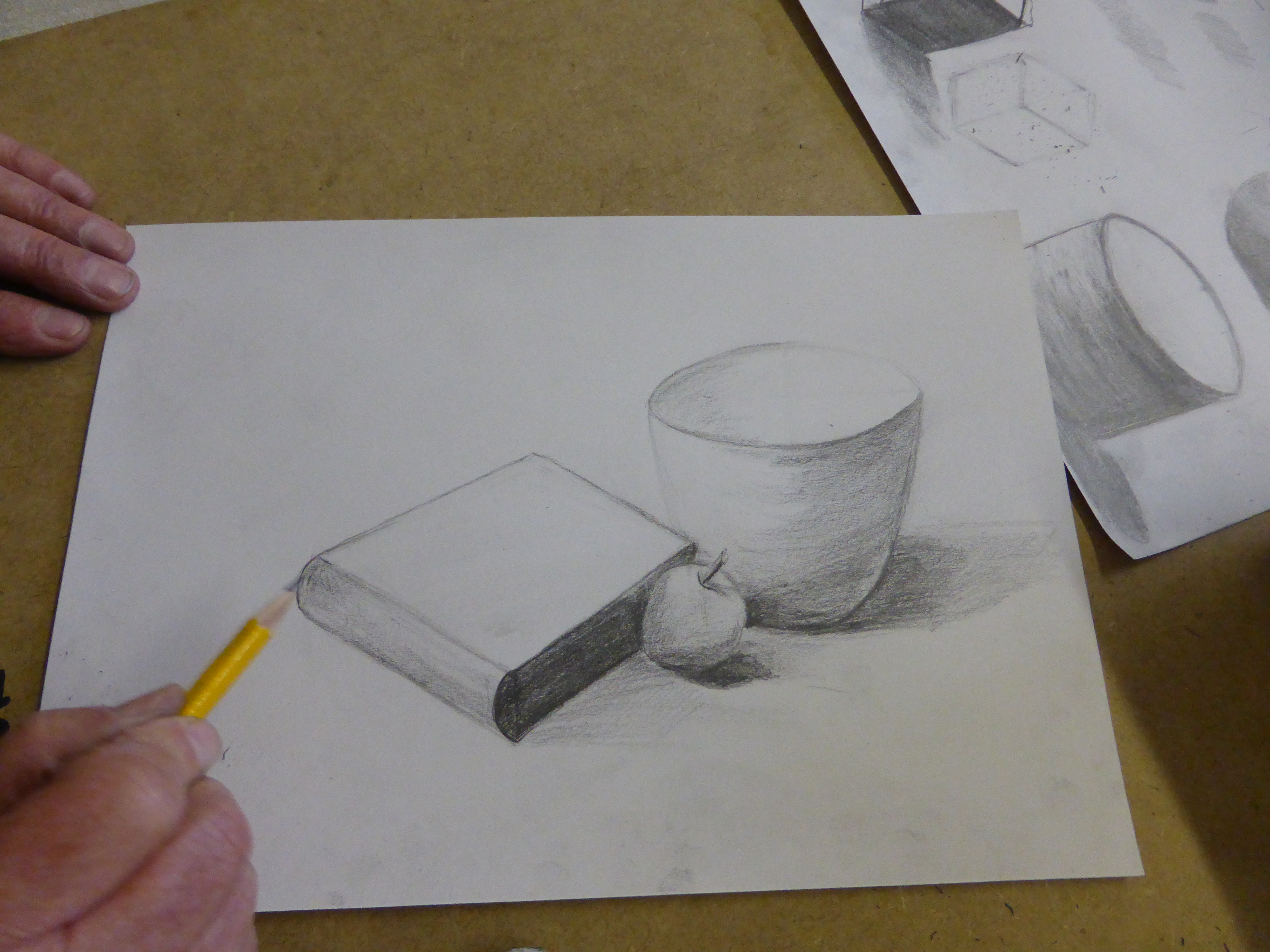 I really enjoyed the first week of Drawing 2 with the vase, apple and book – took it home and did more work on it to clarify how light and dark work together. Thank you, Wendy!