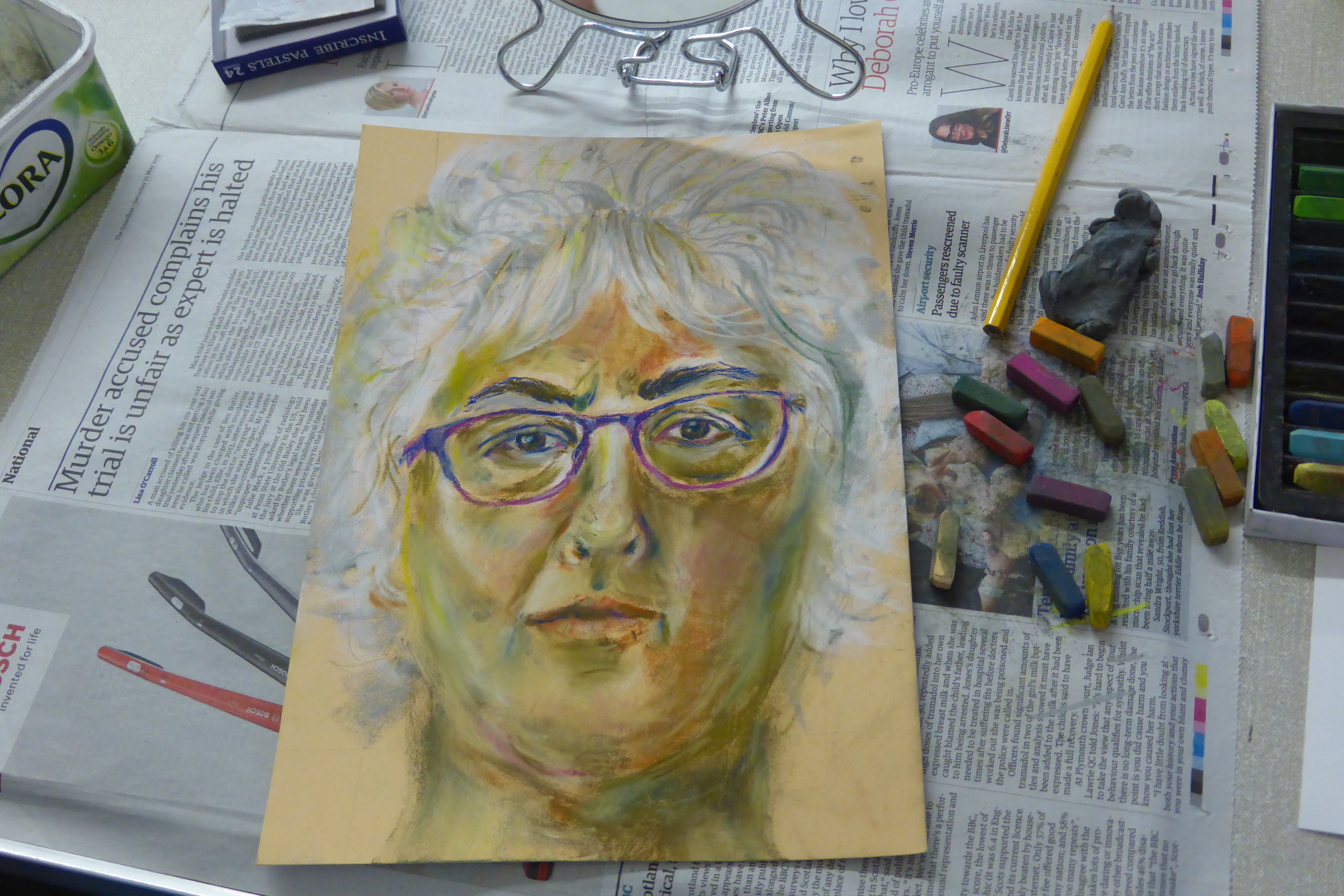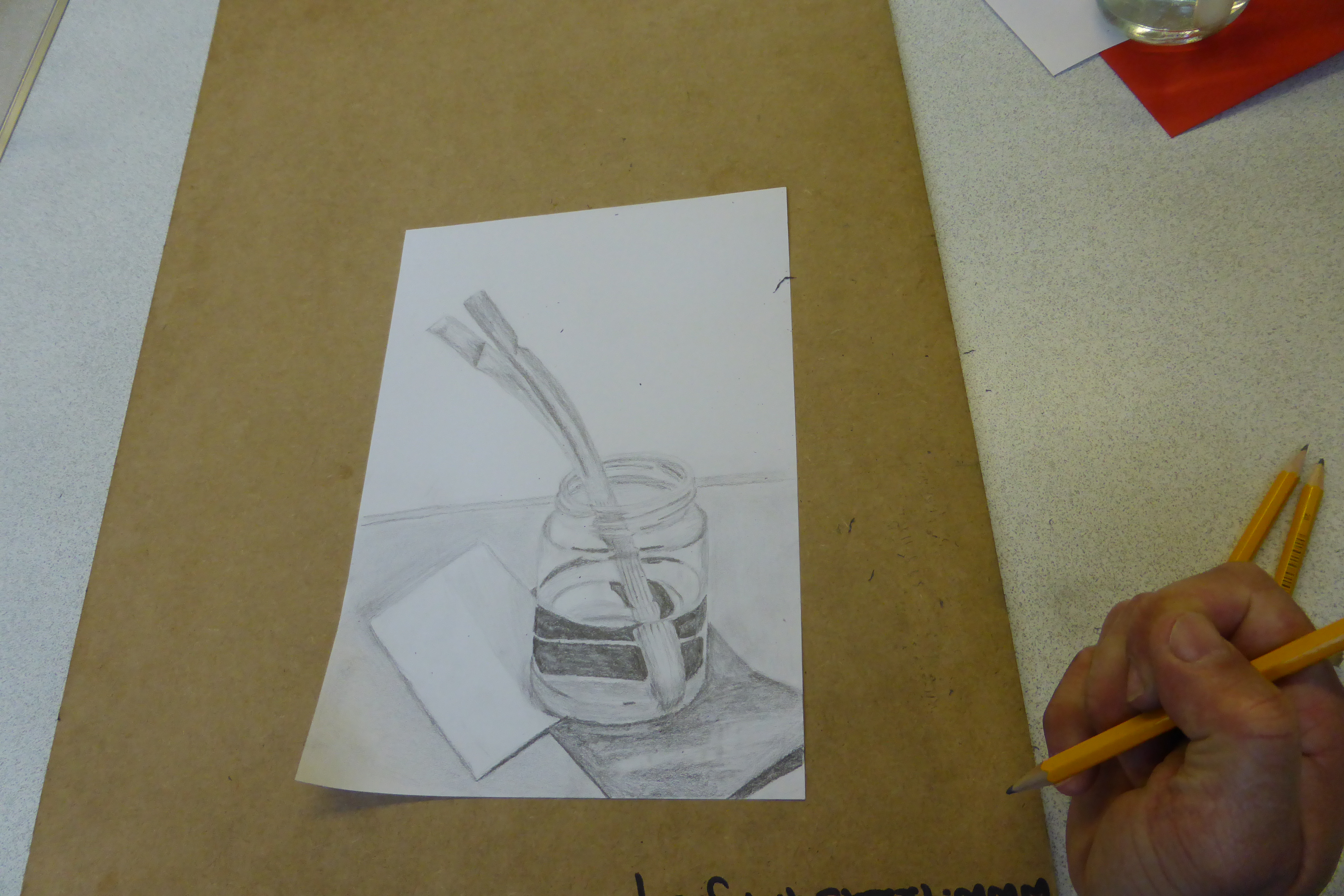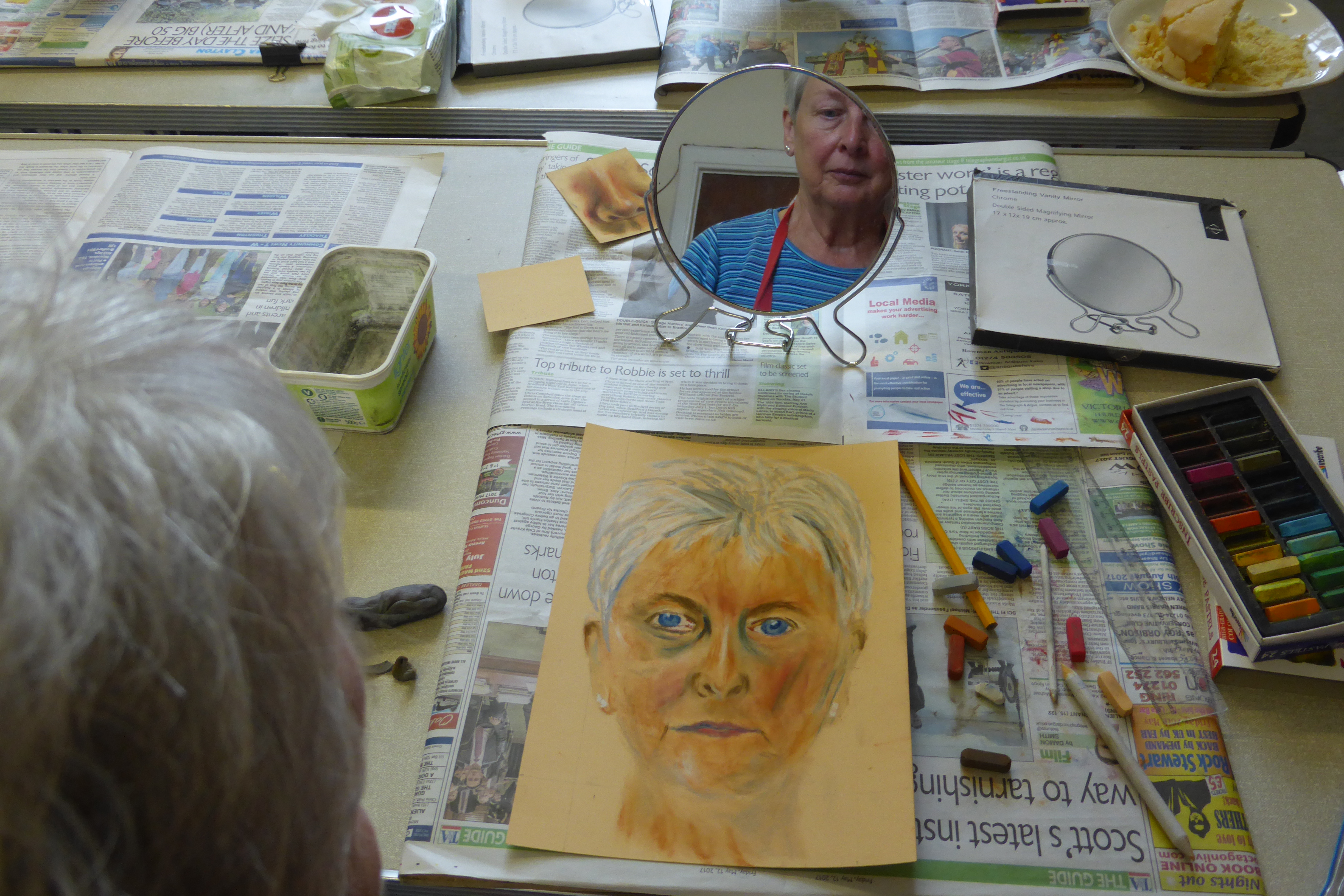 This week the Beginners Drawing Course 2 had the challenge of not only drawing glass but drawing water aswell. Both these things can distort how we see objects and you really had to focus on drawing what you could actually see infront of you – not what you “think” you can see. The Beginners Pastel Drawing Course drew self-portraits this week. This is always a difficult one but with some great results. Well done everyone.
