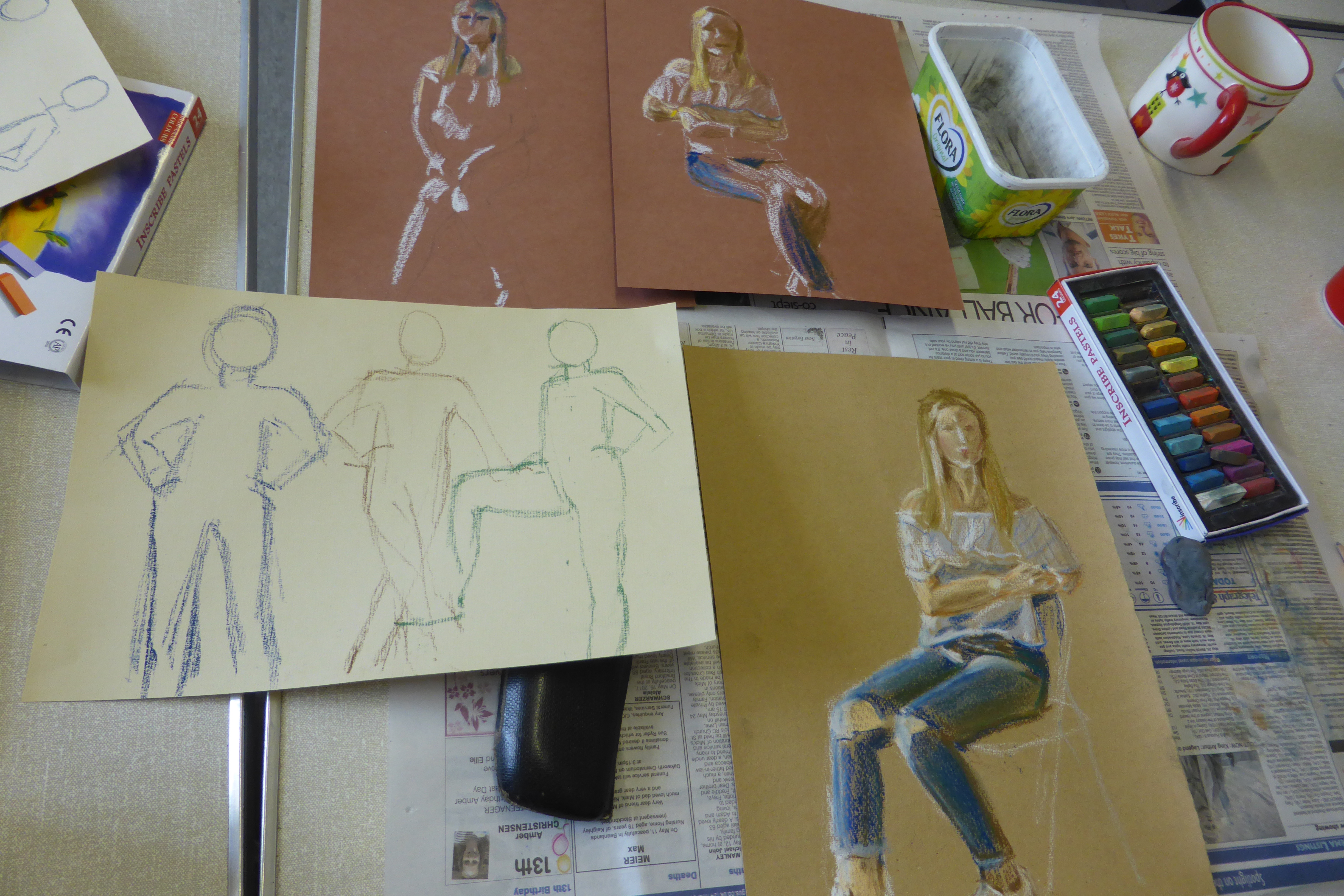 This week was the last lesson of the current courses and you did some fantastic work. The Beginners Drawing Course Level 2 had to really focus on their accuracy in order to create one large group jigsaw of an Escher drawing. How all the pieces matched up when we put them together is a real testament to how well you’ve all done and how much progress you’ve made. The Beginners Pastel Drawing Course had the ultimate challenge of drawing the human figure. There’s very little room for error in life drawing and you all did a great job. Big thanks to our life model Esther.