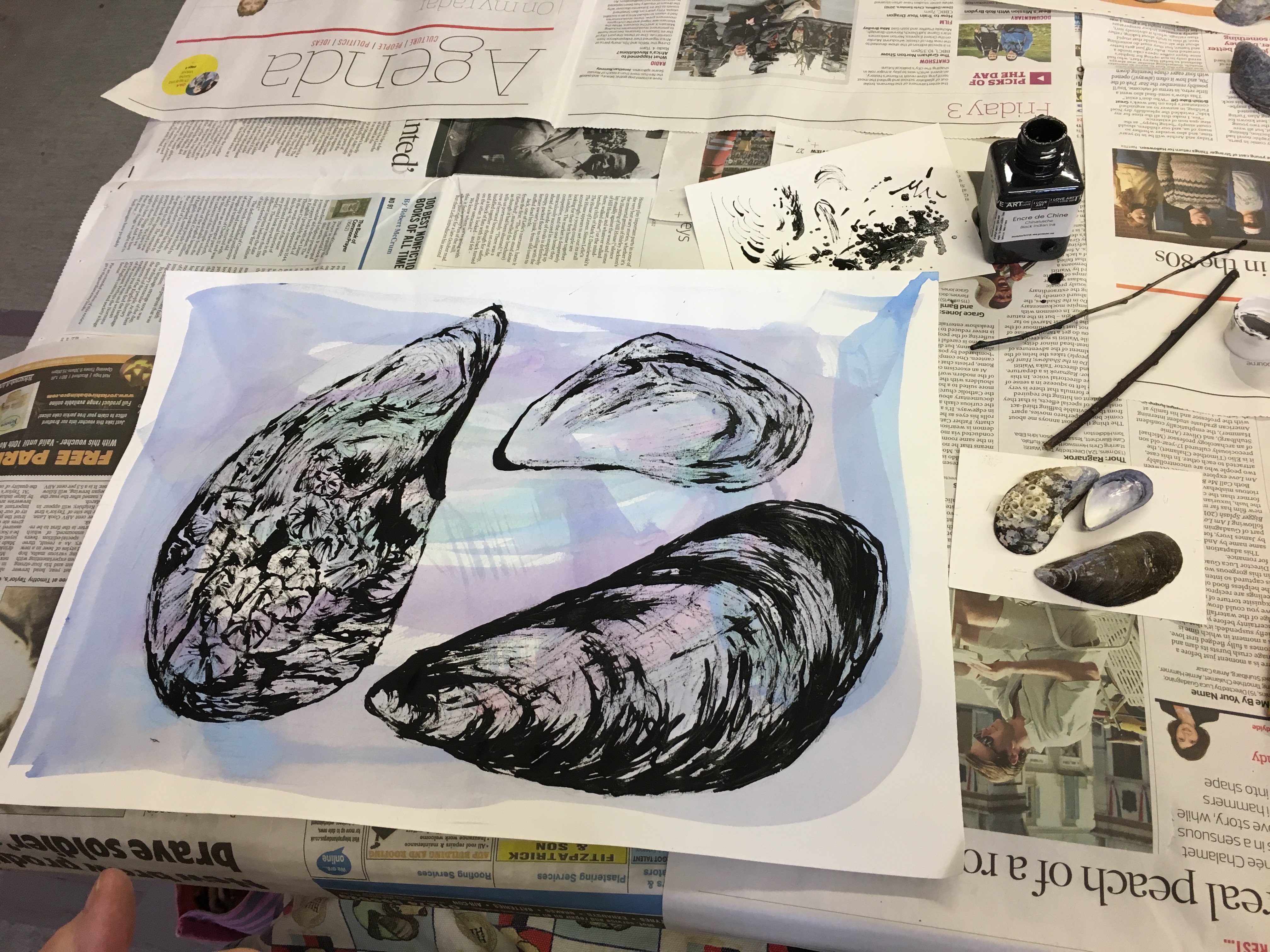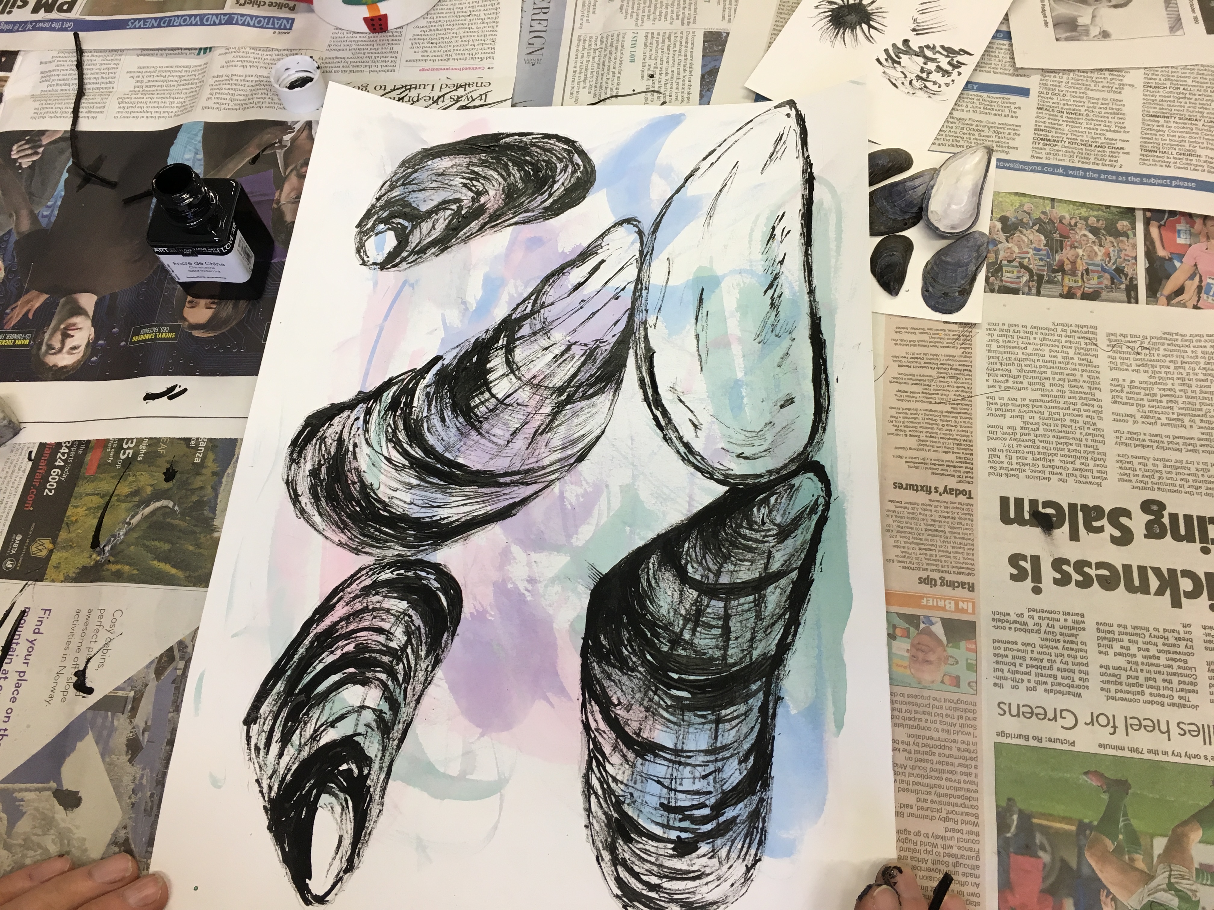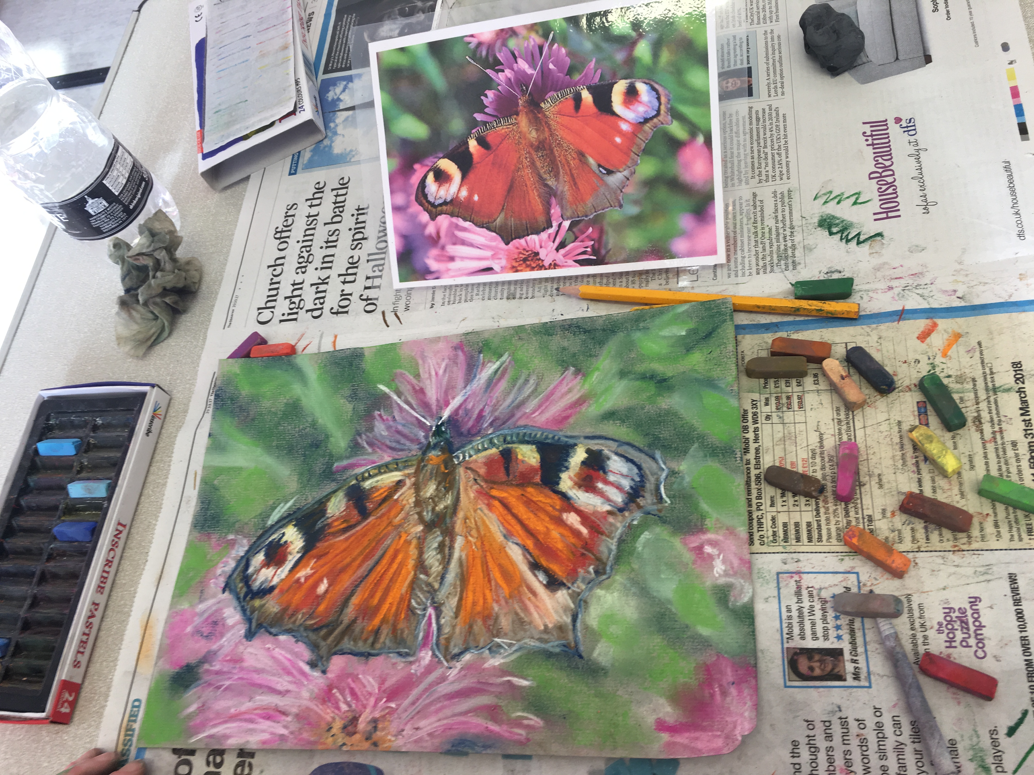 Nice to see you all back in class after our break. The Nature course used a stick and ink technique to create these brilliant enlarged drawings of mussel shells. The Drawing course worked on their accuracy of line and tone by using a grid to help them create beautiful drawings of Italian statues. The Animal course had a colourful peacock butterfly to inspire them this week and did a fantastic job using soft pastels. Great work everyone!