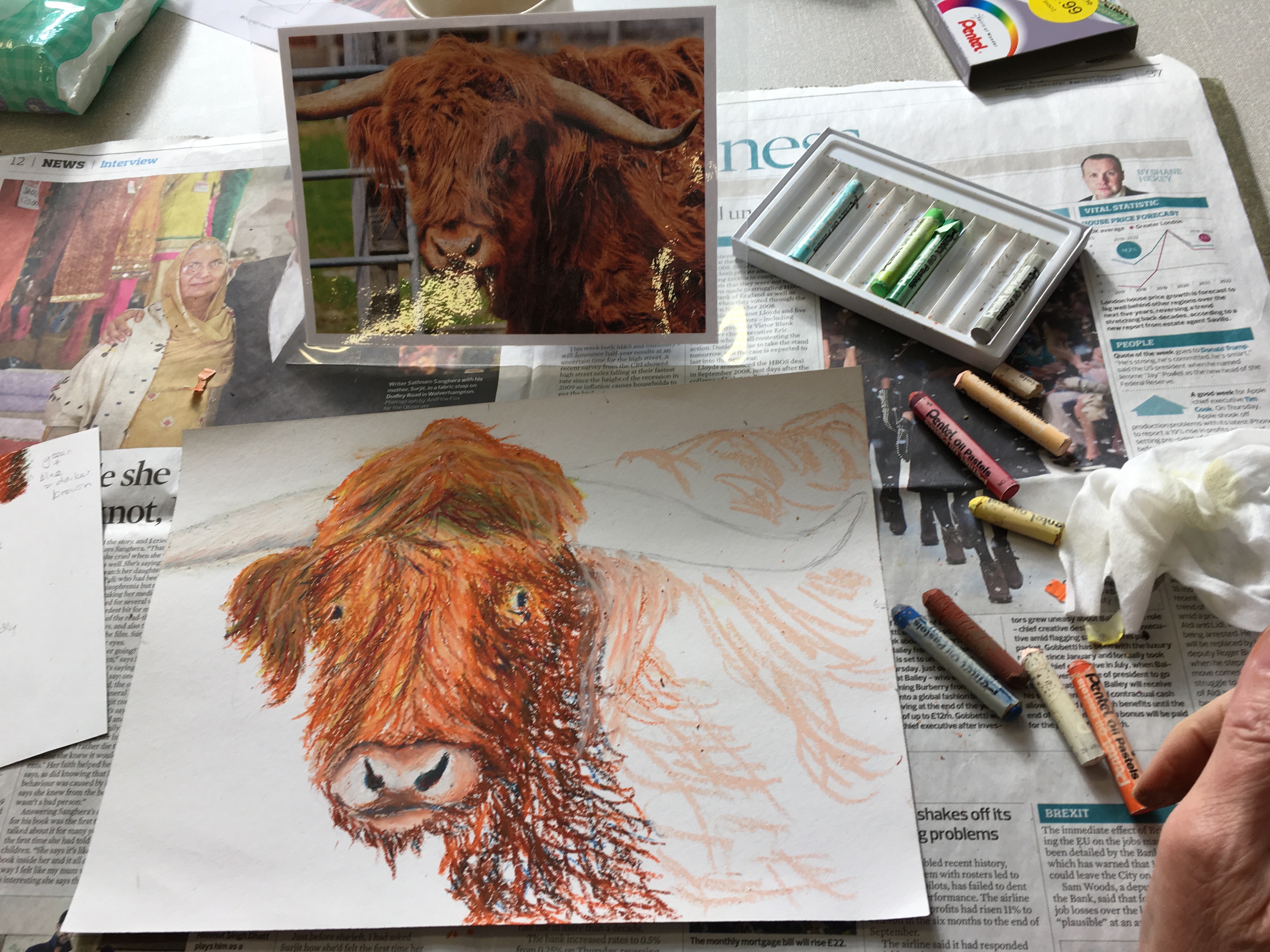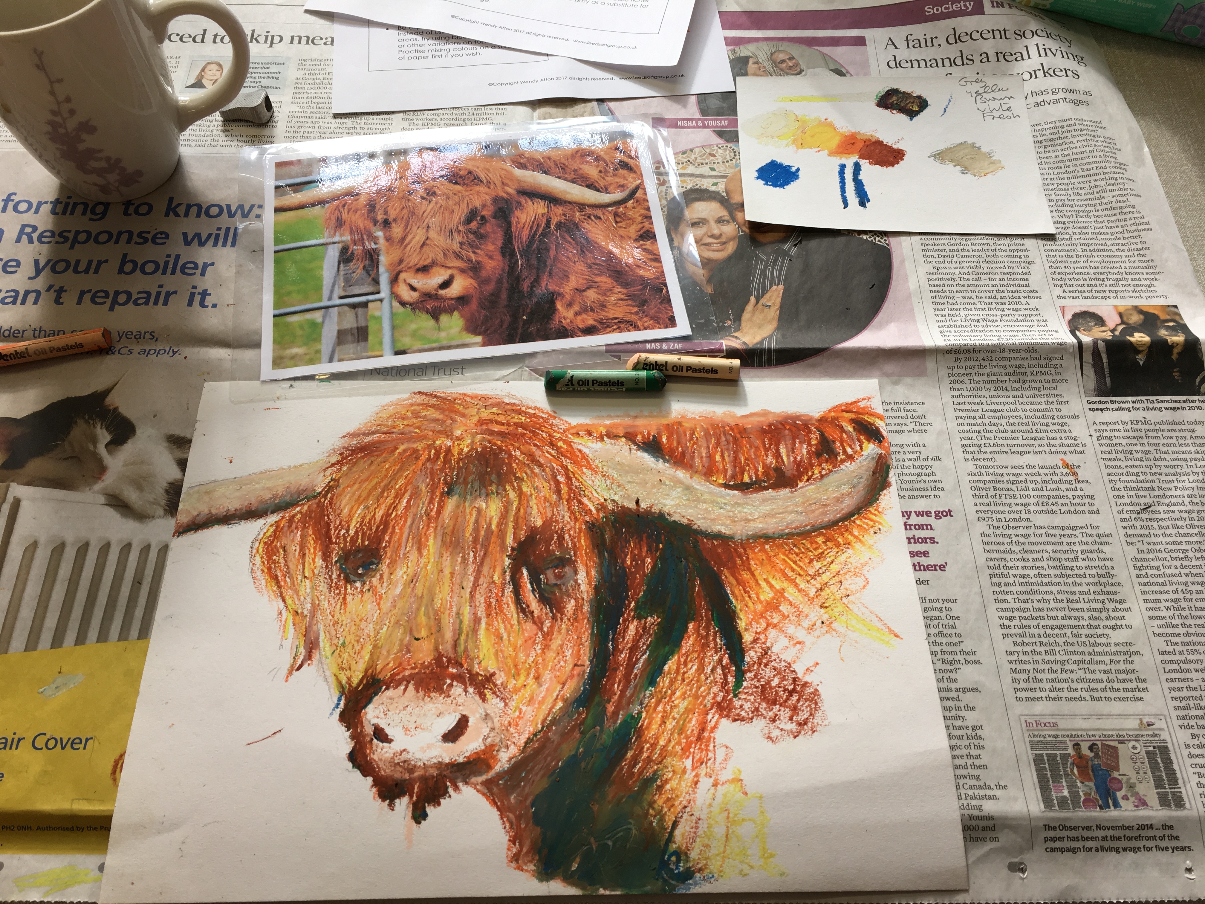 This week the Nature course used watercolour pencils and a layering technique to create these enlarged drawings of conkers. The Drawing course used a series of timed drawings to help train the eye to make quick decisions about the key elements of a picture. The Animal course produce these colourful drawings of highland cattle using oil pastels. Fantastic work everyone and thank you to everyone who made it through the snow to get to class this week.