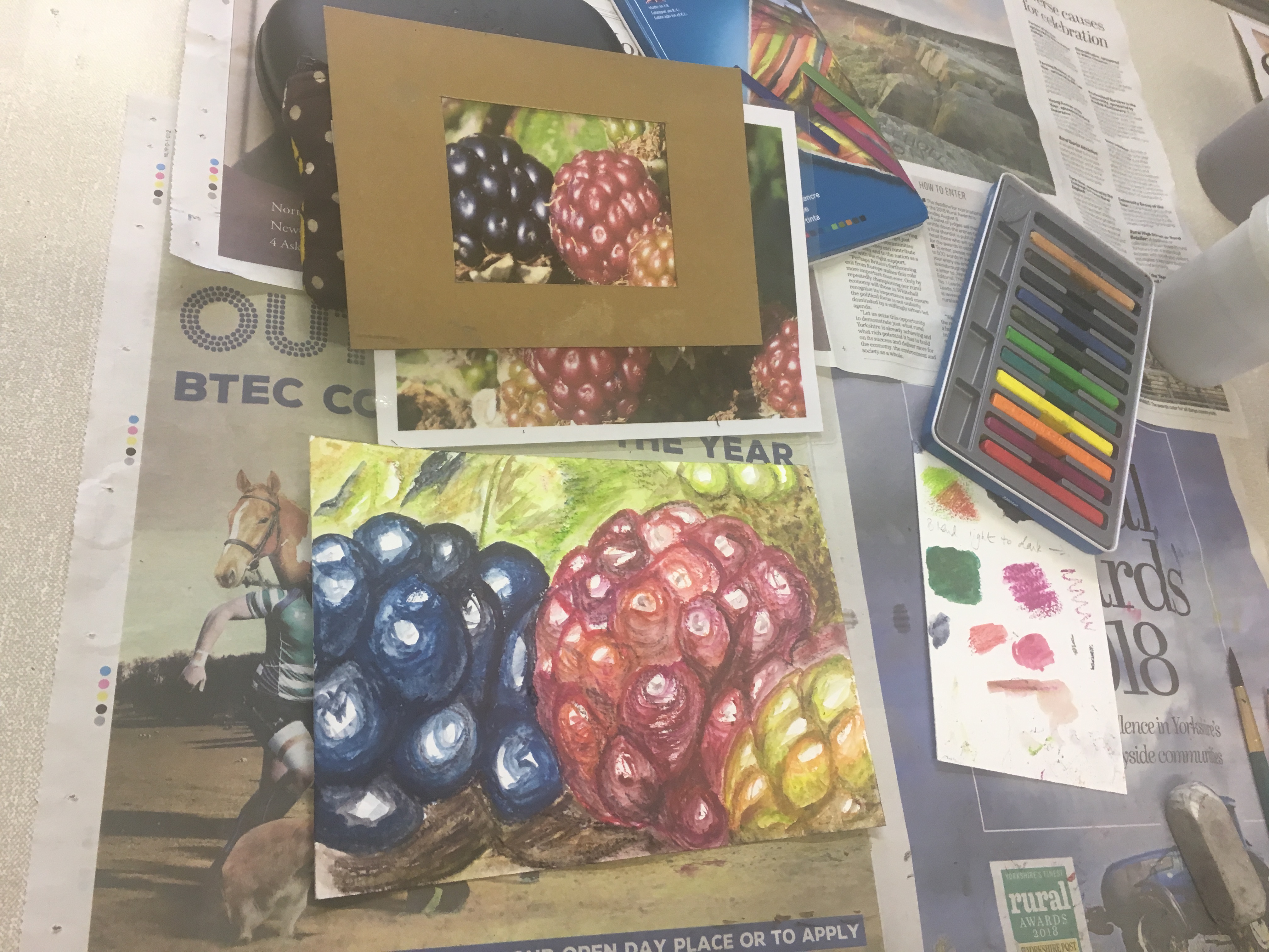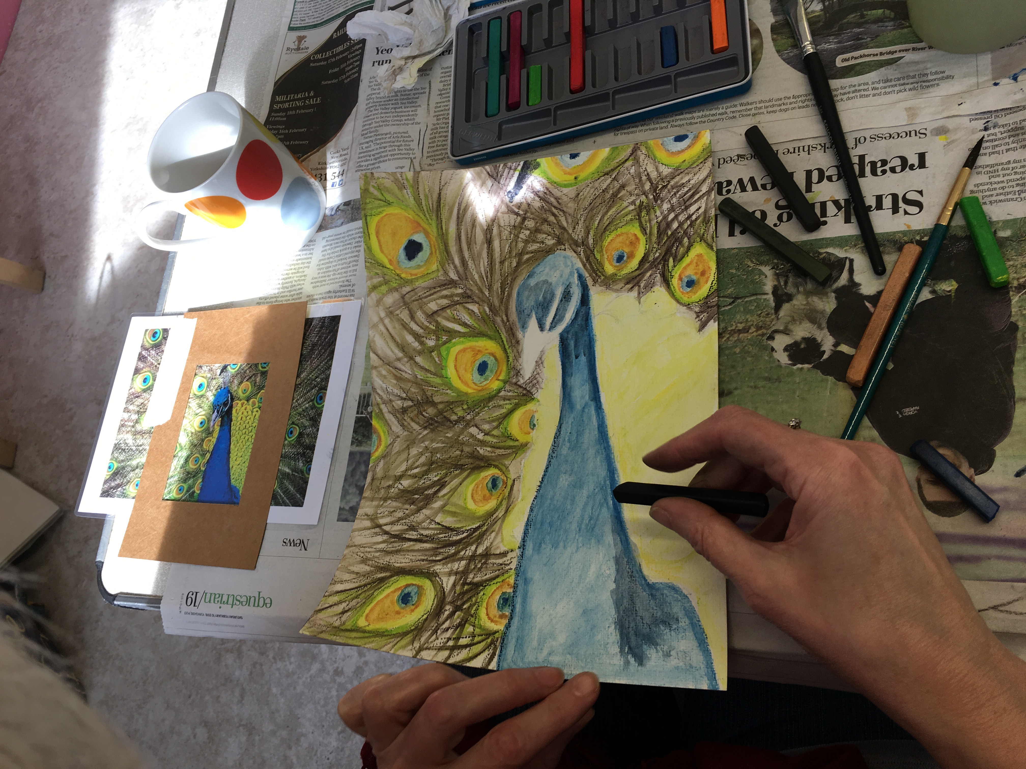 It was the last week of lessons for this term and we finished in a blaze of colour in the Beginners Drawing from Nature Course with drawings of blackberries using inktense blocks. The Beginners Animal Portraiture Course 2 used the same medium to create beautiful drawings of peacocks. The Beginners Drawing Course 1 faced the ultimate challenge of drawing the human figure but what fantastic progress you all made just in the space of one lesson. Big thanks to our model Nicoletta. Brilliant work everyone and thank you for all your help and enthusiasm of the past few weeks. It’s been a pleasure to teach you and I hope to see you all soon at future Leeds Art Group courses.