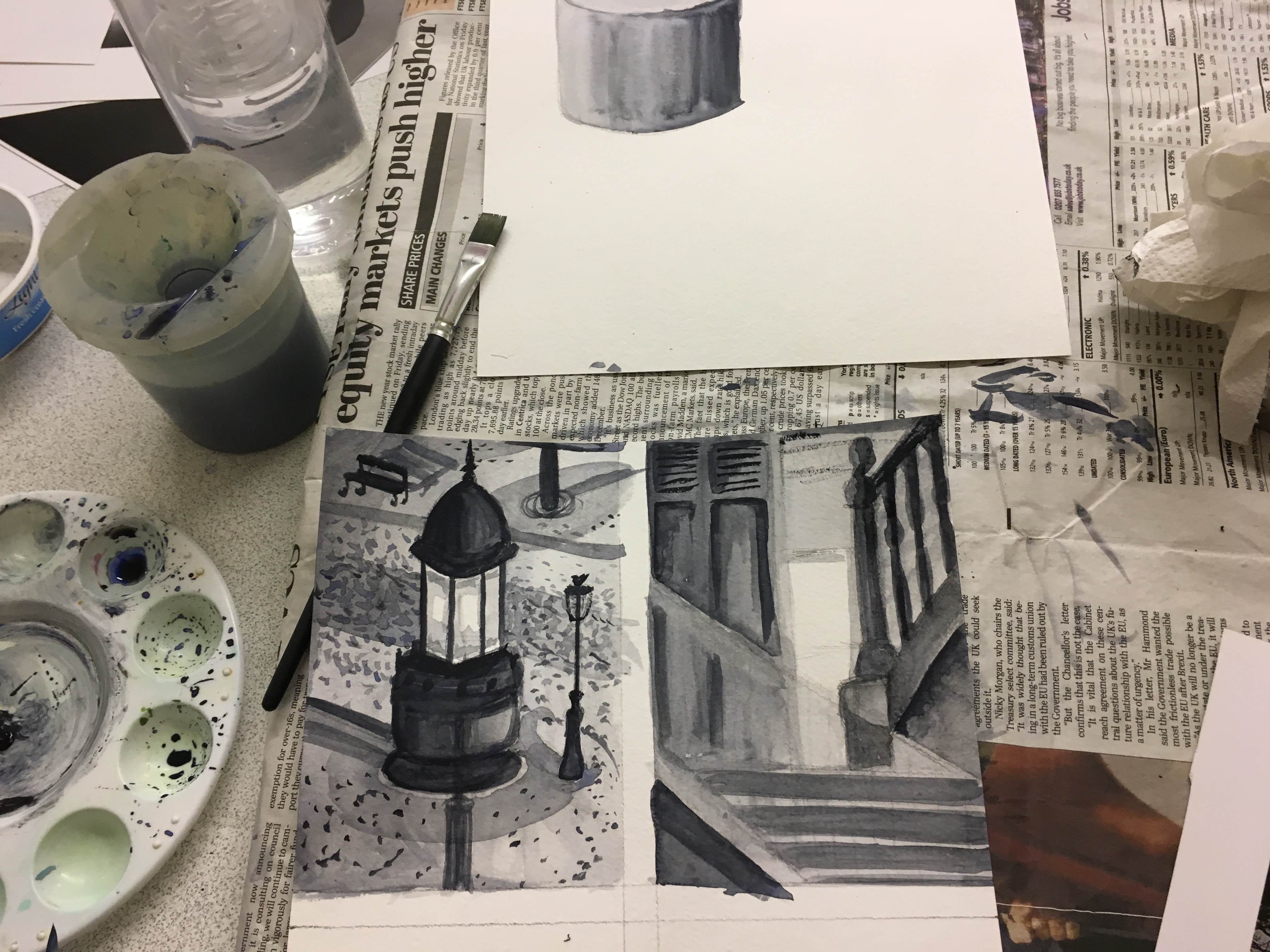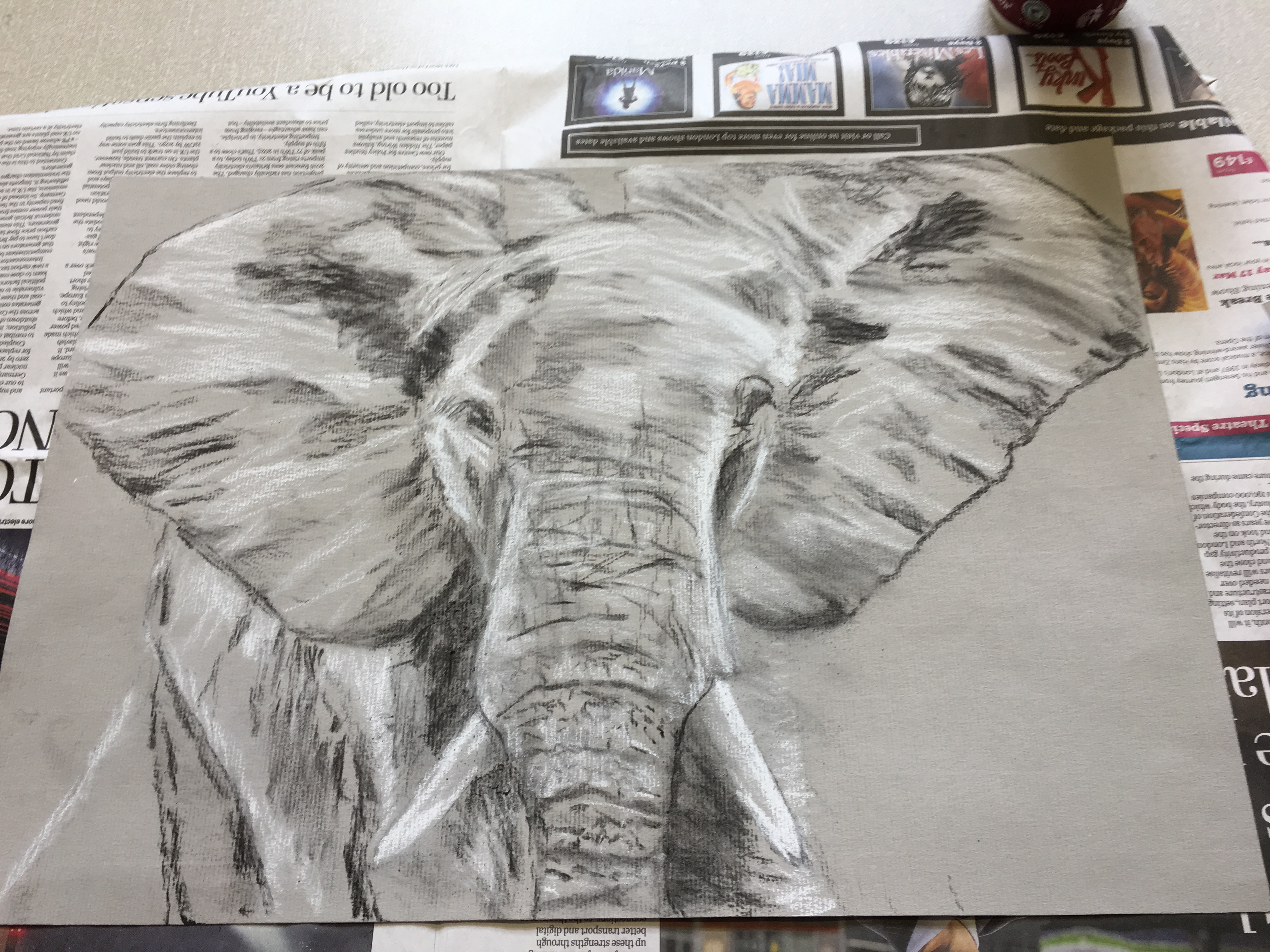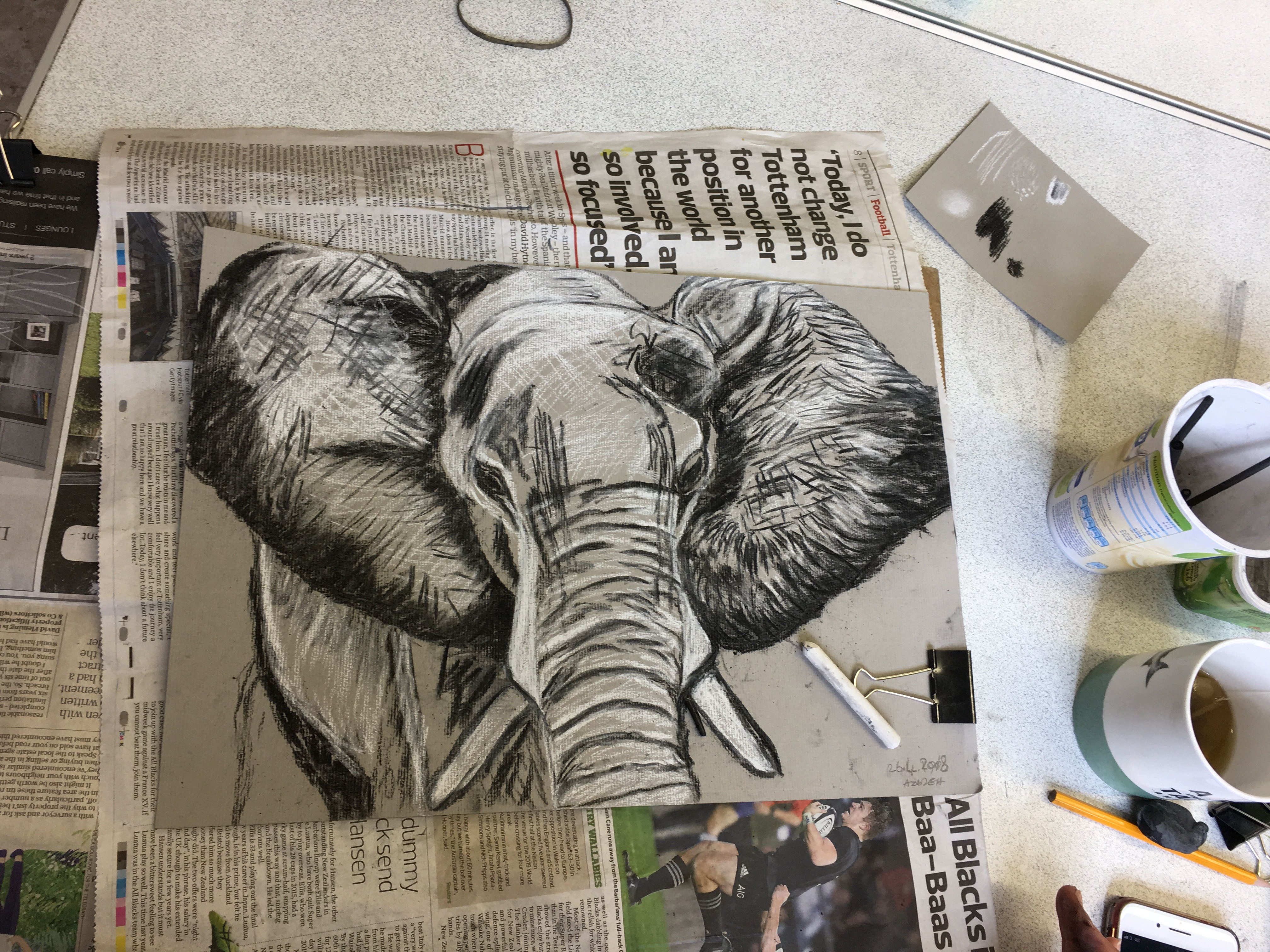 Bit of a monochrome week for both courses this week. After all that colour mixing last week, the Beginners Watercolour Course 2 focused solely on tone and layering of a single colour to create depth in their paintings, with some really effective results. The Beginners Animal Portraiture Course 1 used charcoal and white pastel to create these fantastic drawings of elephants which also show how individuals can have very different styles even when working from the same subject. Both really beautiful drawings. Well done everyone.