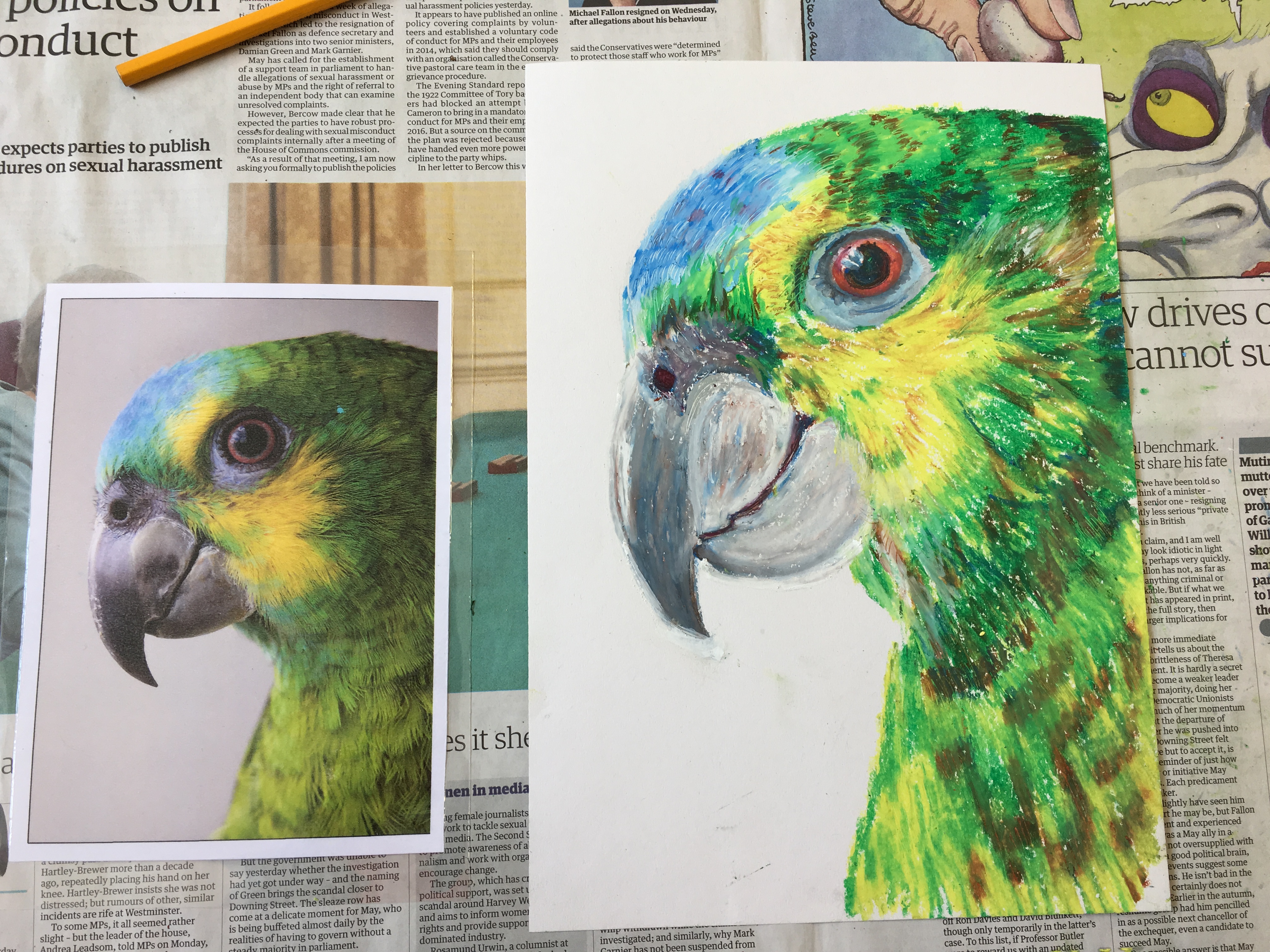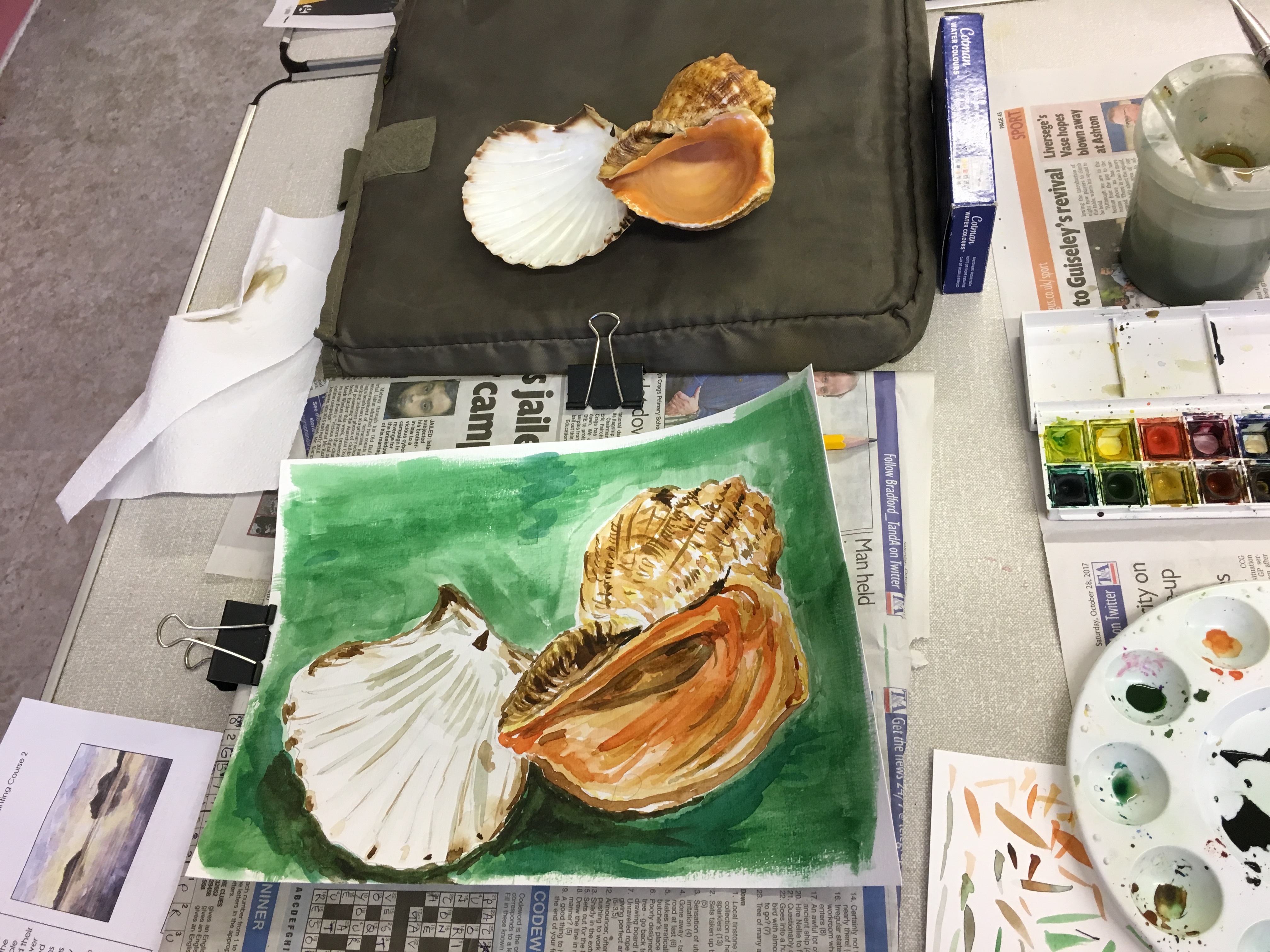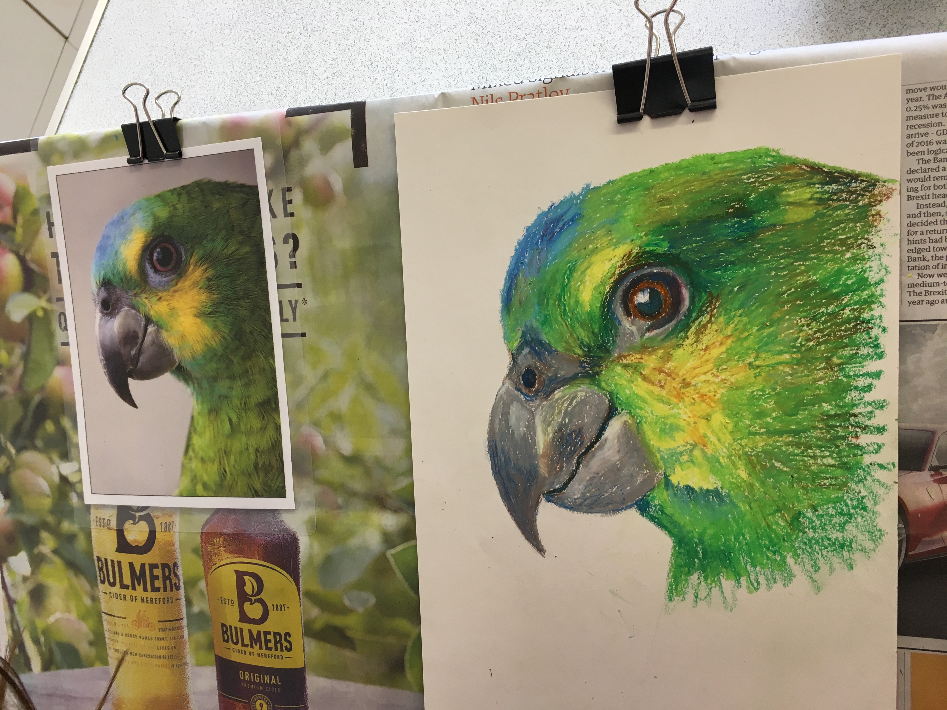 We’ve come to the end of the term once again and the past few weeks seem to have flown by. The Beginners Watercolour Course 2 continued to practise their painting skills with the added challenge of drawing from three dimensional objects. You did some fantastic paintings and really showed how much you’ve all learned during the course. The Beginners Animal Portraiture Course 1 used oil pastels this week to create some really vibrant drawings of parrots. Well done everyone! I couldn’t have asked for more effort and enthusiasm from you, it paid off! Thank you to everyone who has helped to set up/pack away at the end of lessons. Your help is very much appreciated.