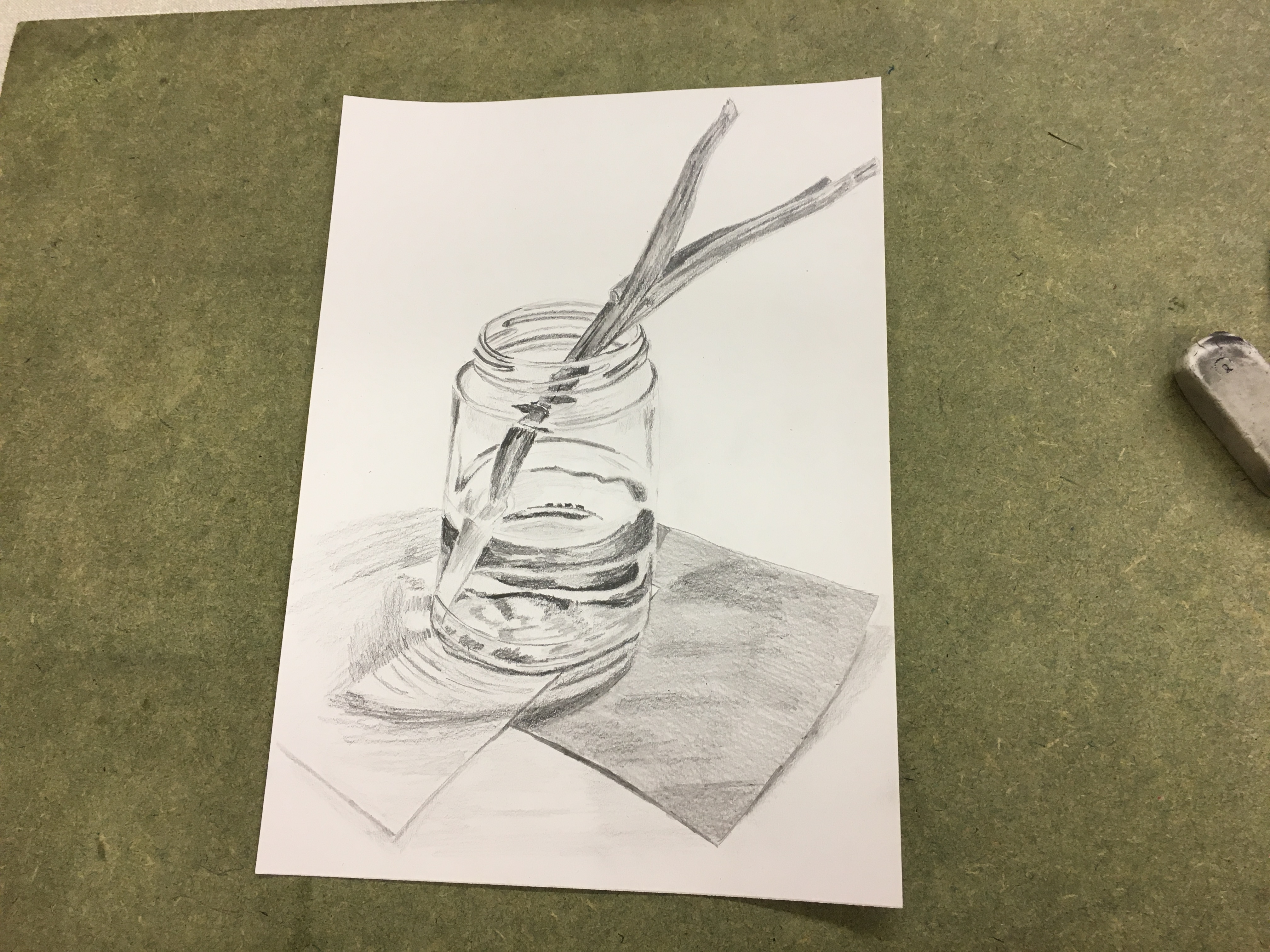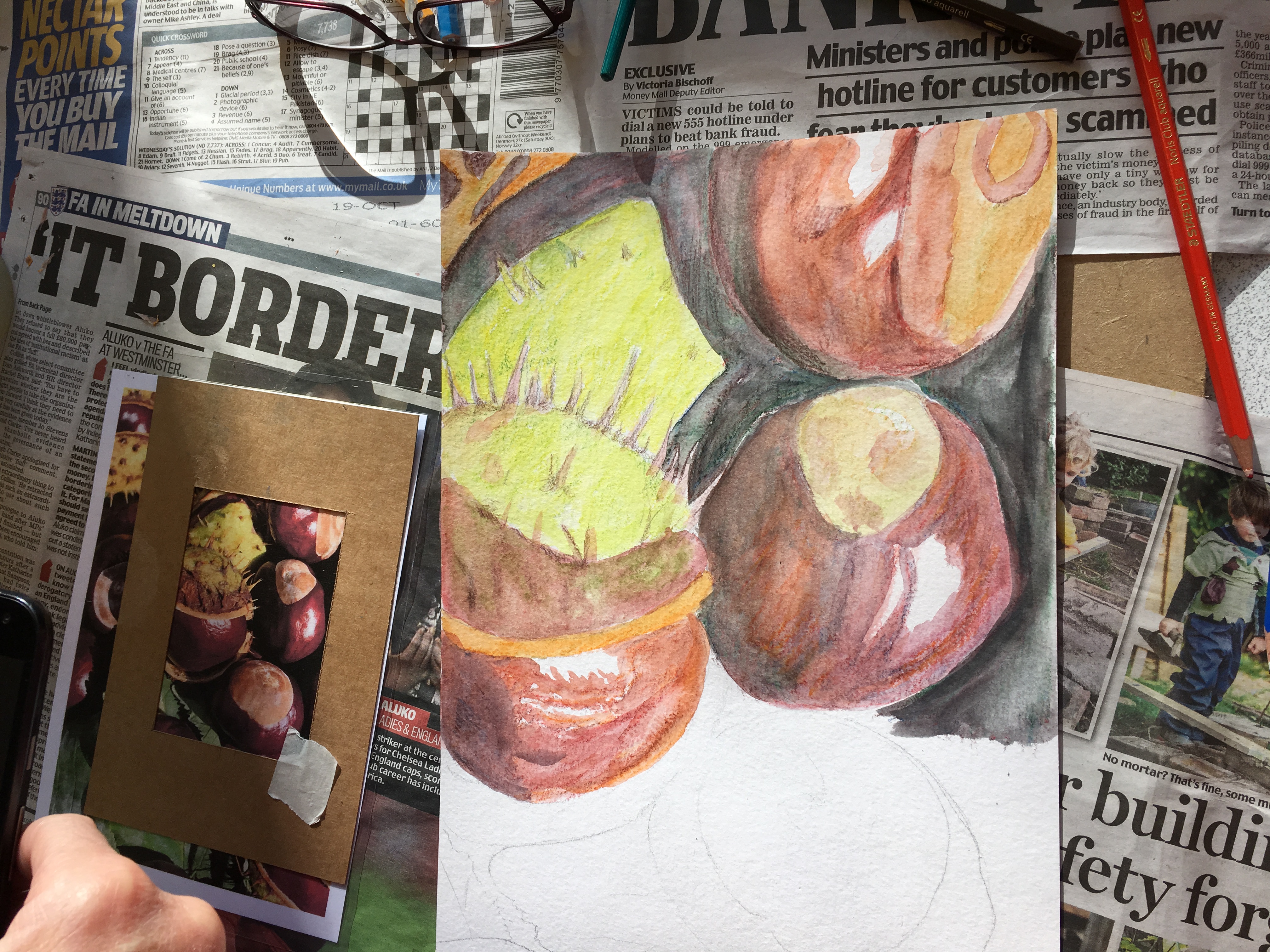 The challenge for the Beginners Watercolour Course 2 this week was to paint white without using white!? In other words: painting the shadows on white objects. Very tricky to do but very effective with a bit of practise. The Beginners Drawing Course Level 2 had their own challenge in drawing not just glass but water aswell. Well done for not being phased by how difficult this looked. The Beginners Drawing from Nature produced these fab, shiny, conker drawings using watercolour pencils. In the Beginners Drawing Course Level 1 we did a series of timed drawings to help work out the best way to build up a picture and focus quickly on the key elements. Difficult tasks for everyone this week but well done for rising to the challenge!