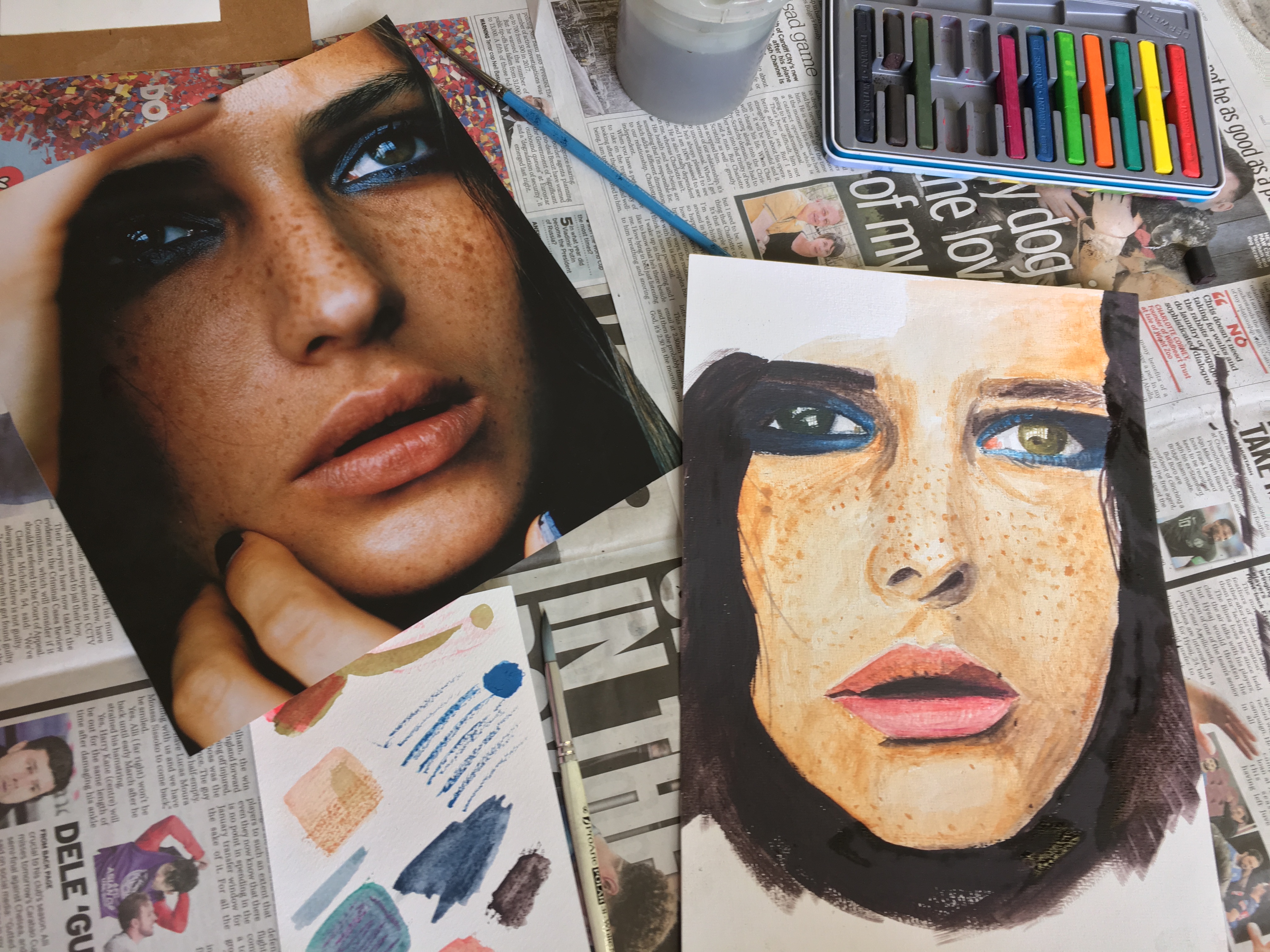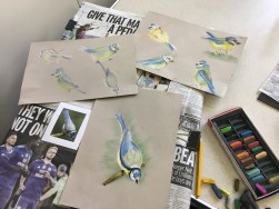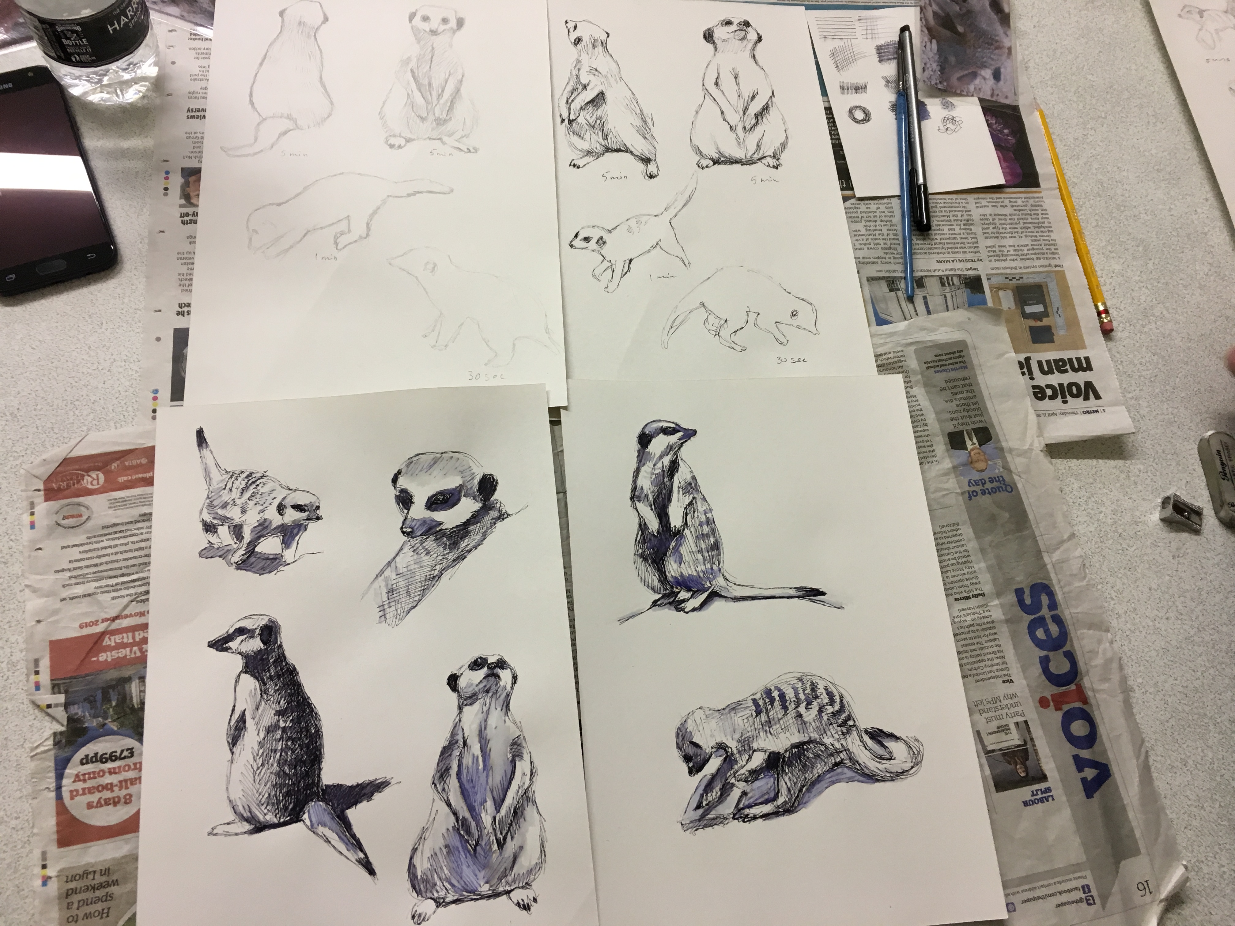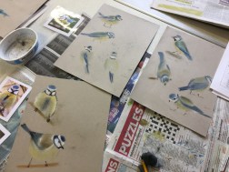 After our week off it was good to give those drawing skills a good work out with some timed drawings. The Beginners Animal Portraiture Course 1 had meerkats as their subject and produced a series of lively sketches in pencil and pen. The Beginners Birds Drawing Course did some similar timed exercises but with blue tits as the subject, using soft pastel. These quick, spontaneous drawings are good practice if you intend to draw from life. The Beginners Portraiture Course Level 2 used inktense blocks and experimented with colour mixing to create these dramatic portraits. Great work everyone.