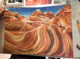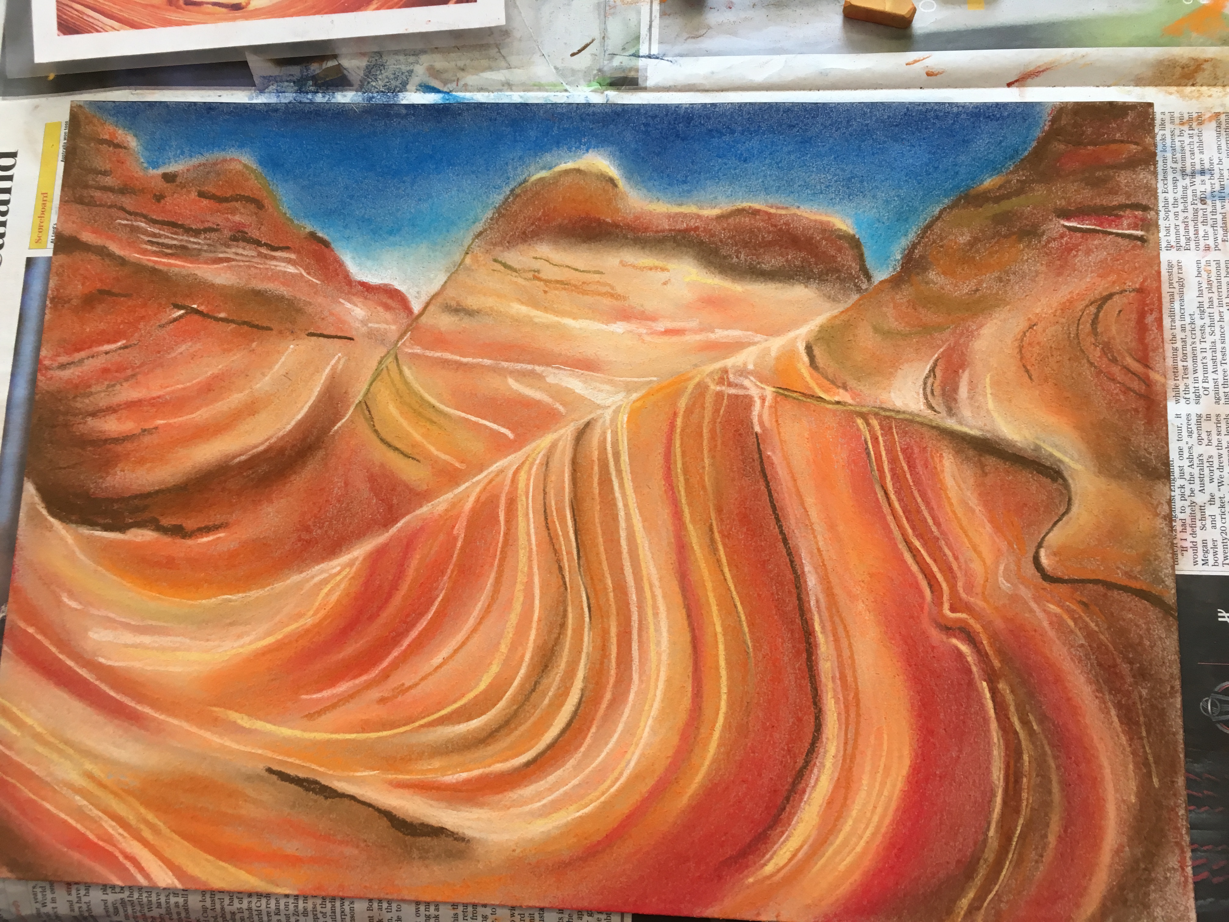 And welcome to all our newcomers this term too! Great to see everyone back in class and ready to get creative. We kicked off with an explosion of colour in the “Places” Beginners Mixed Media Course. These fantastic drawings of a sandstone formation were created using soft pastels. In the Beginners Drawing Course Level 2 we looked at how we can use tone to make objects look 3 dimensional. The Beginners Watercolour Painting Course started with some essentials – colour mixing and brush control.