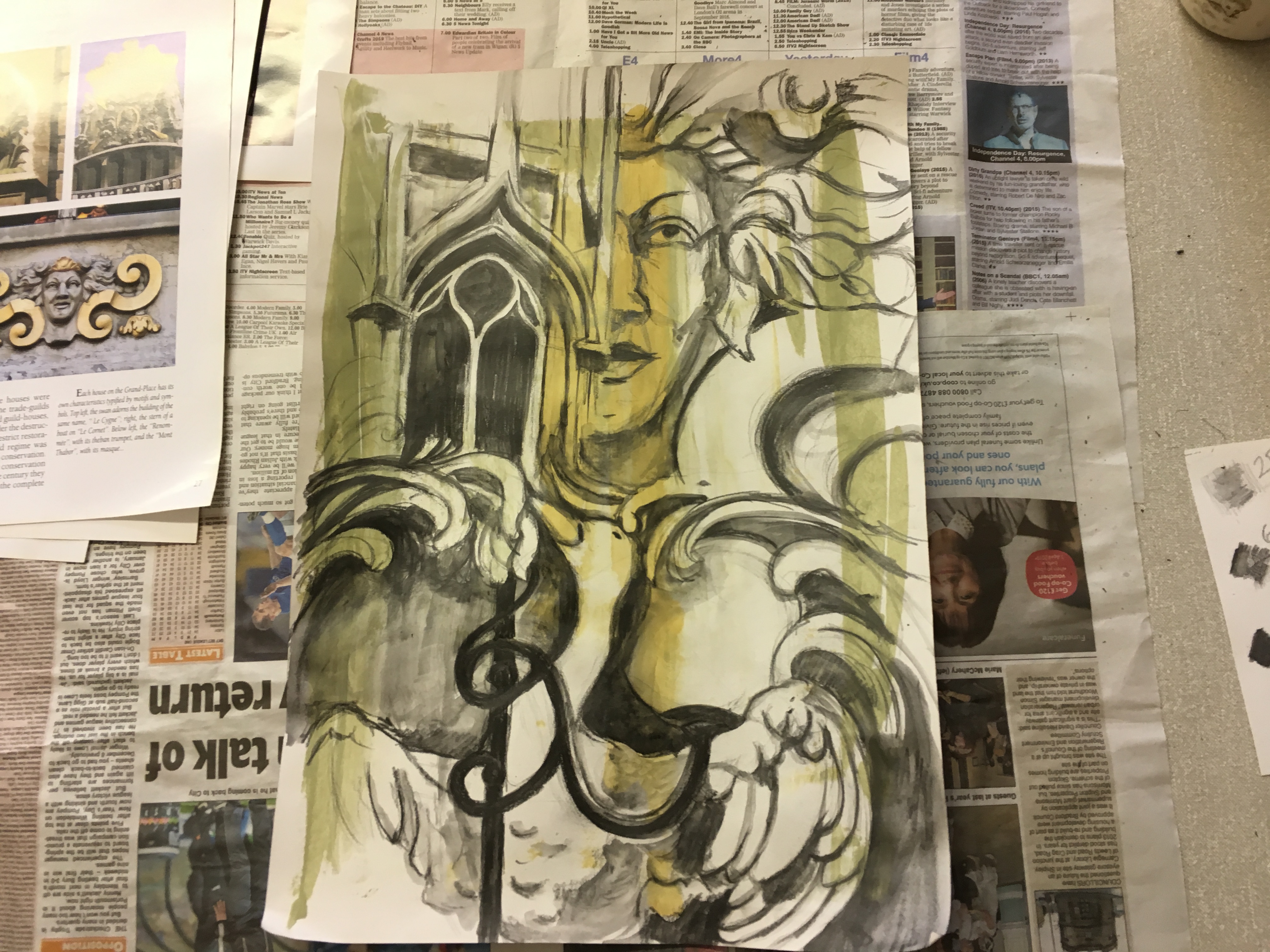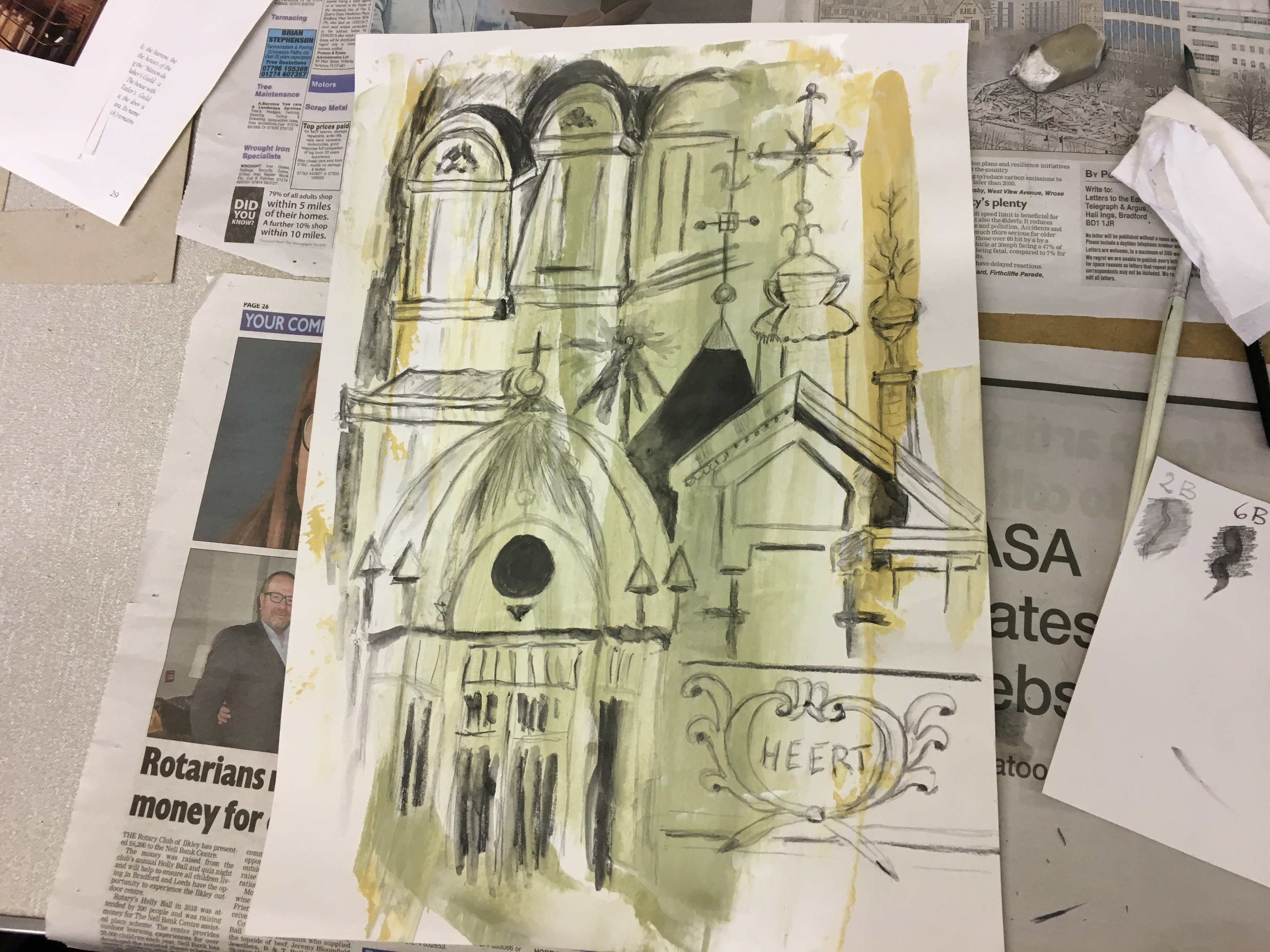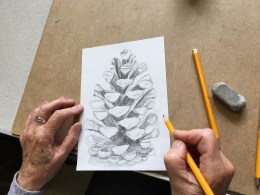 In the “Places” Beginners Mixed Media Course this week, we used images from the city of Brussels to put together these great studies in water-soluble graphite. The Beginners Drawing Course Level 2 faced “The Pinecone Challenge” and emerged triumphant! In the Beginners Watercolour Painting Course 2 we combined all the techniques we have practiced so far to produce these colourful paintings of pencils.