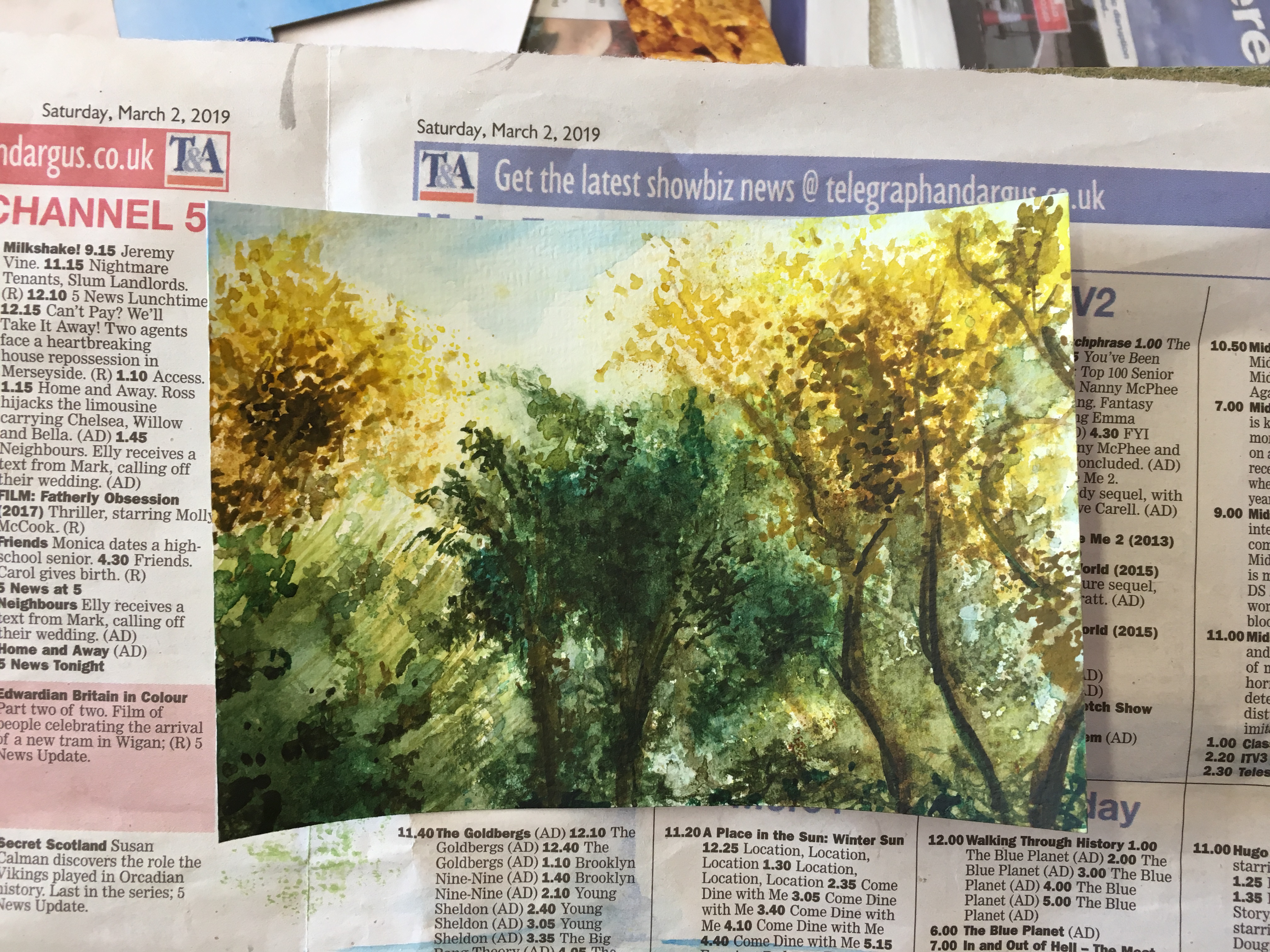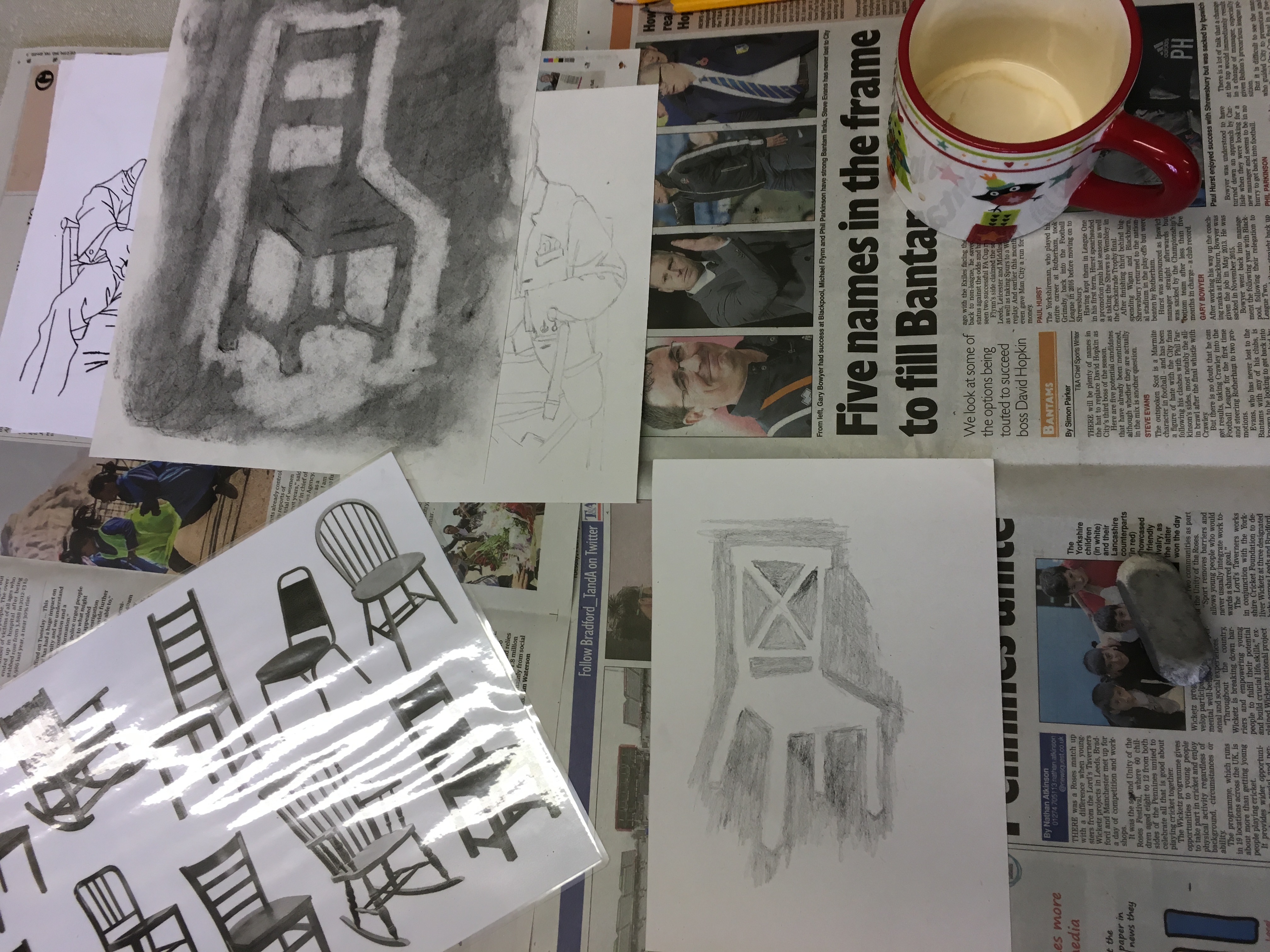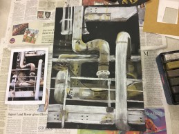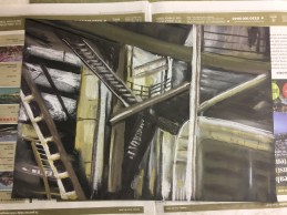 This week the “Places” Beginners Mixed Media Course used charcoal blocks to create these industrial images. It’s a pretty messy process but worth it for such striking results. In the Beginners Drawing Course Level 2 we tried a few different exercises to help us to draw what we actually see and also to think about “negative space”. The Beginners Watercolour Painting Course 2 experimented with different ways to paint landscapes using all the techniques we have covered so far.