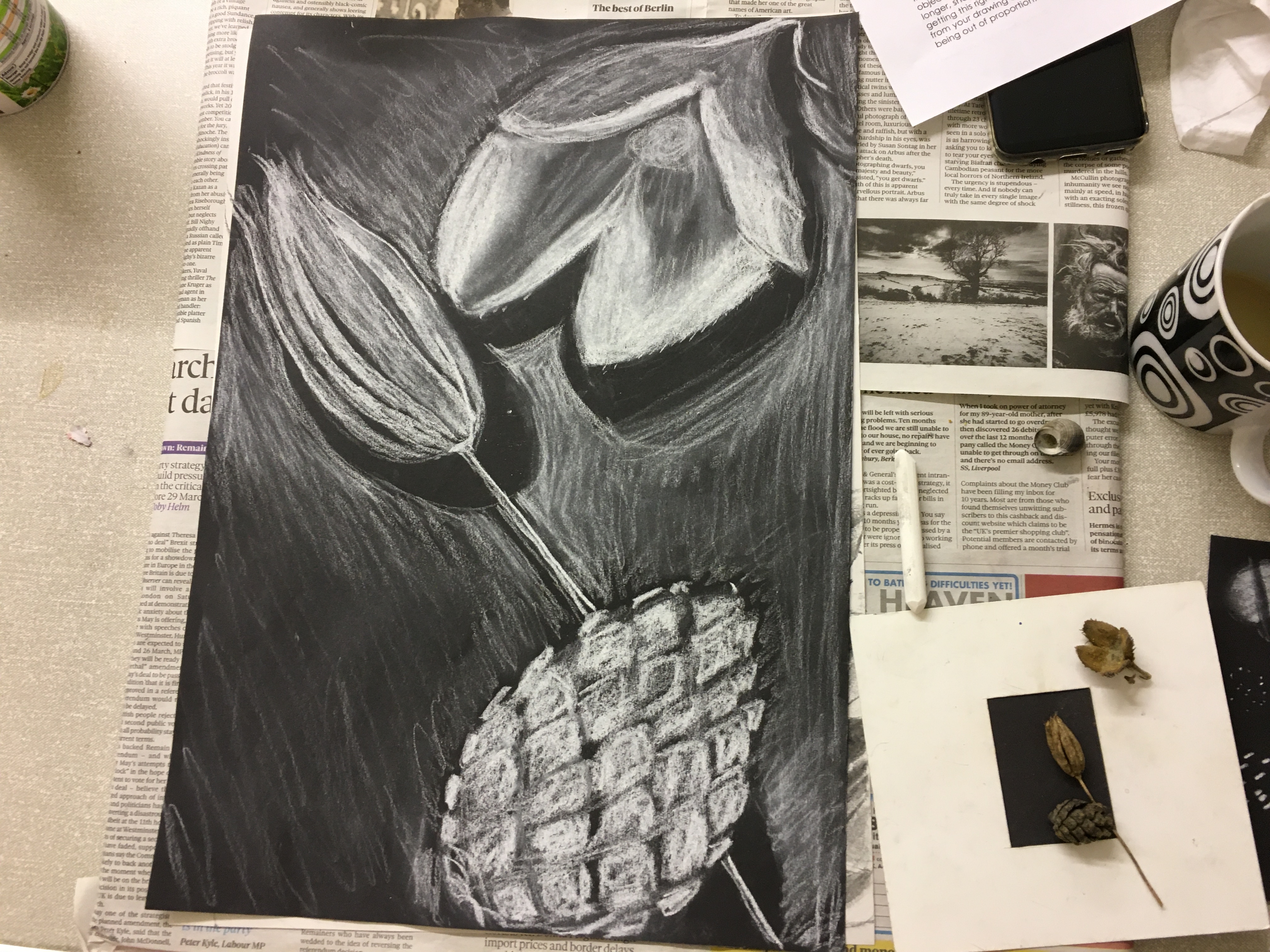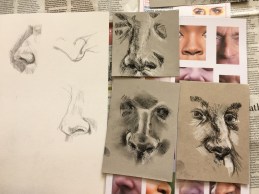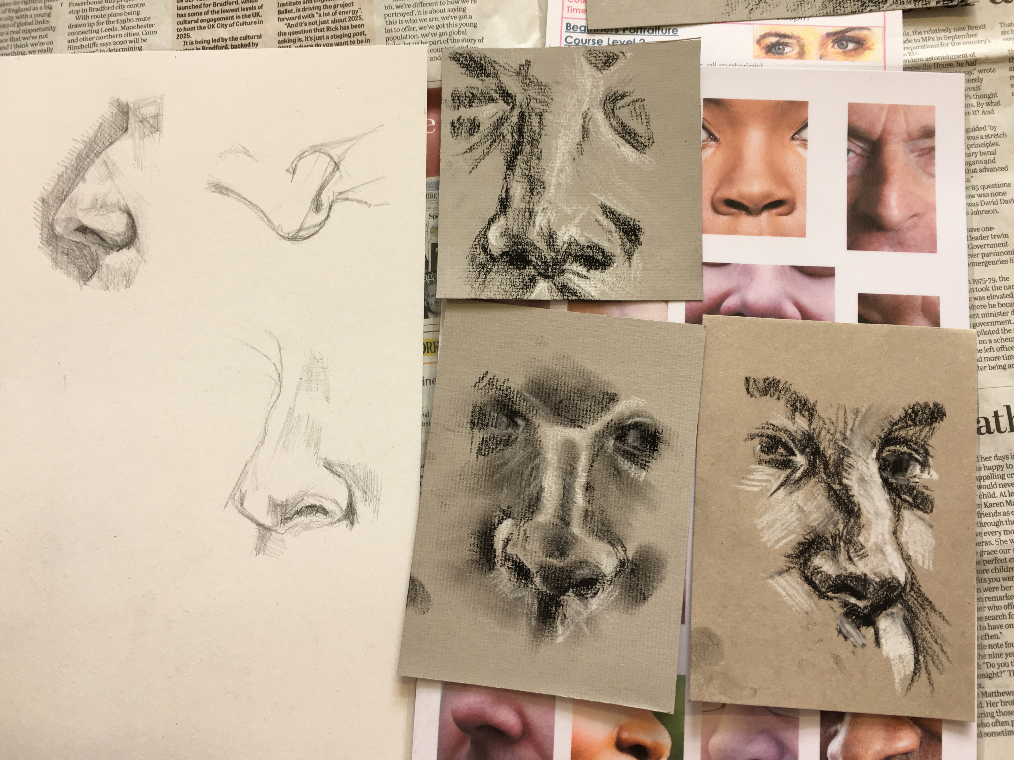 In the Beginners Birds Drawing Course this week we created pictures of Herons using collage torn from magazines.  The Beginners Drawing Course Level 1 looked at scale and how to create tone in these enlarged drawings of natural forms.  In the Beginners Portraiture Course Level 1 we used both pencil and soft pastel to show tone when drawing noses.  There were a few challenges to face in all the courses this week but you handled them brilliantly and you are all improving every week.  Keep it up!