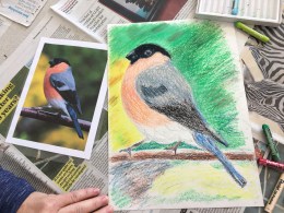 This week the Beginners Birds Drawing Course created these really colourful drawings of a Bullfinch using oil pastels. In the Beginners Drawing Course Level 1 we used a grid to help improve accuracy in both line and shading. The Beginners Portraiture Course Level 1 worked on eyes this week and produced some fantastic observation drawings.