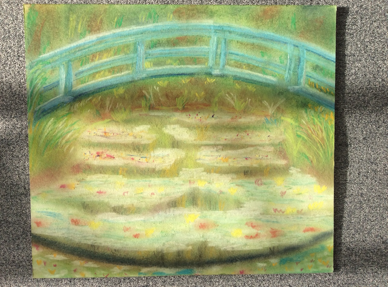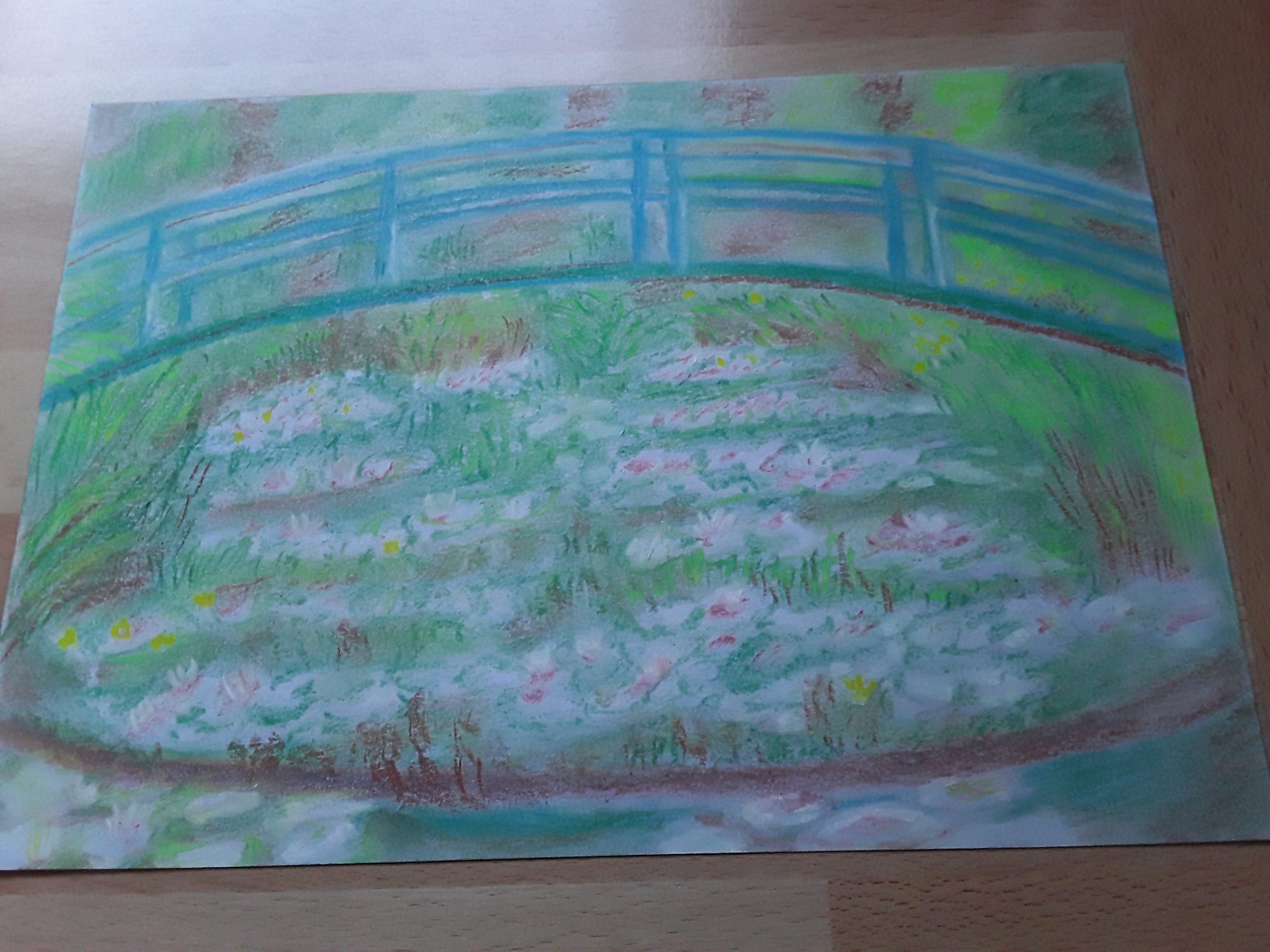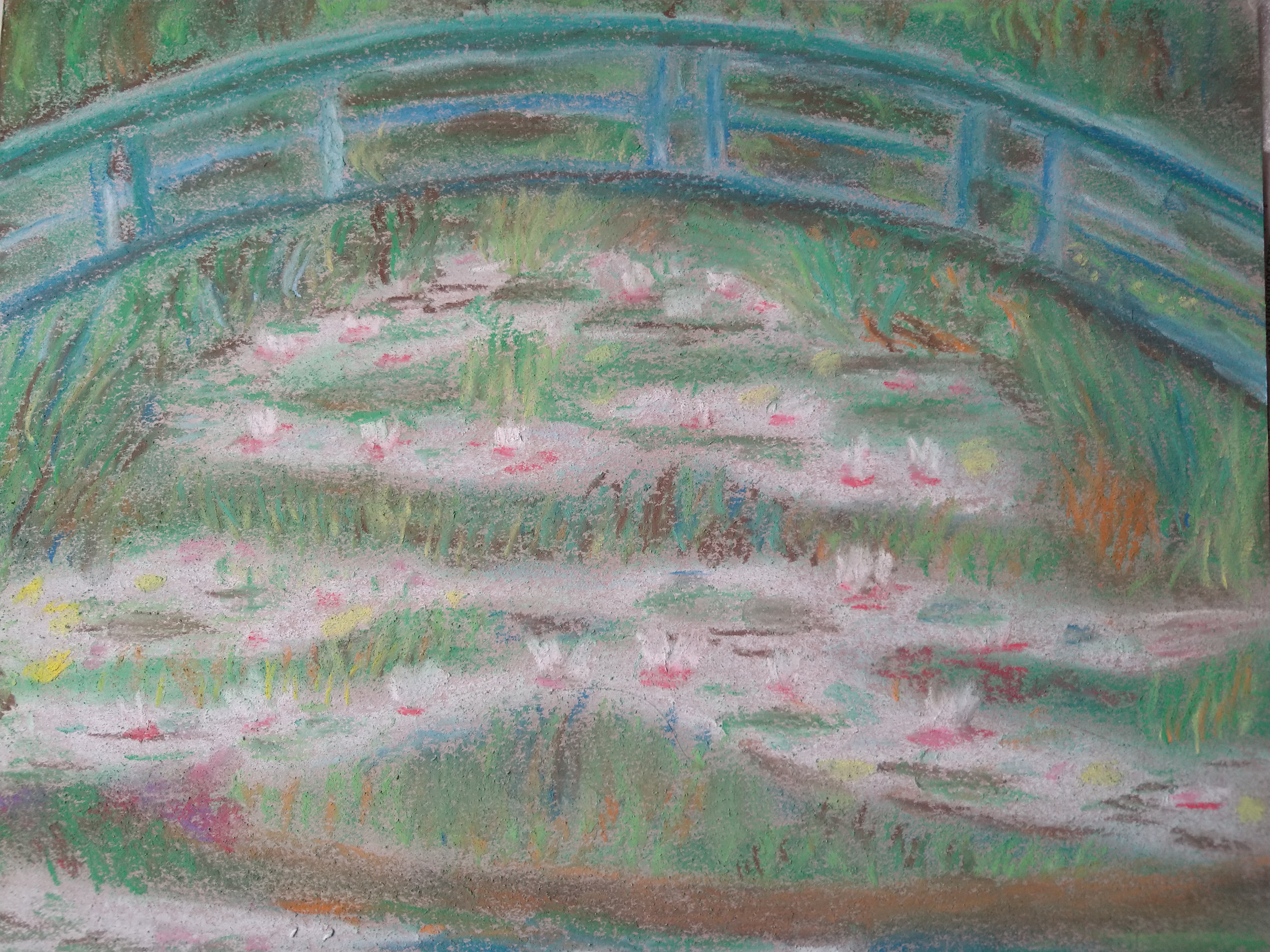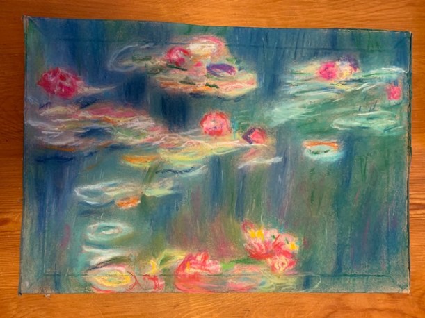 This week we took on soft pastels – possibly one of the messiest mediums but worth it! Monet’s classic “Japanese Footbridge” painting was our inspiration and gave us lots of scope for colour mixing and mark making. Great work everyone! Maybe we could even see some more of those pictures in……wait for it……the first EVER Leeds Art Group Virtual Exhibition!