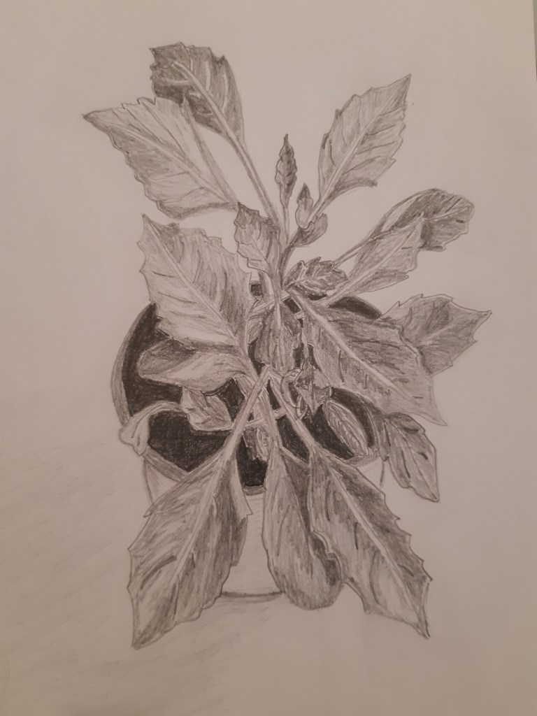 This week the “Inspired 4” course went all Art Deco with these paintings based on the work of Tamara de Lempicka from the 1920s/1930s. A tough task but a great way to practice blending from one tone to another. The “Pencil and Paper 2” course used plants as their subject and focused on observing how leaves overlapping can create different shapes and tones.