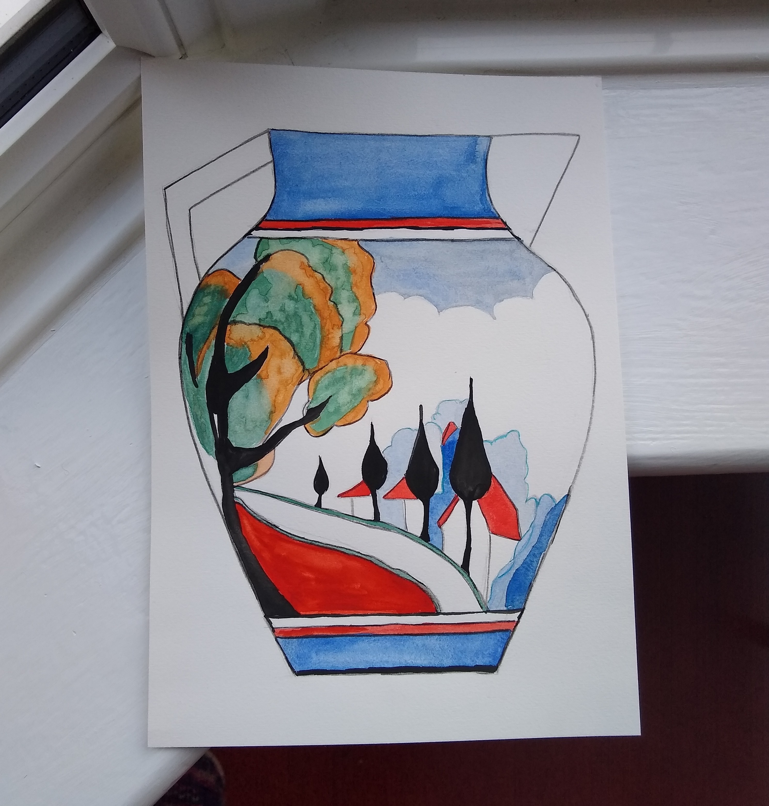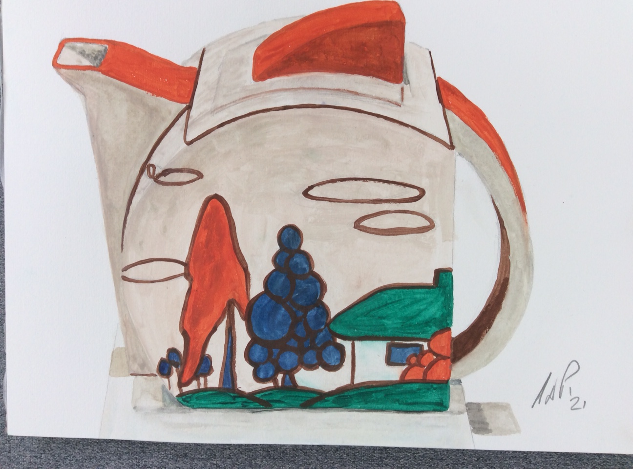 Nice to see you all again after our week off. I’ve really enjoyed all the beautiful photos you’ve been sending me this week. In the “Inspired 4” course we continued the Art Deco theme but in a very different way with these colourful watercolour paintings based on Clarice Cliff pottery. In the “Pencil and Paper 2” course we looked at different types of fastenings and used tone to create the impression of overlapping.