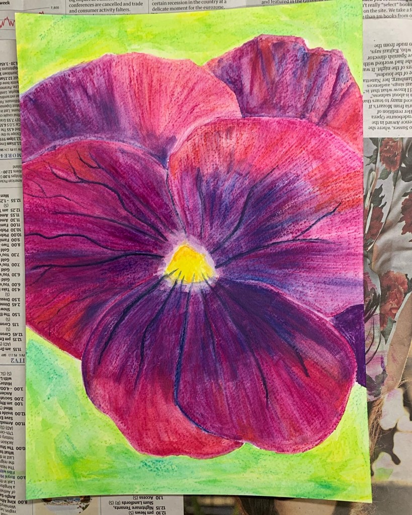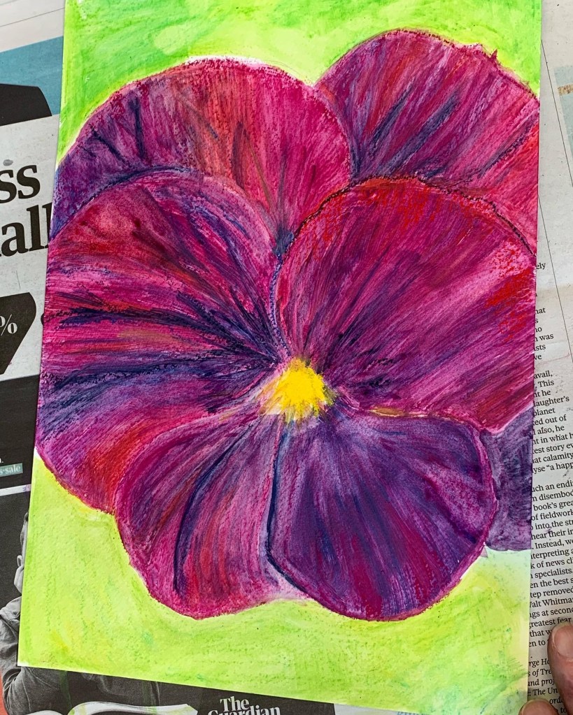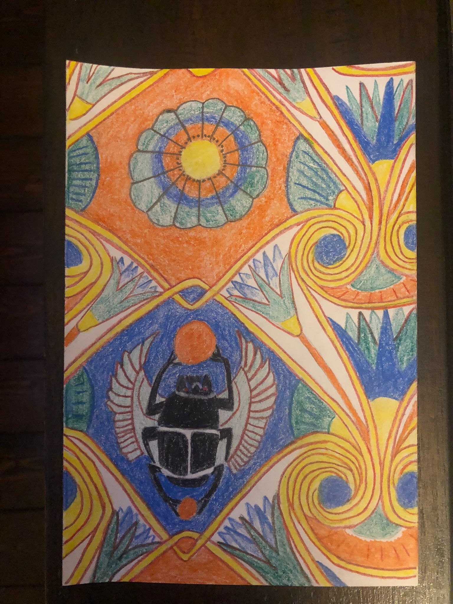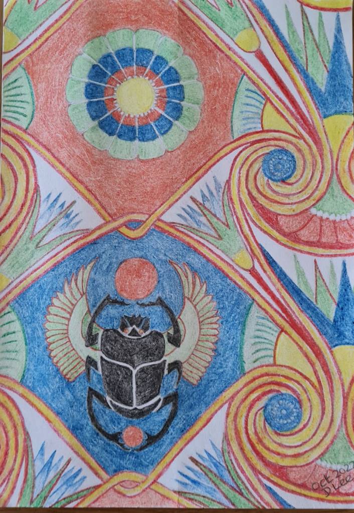 In week 3 of the “Flowers” Beginners Mixed Media Course we had a good hit of colour by using Derwent Inktense blocks to create these Pansy paintings. There’s definitely something a bit magical about how the colour goes on as a crayon and then you add water to turn it into paint. Thoroughly enjoyable! The task for the “Inspired 7” Online Beginners Art Course was quite the opposite. Creating these Egyptian style patterns was all about precision and accuracy, making sure the drawing was just right before adding the colour. A tricky one but you exceeded my expectations yet again. Fantastic work everyone, Well done.