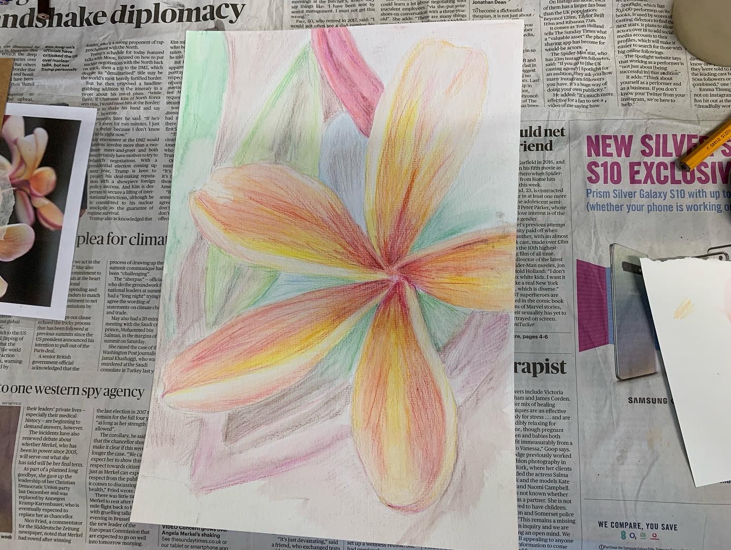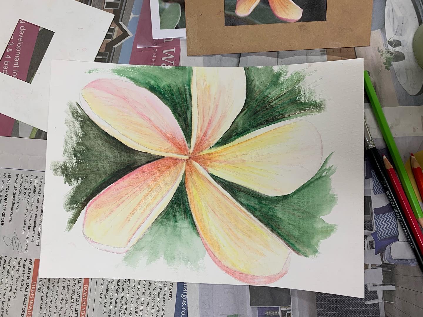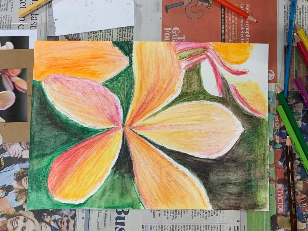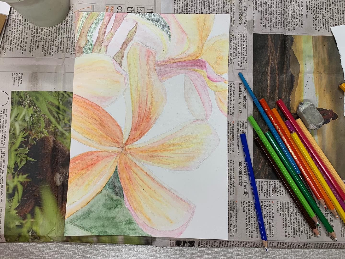 This week in the “Flowers” Beginners Mixed Media Course we created these beautiful paintings of Plumeria flowers using watercolour pencils. The pencils can be used lightly for soft pastel tones but also with more pressure for intense areas of colour. Fantastic work everyone!