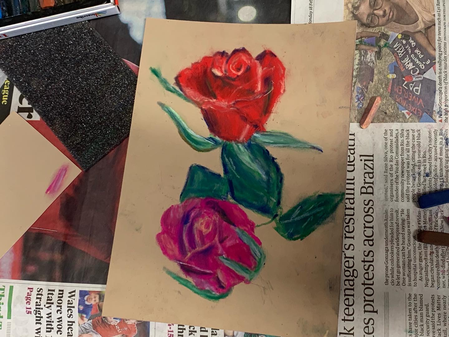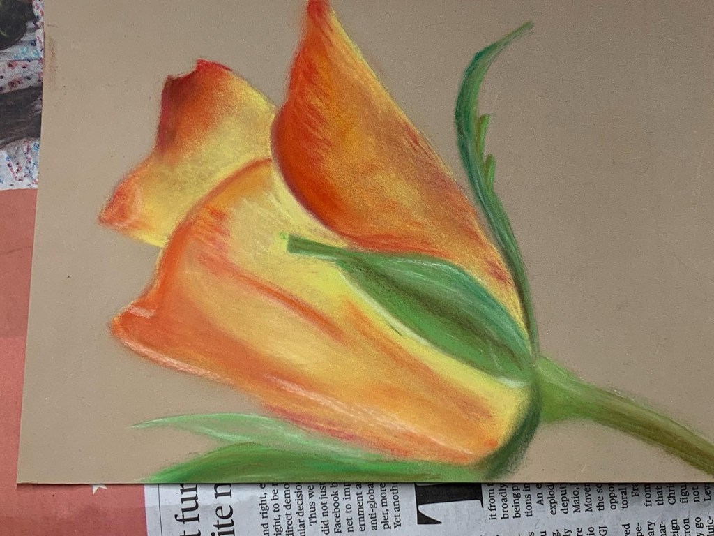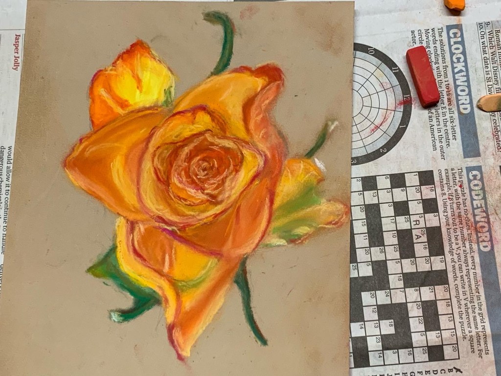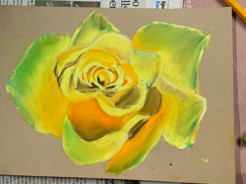 In our final week of the “Flowers” Beginners Mixed Media Course we drew roses using soft pastels on Pastelmat paper and this time we were drawing from life rather than from a photograph. It’s a slightly different experience drawing from an actual object rather than a photograph. You have to make more of the decisions yourself regarding composition and scale and you have to really pay attention to your viewpoint and keep it consistent. So you were all working a bit more independently in this lesson but you were definitely ready for it as you can see from the pictures below. Brilliant work everyone and a great way to finish the course.