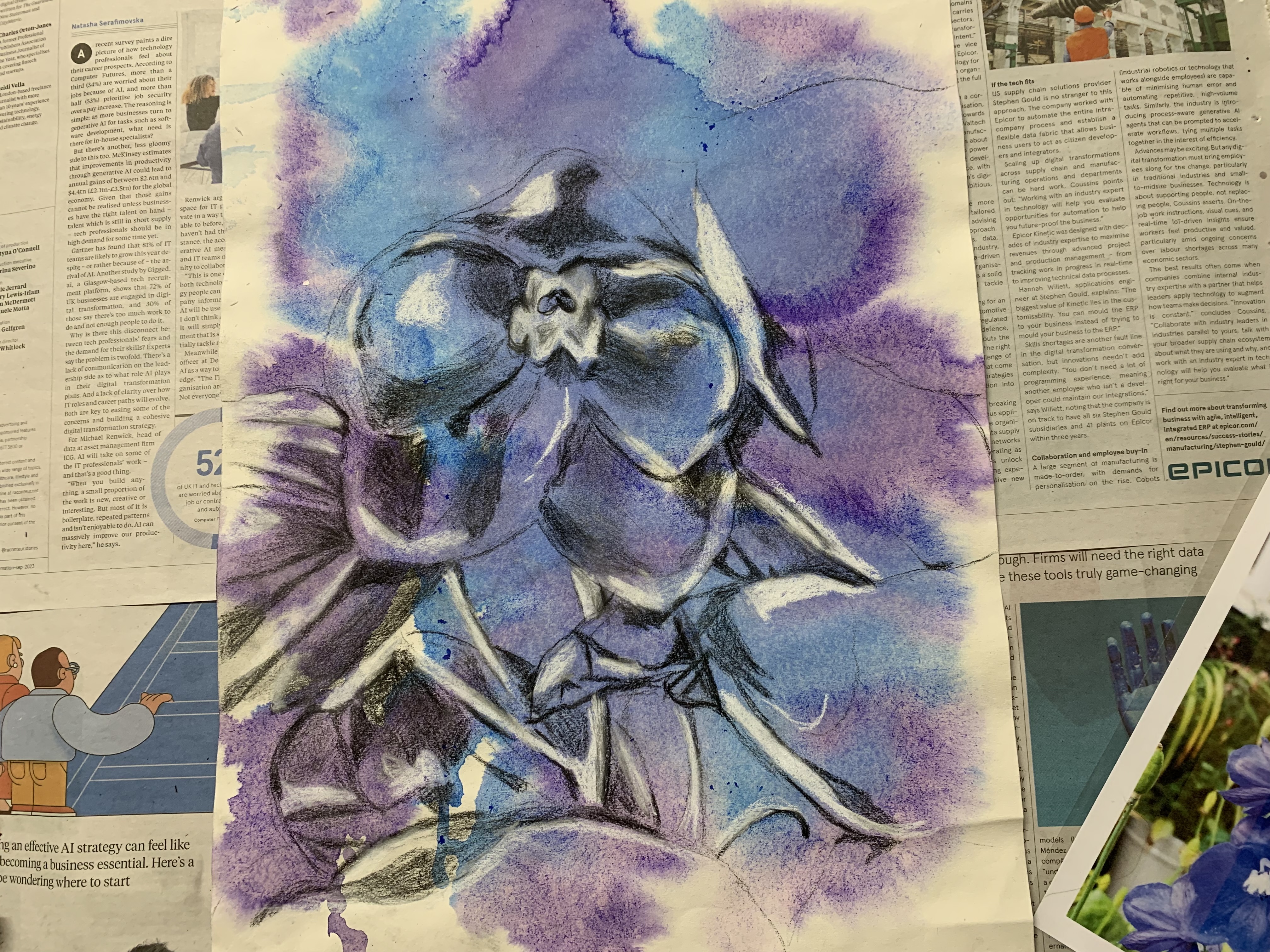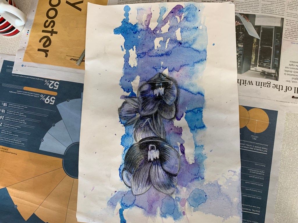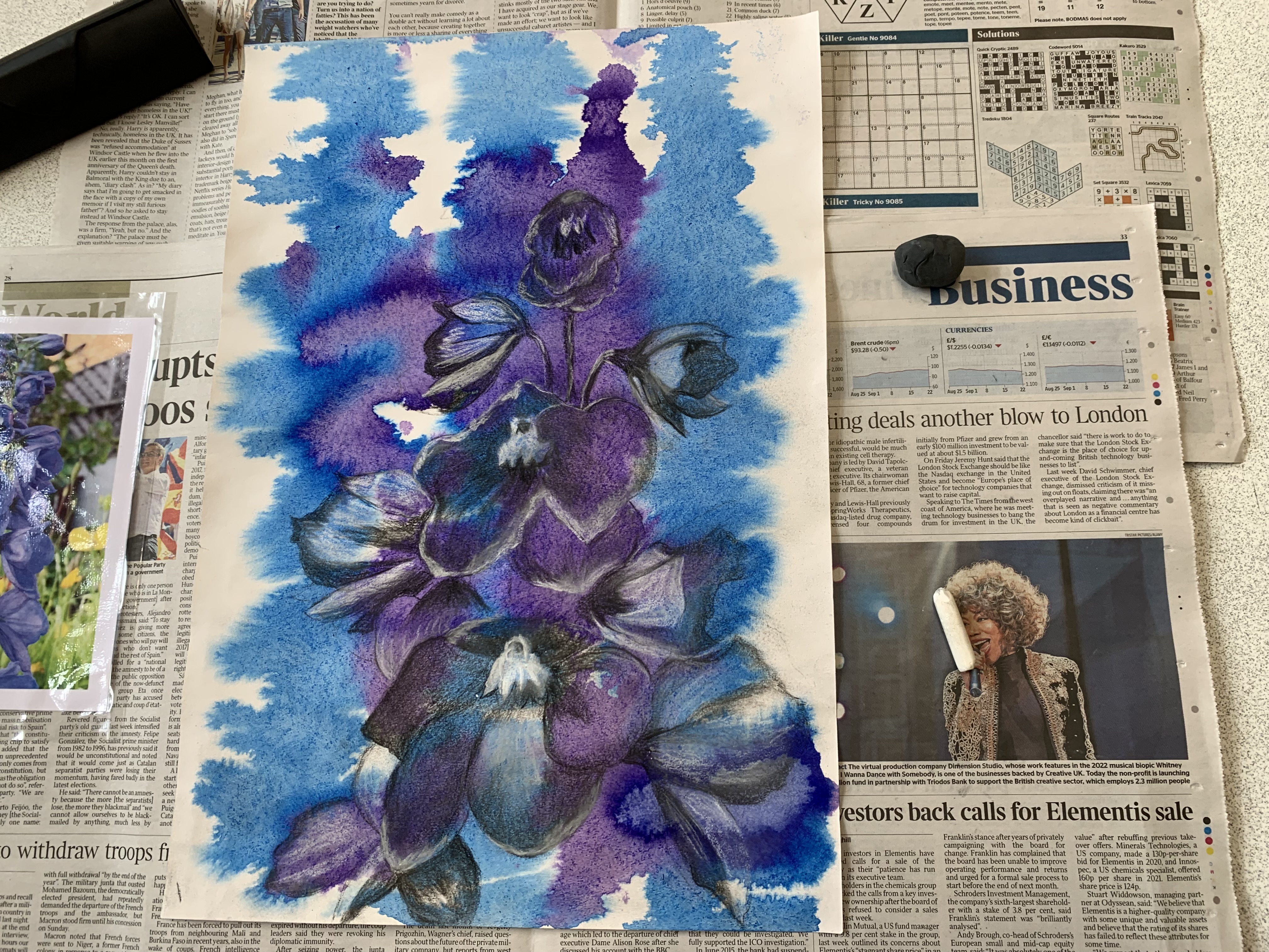Building on the work we did last week on tone, the “Flowers 2 Beginners Mixed Media Course” used charcoal pencil this time along with white chalk for the highlights. The tonal drawings of Delphiniums looked fantastic against the coloured background. Great work, keep it up!