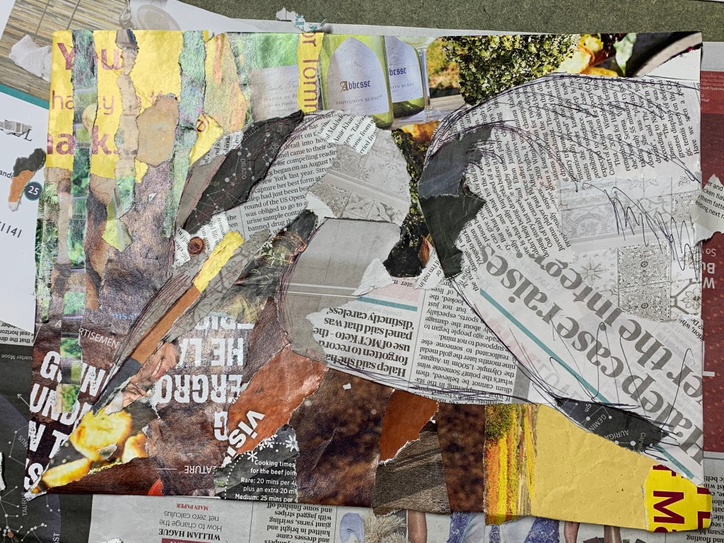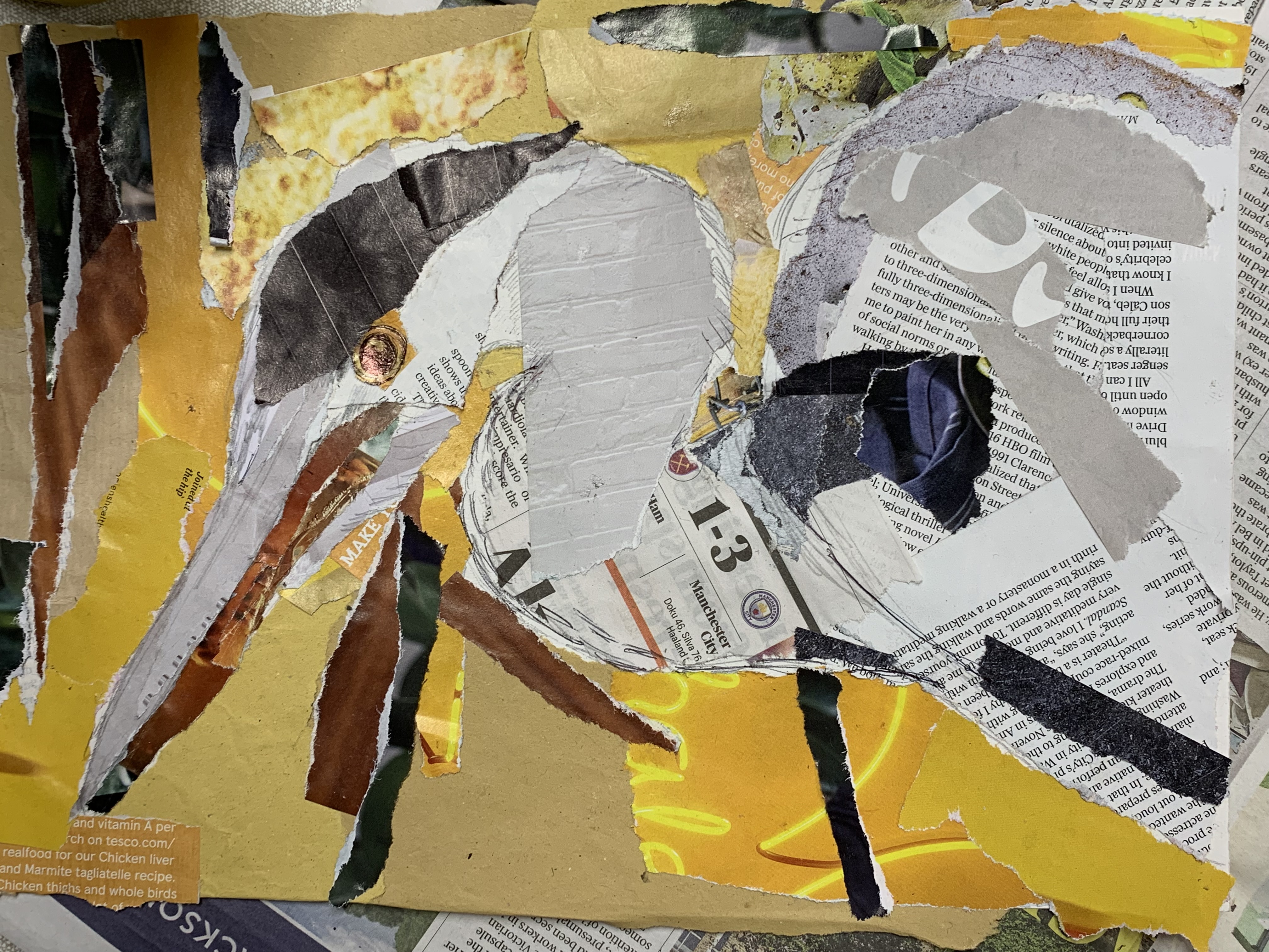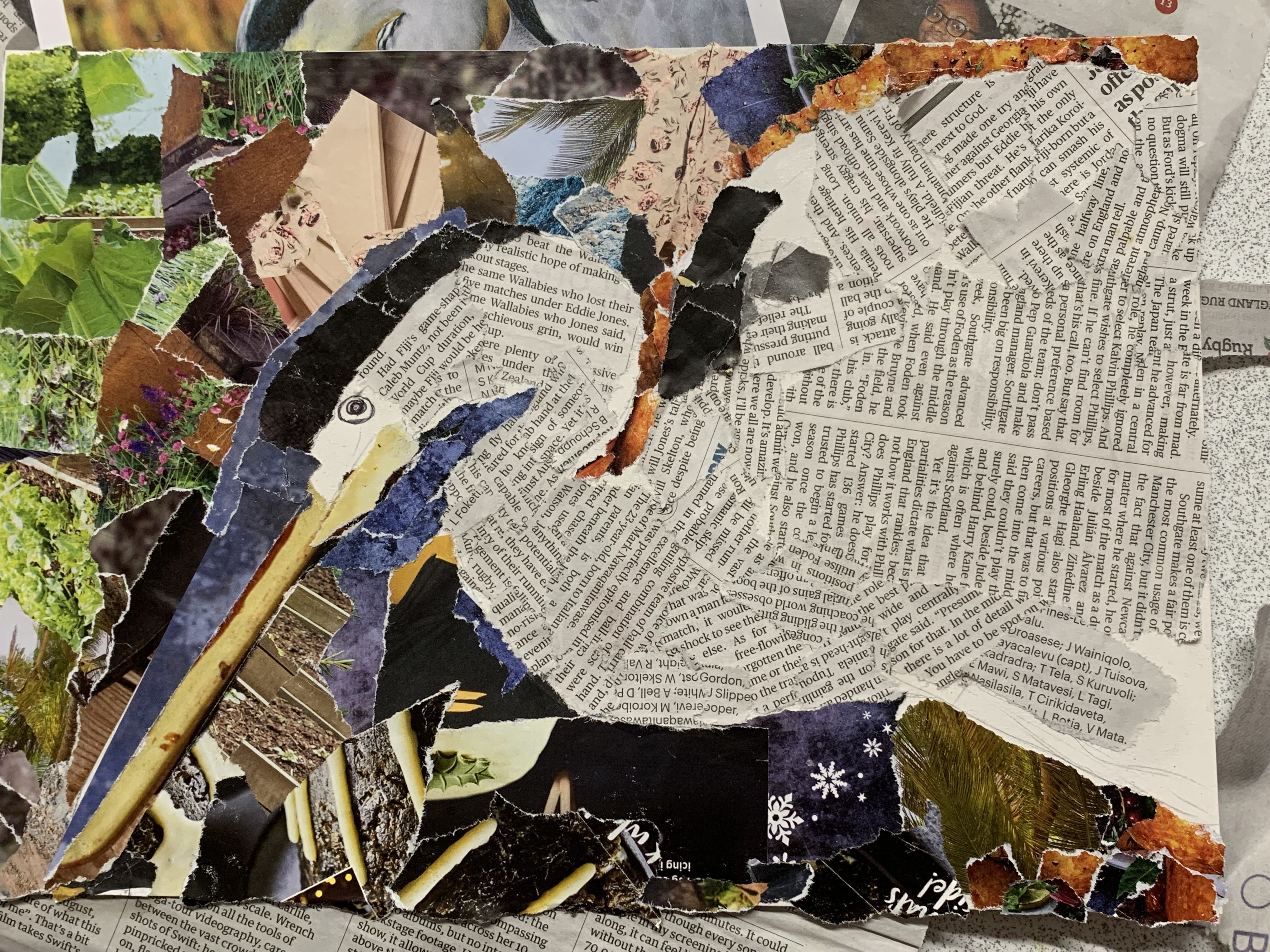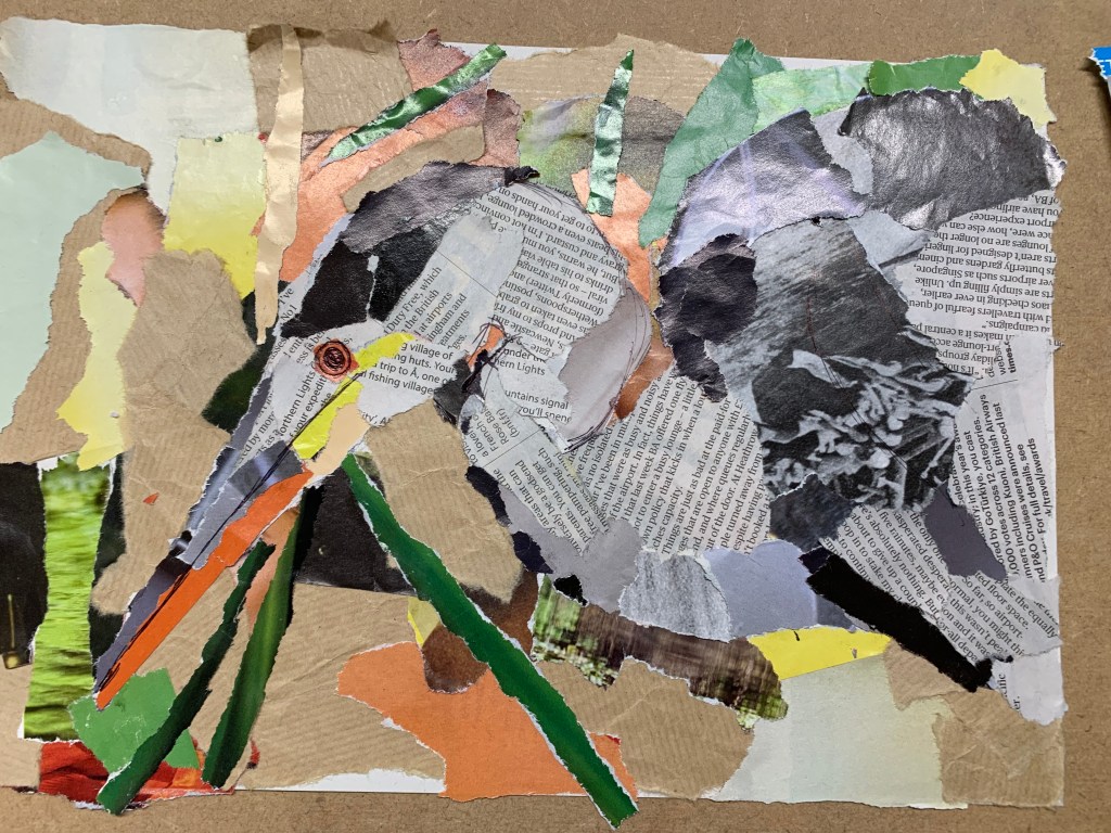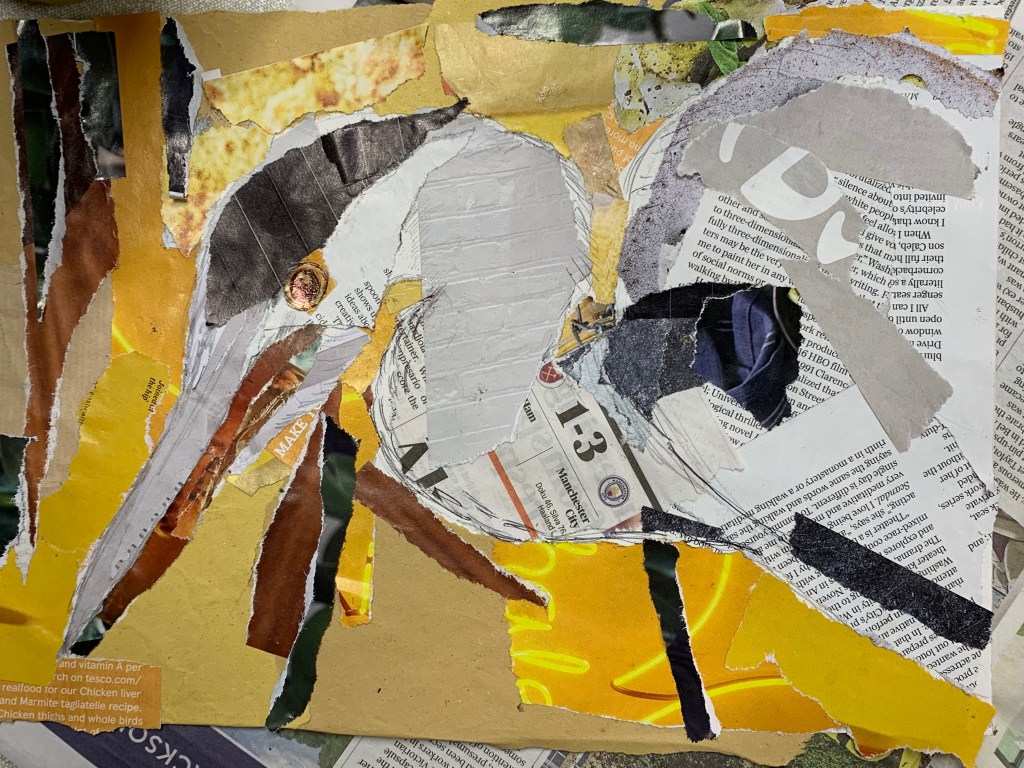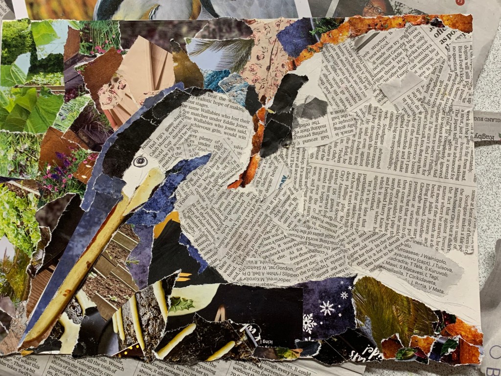 This week it was the Heron’s turn to be our subject. We all got very messy with bits of magazine collage and glue. Worth all the mess though as it’s a really effective technique and quite engrossing to do. If we’d had a bit more time we could have added some more detail and tone with black biro. You can always finish them later at home. Hope you all enjoyed it.