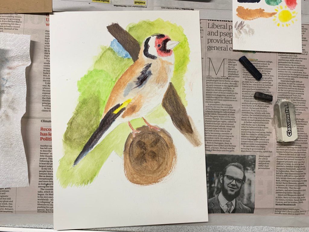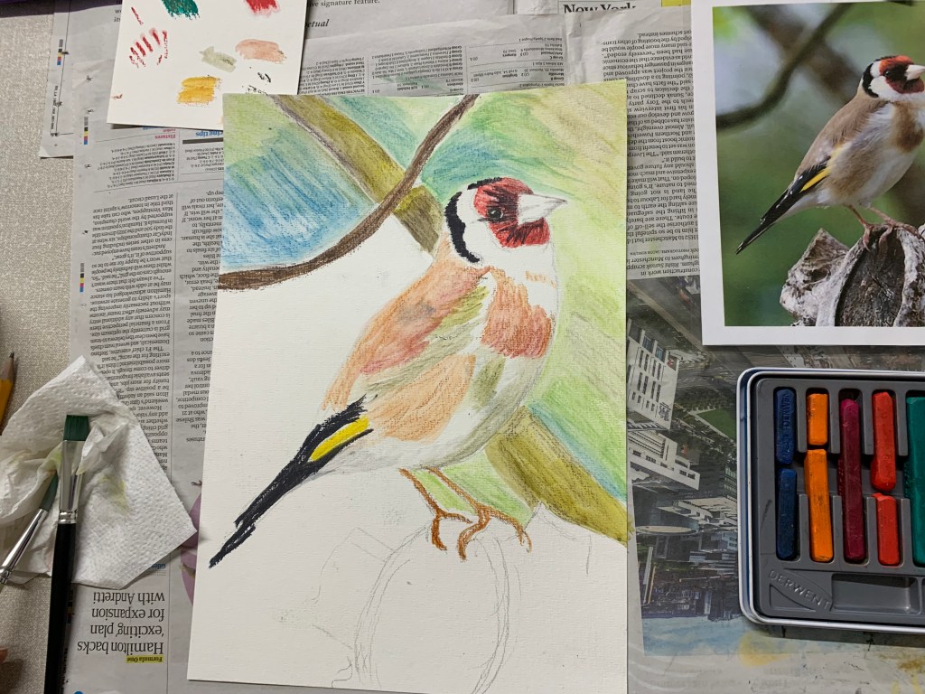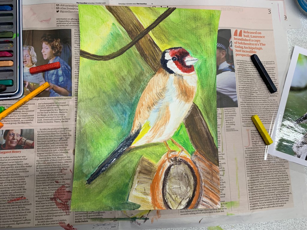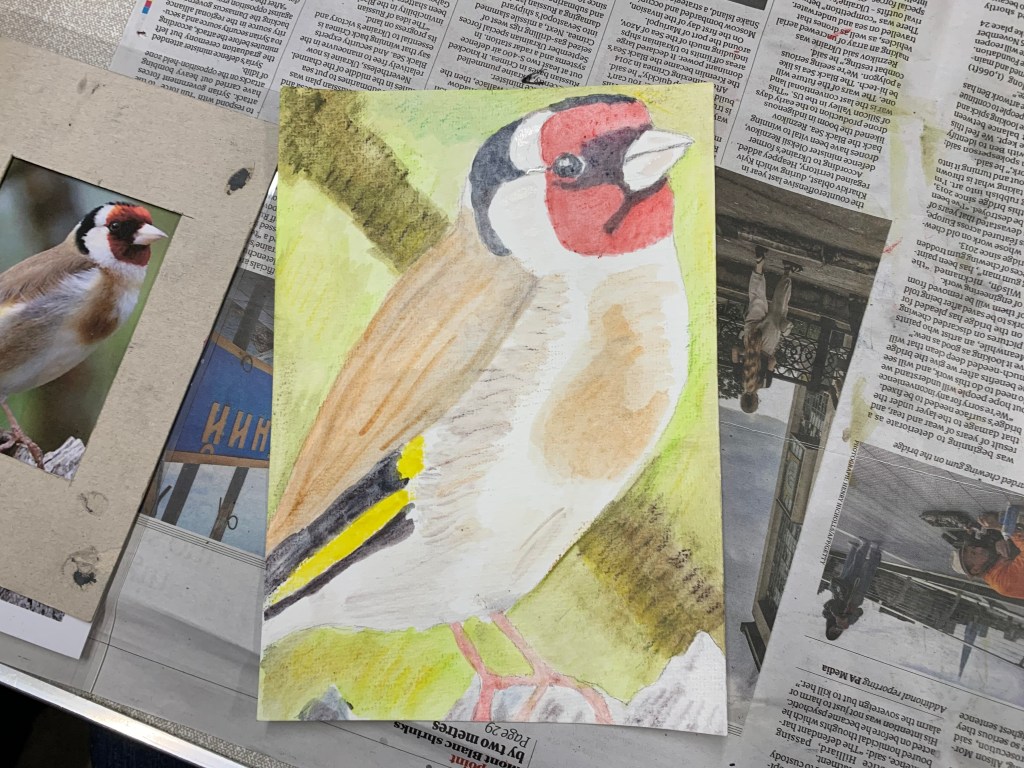 For our final lesson in the Beginners Birds Drawing Course we painted these glorious goldfinches using Derwent Inktense Blocks. Quite a difficult medium to master I think but a lot of fun. Thanks to everyone who has attended this term and well done on producing such great work every week no matter what challenges I threw at you.