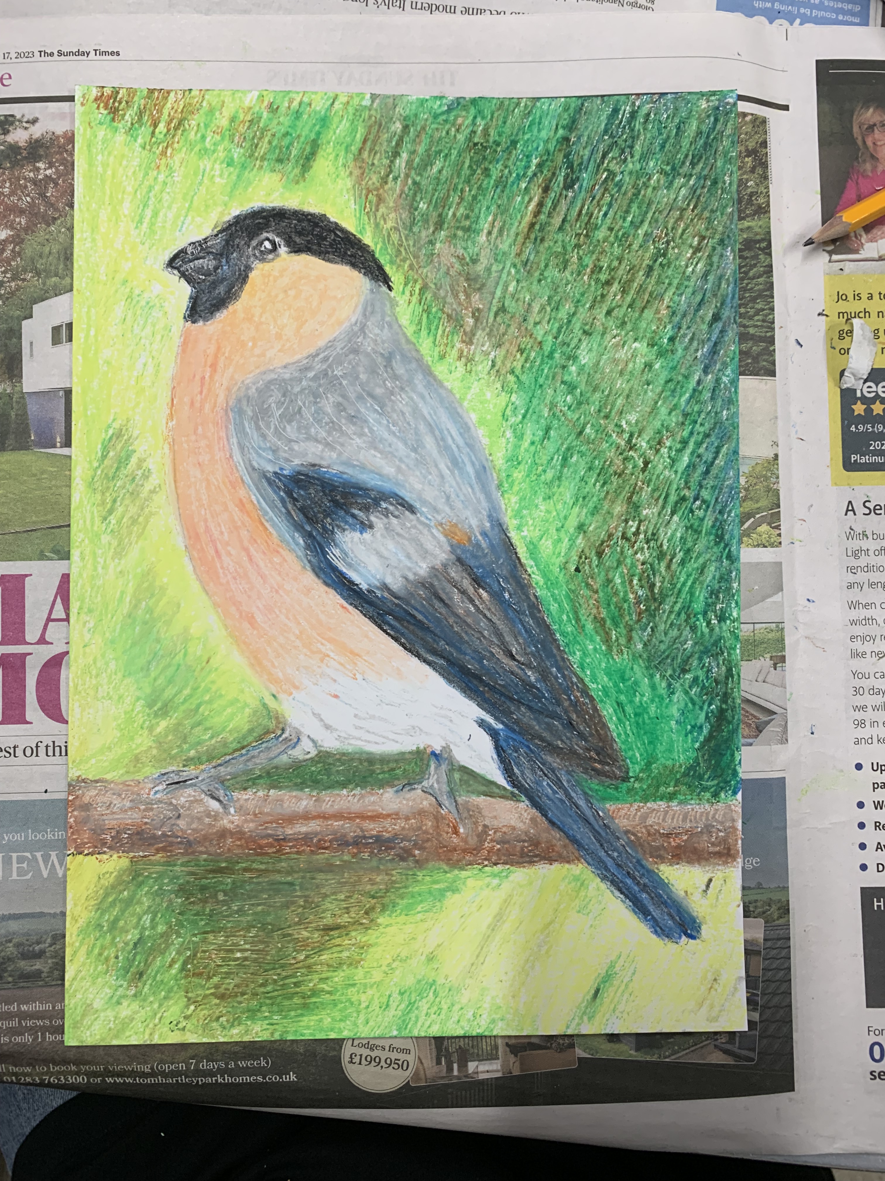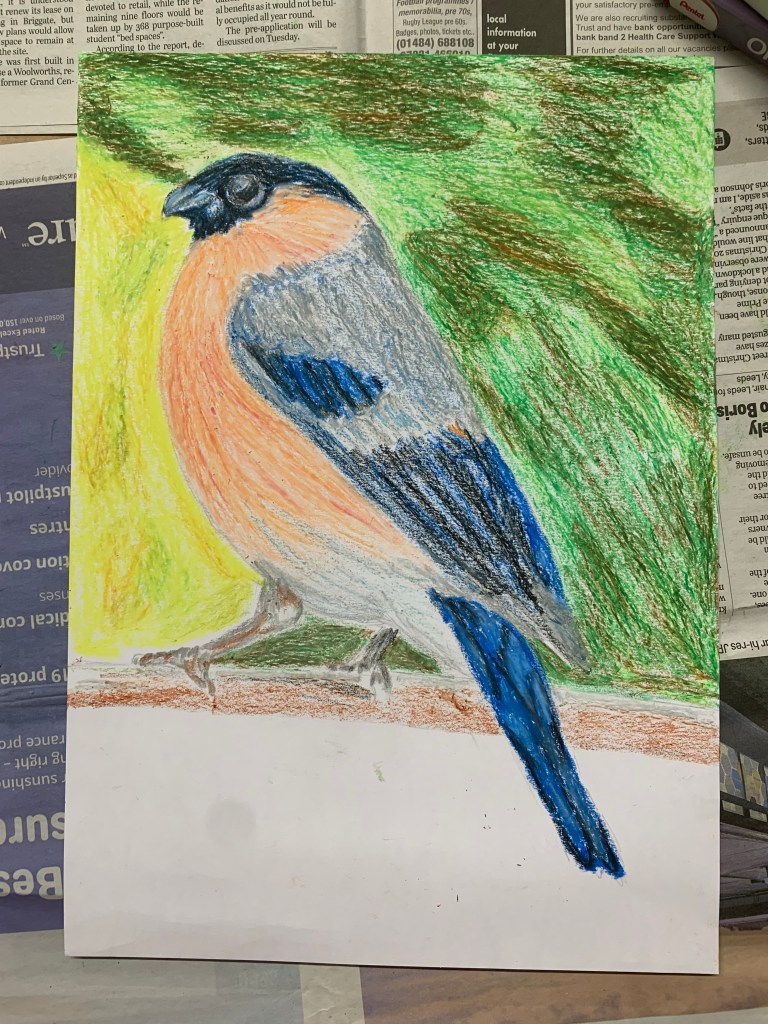 This week we drew these beautiful bullfinches using oil pastel. We focused a lot on colour mixing especially in the background and the grey feathers of the bird, only using black where we really needed it. Great work everyone!