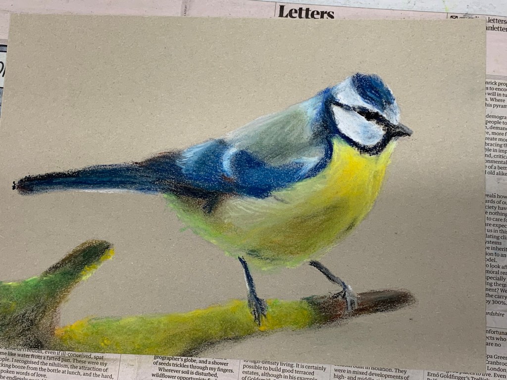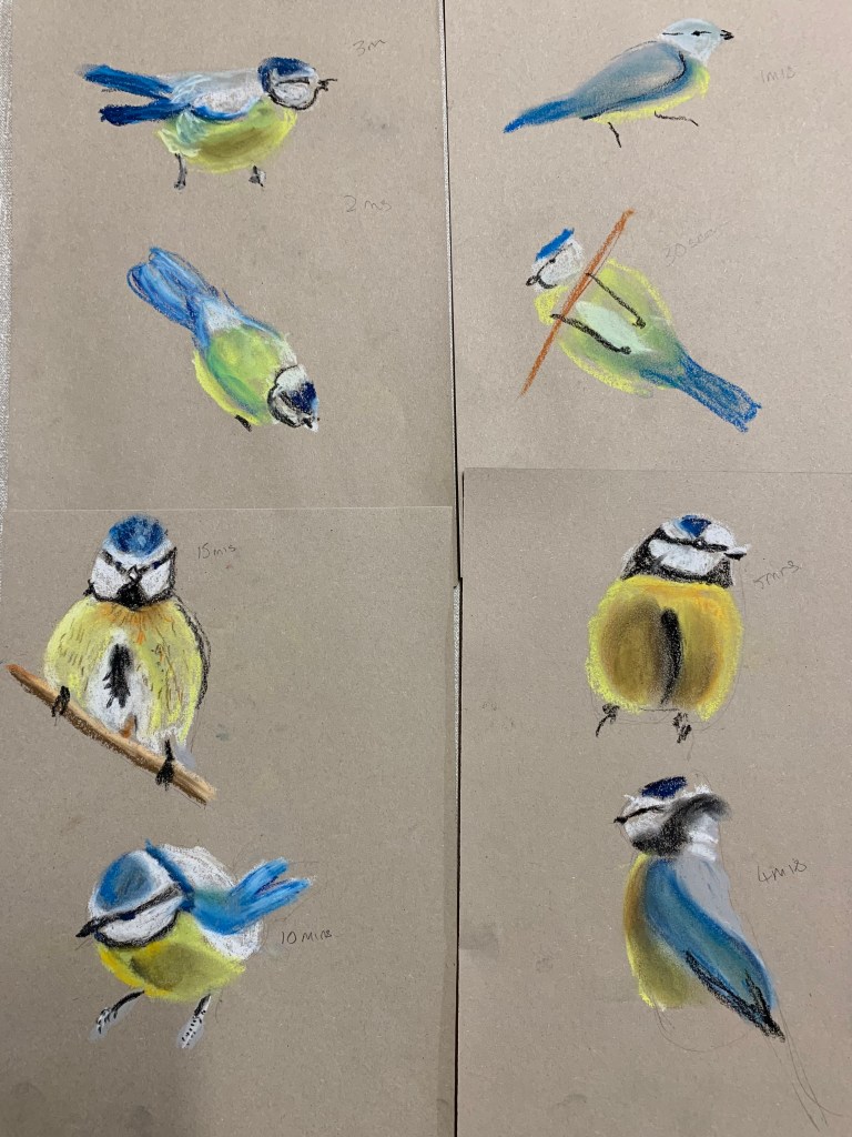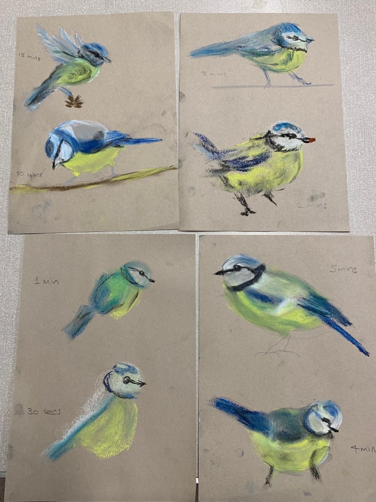 This week we tried something a bit different and did some timed drawings of Blue Tits ranging from 15 minutes to 30 seconds, followed by a longer drawing. This helps to train us into making quick decisions about the most important aspects of the drawing. Soft pastel was perfect for making quick marks and smudges of colour. Great work everyone! Well done.