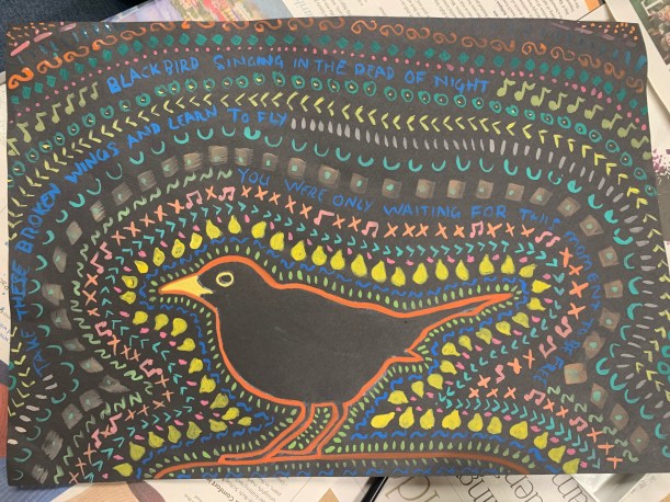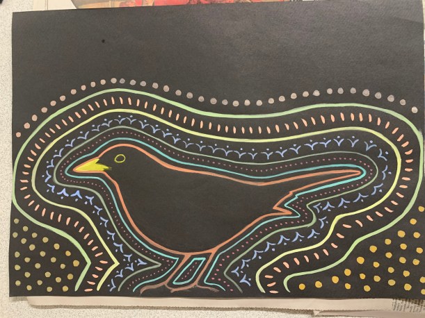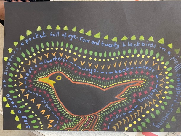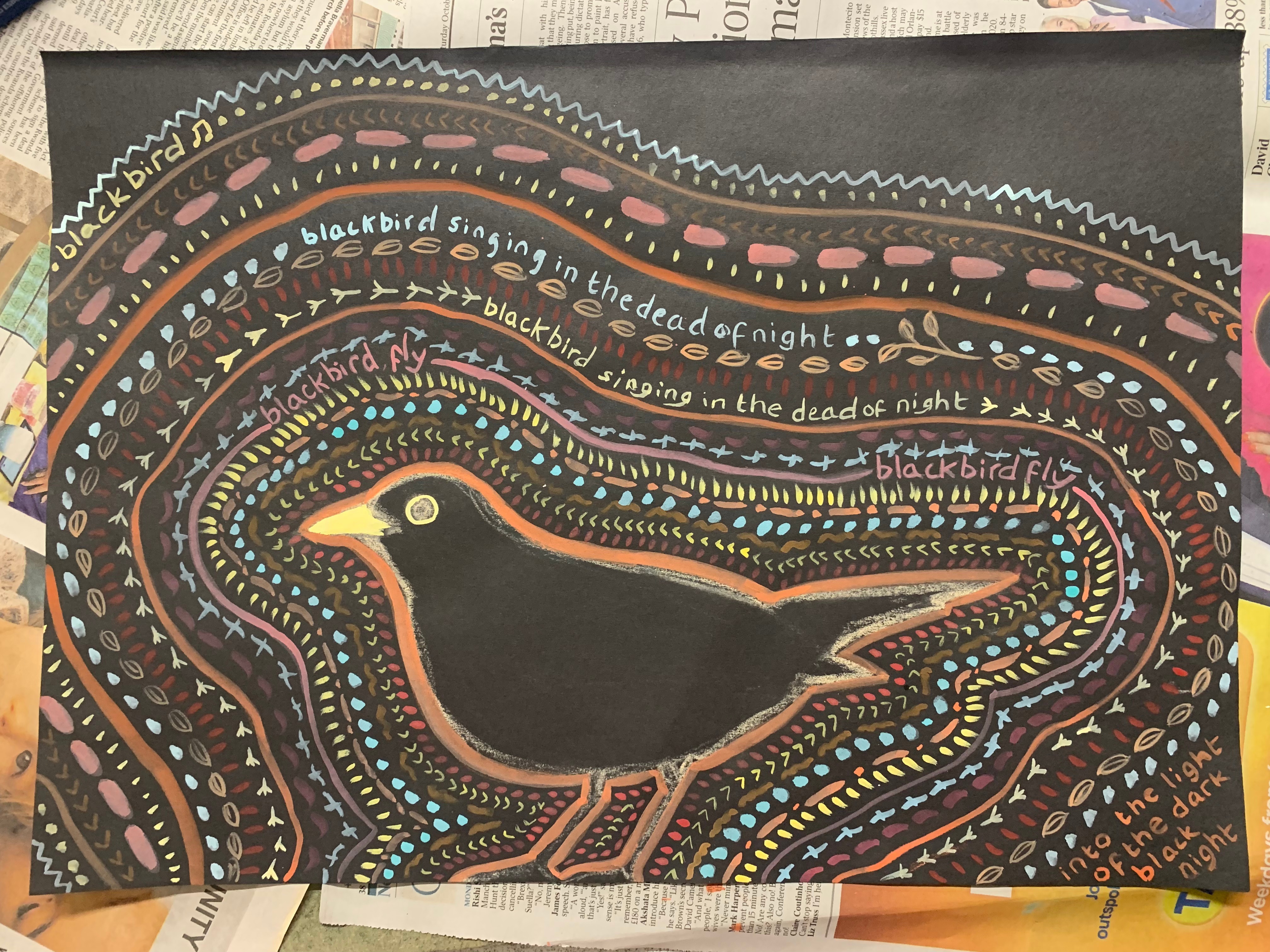 So how do we paint a blackbird on black paper? We fill the rest of the paper with colour of course! We used watercolour paint to create the patterns in the background and added white gouache paint to each colour to make it more opaque so that it stands out against the black. We all chilled out and got a bit zen painting these patterns. Sometimes it’s nice to just go with the flow and paint whatever comes to you.😁